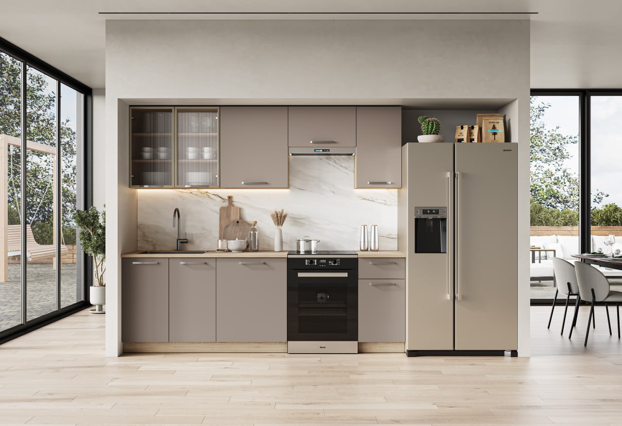 lenght of the set 240, gas lifts, high upper cabinets, worktop thick. 28 mm, colors: fronts – cashmere, body – cashmere, worktop – sonoma oak