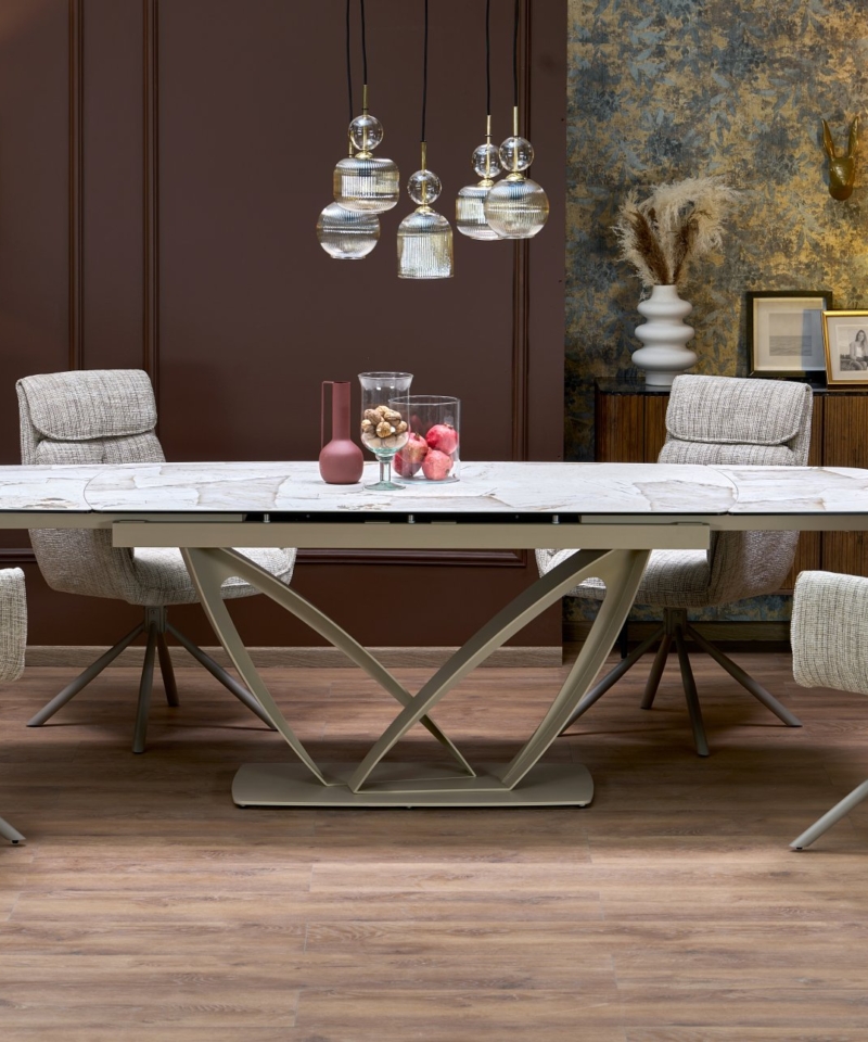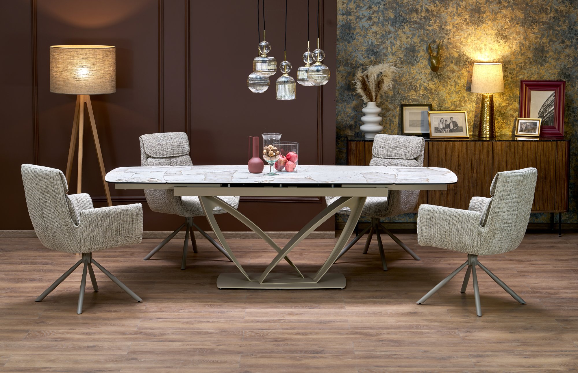 dimensions: 160-240/90/77 cm, extension table, material: ceramic / glass / powder coated steel, color: top – beige marble, legs – cashmere