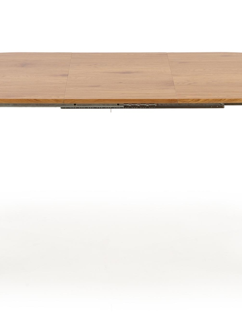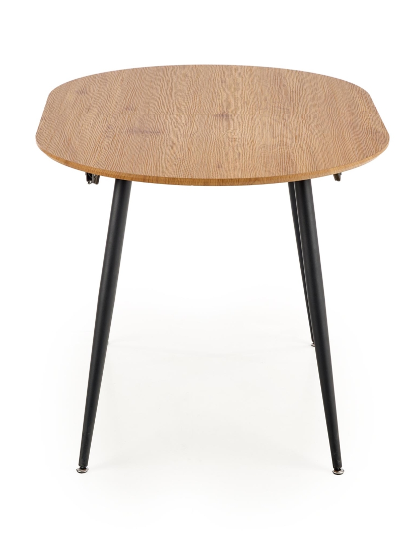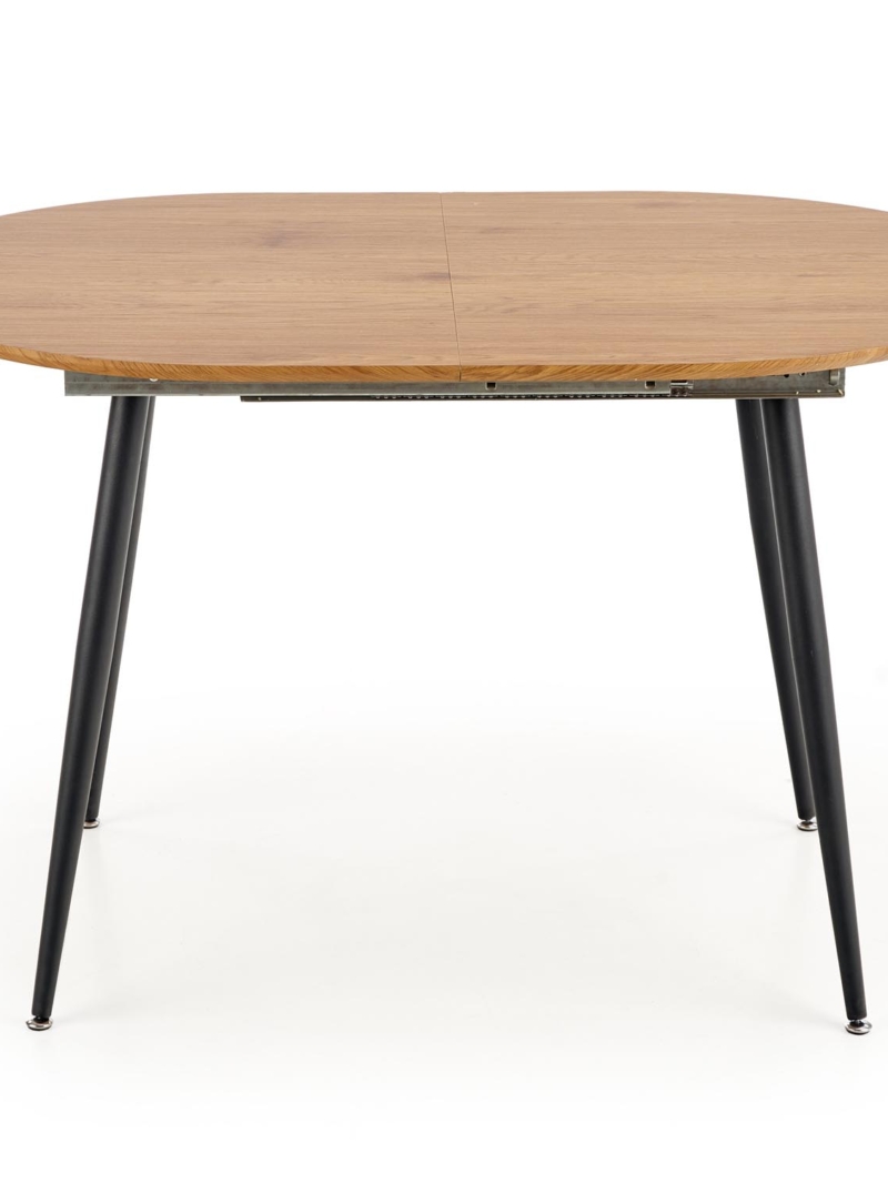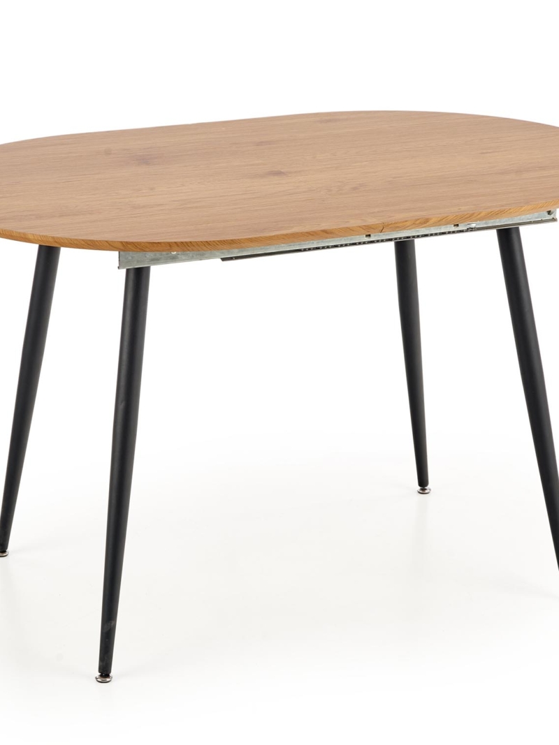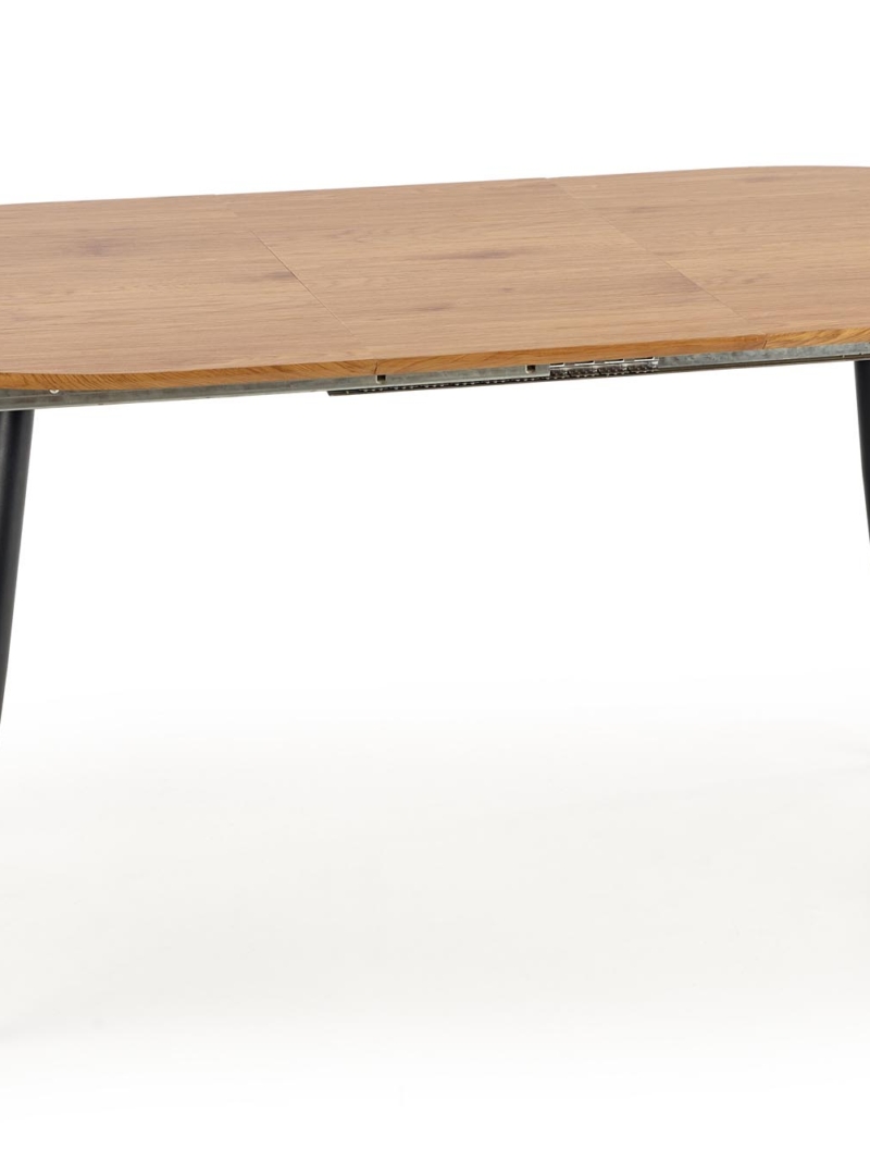 dimensions: 120-160/80/74 cm, extension table, material: laminated MDF / powder coated steel, color: top – golden oak, legs – black