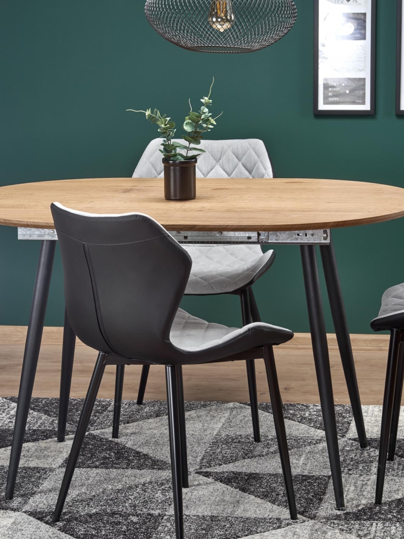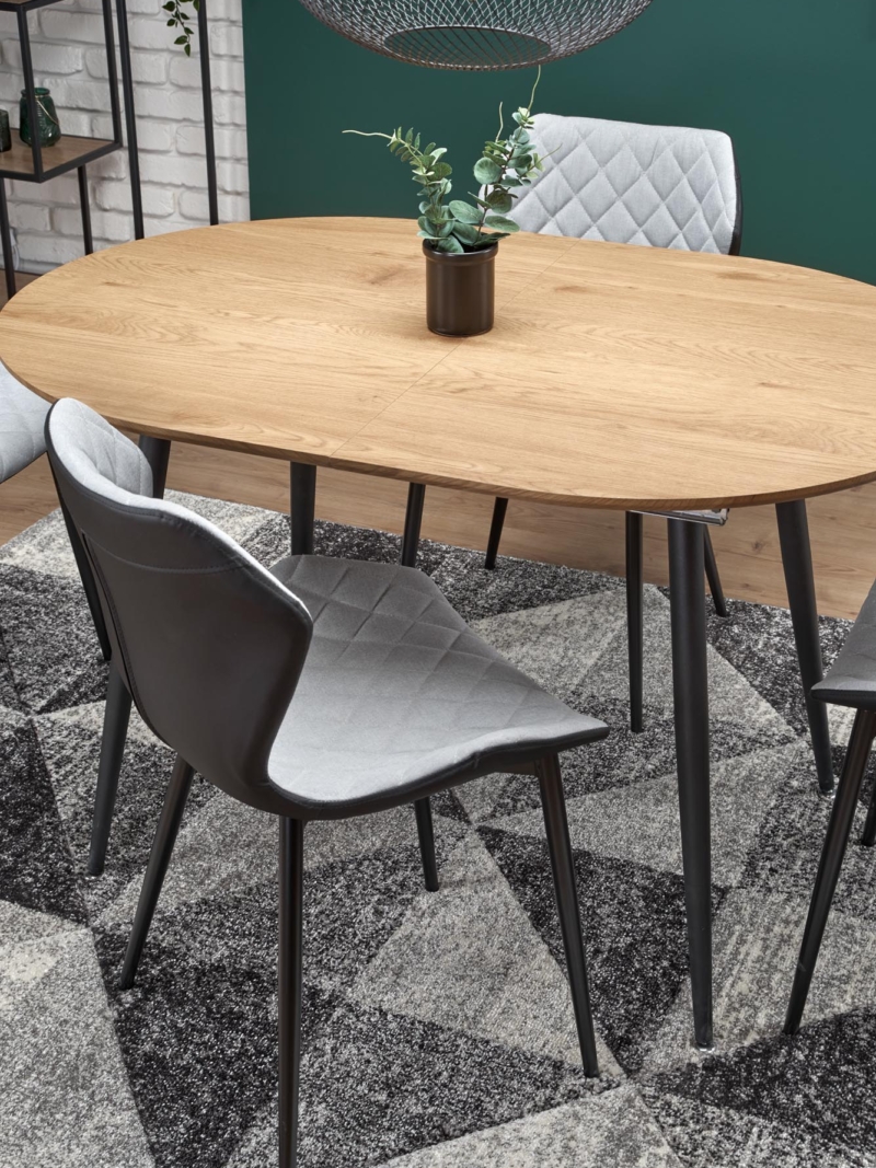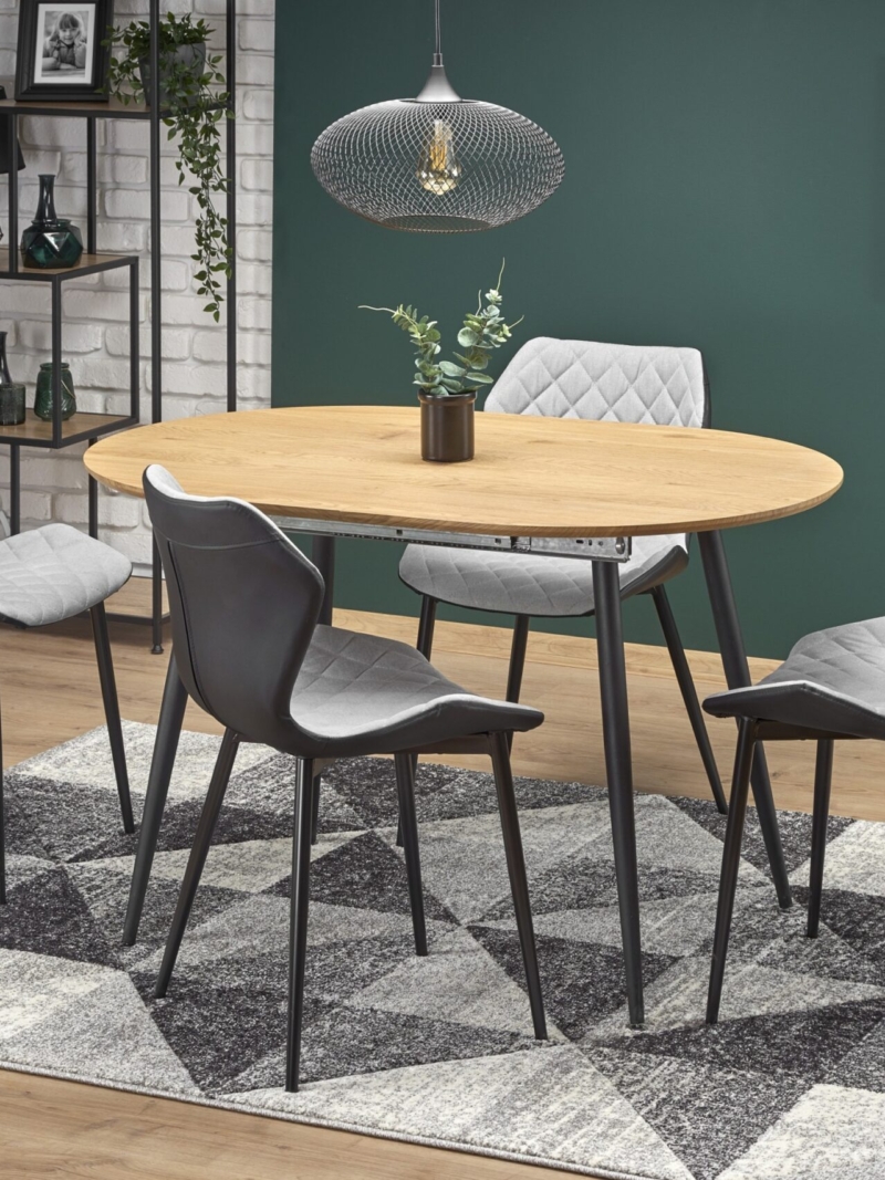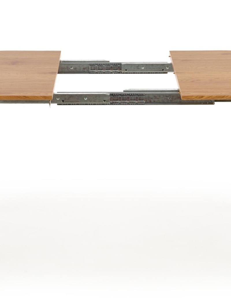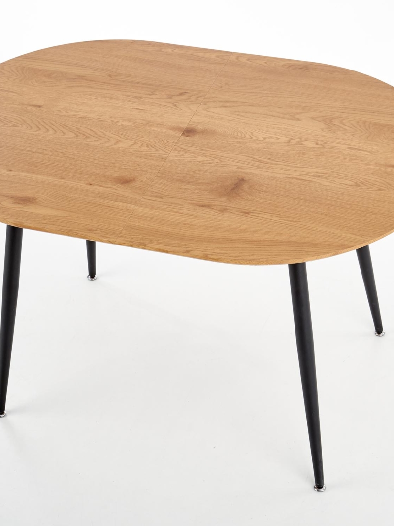 dimensions: 120-160/80/74 cm, extension table, material: laminated MDF / powder coated steel, color: top – golden oak, legs – black