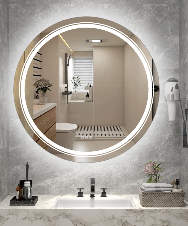 bathroom wall mirror, dimensions: 60/60/4.5 cm / LED backlight / program memory function / anti-fogging function, brightness adjustment / cold or warm light / touch switch, material: base – aluminum plate and frame / mirror, color: silver