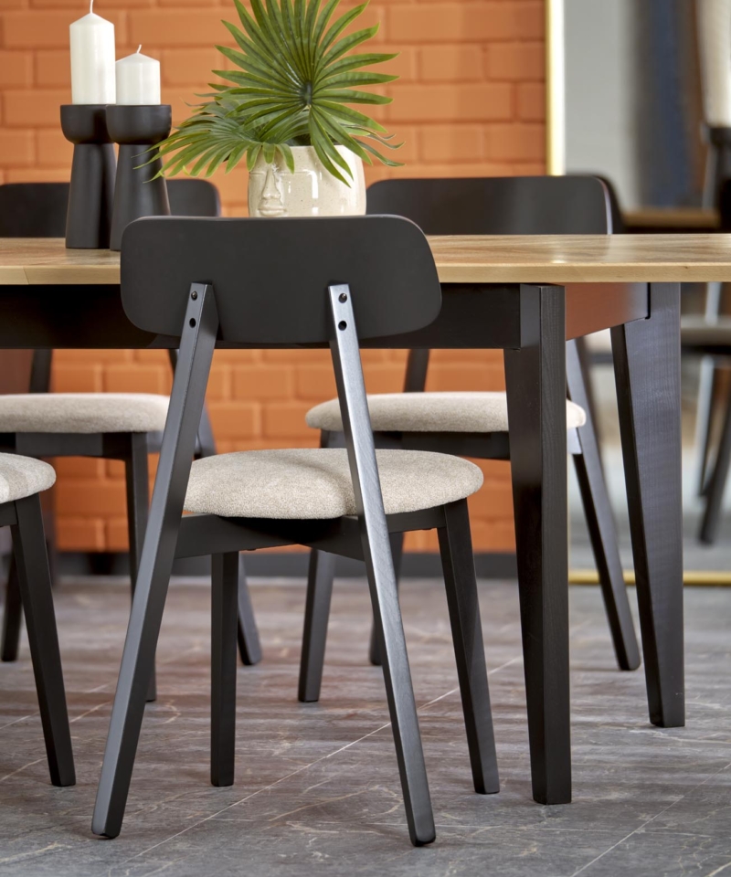 dimensions: 160-240/90/75/140 cm; extension table, material: laminated chipboard + natual oak veneer / solid beech wood, color: top – natural, legs – black