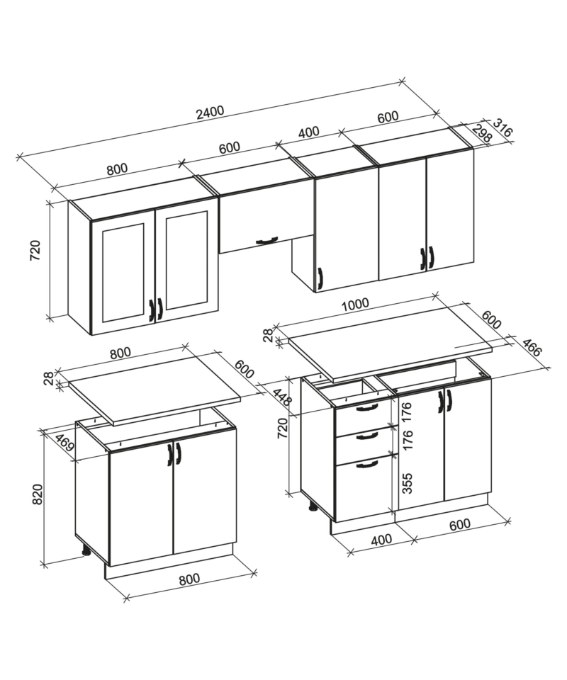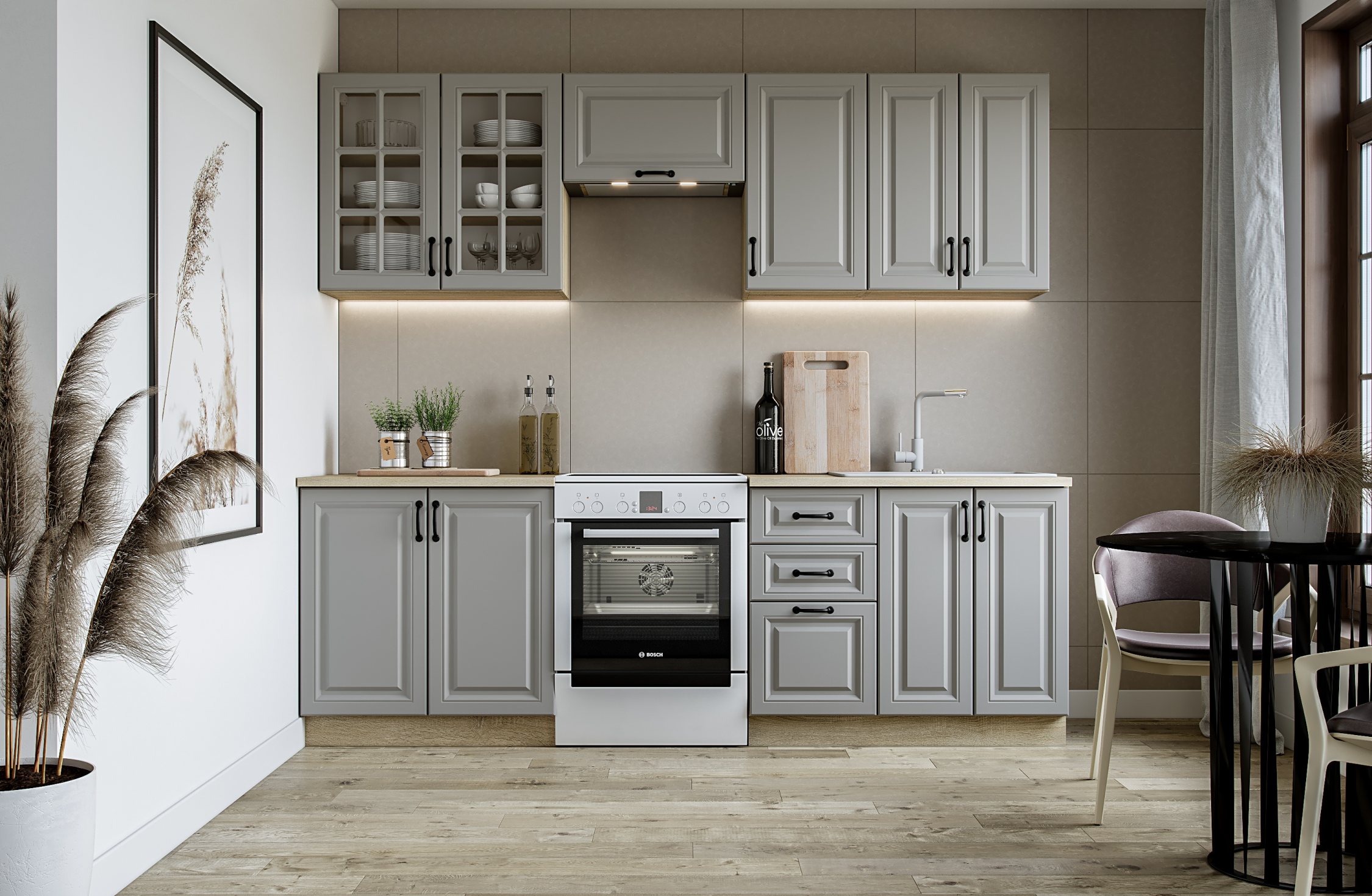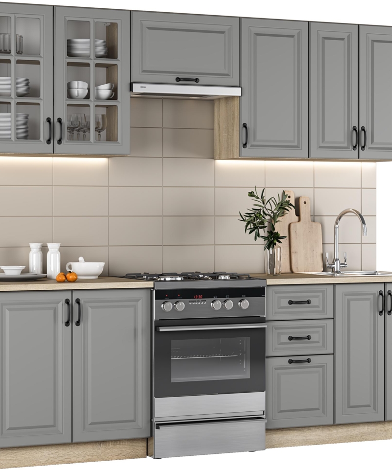 ELIZABETH 240 kitchen set, color: front – grey, body – sonoma oak, worktop – sonoma oak