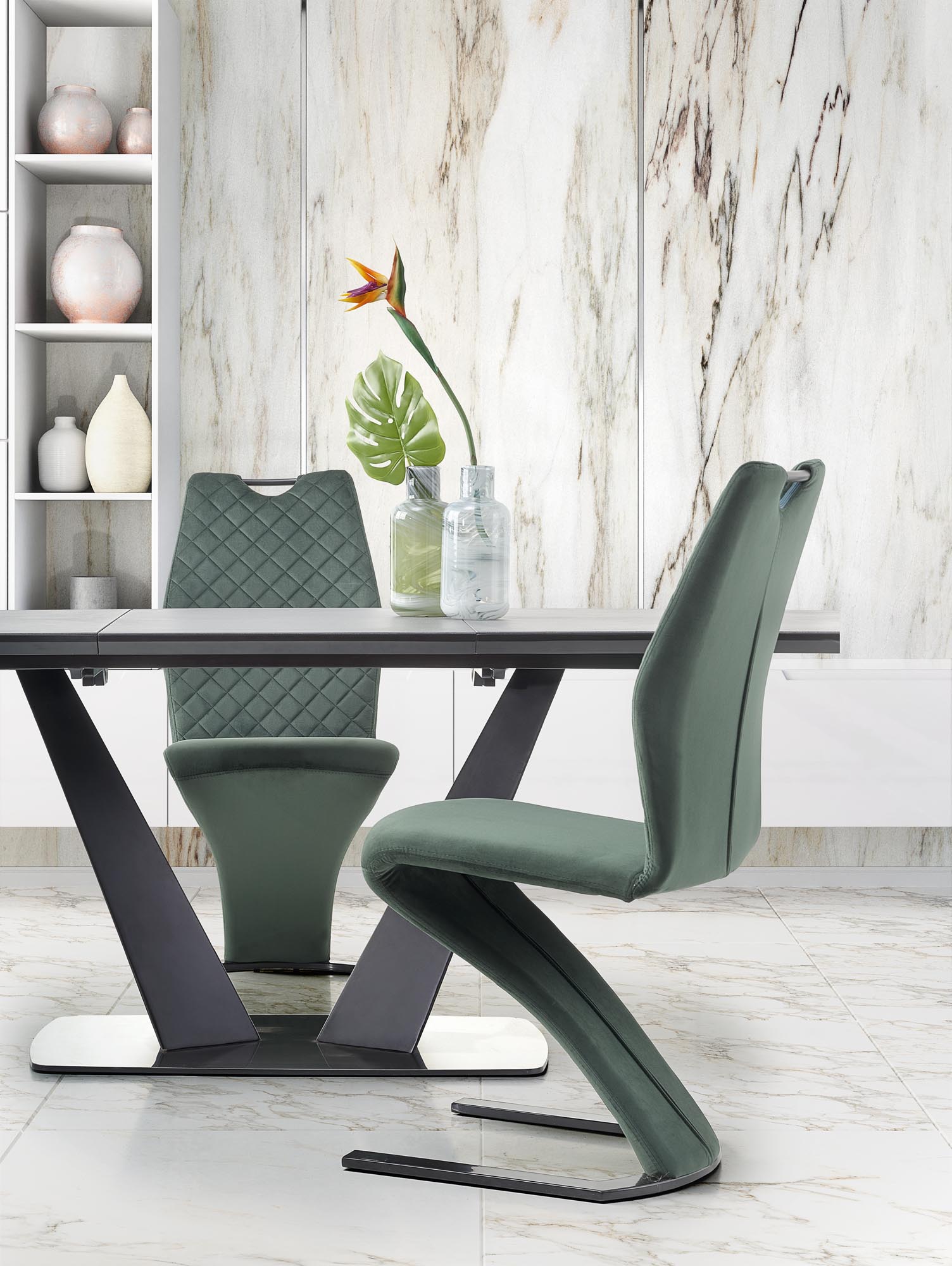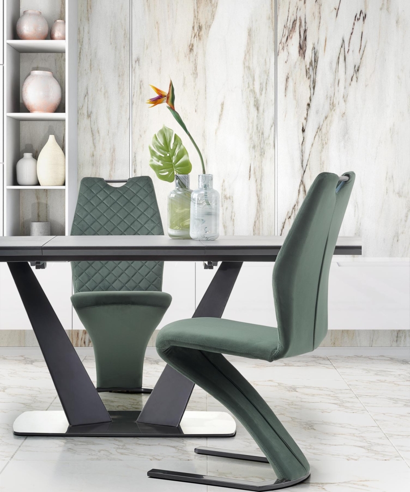 extension table, dimensions: 160-220/90/76 cm, material: glass / lacquered MDF / powder coated steel / stainless steel, color: top – dark grey, legs – black