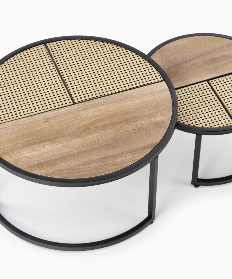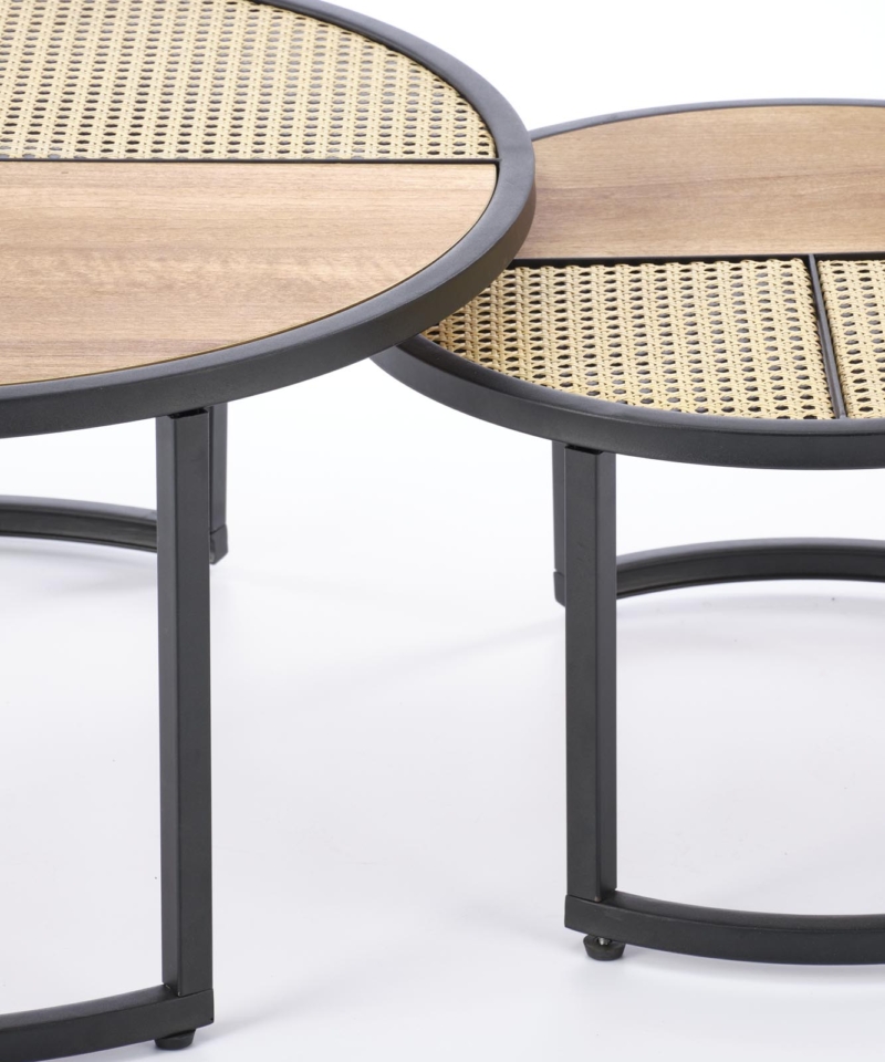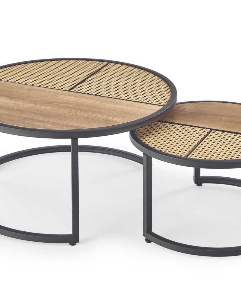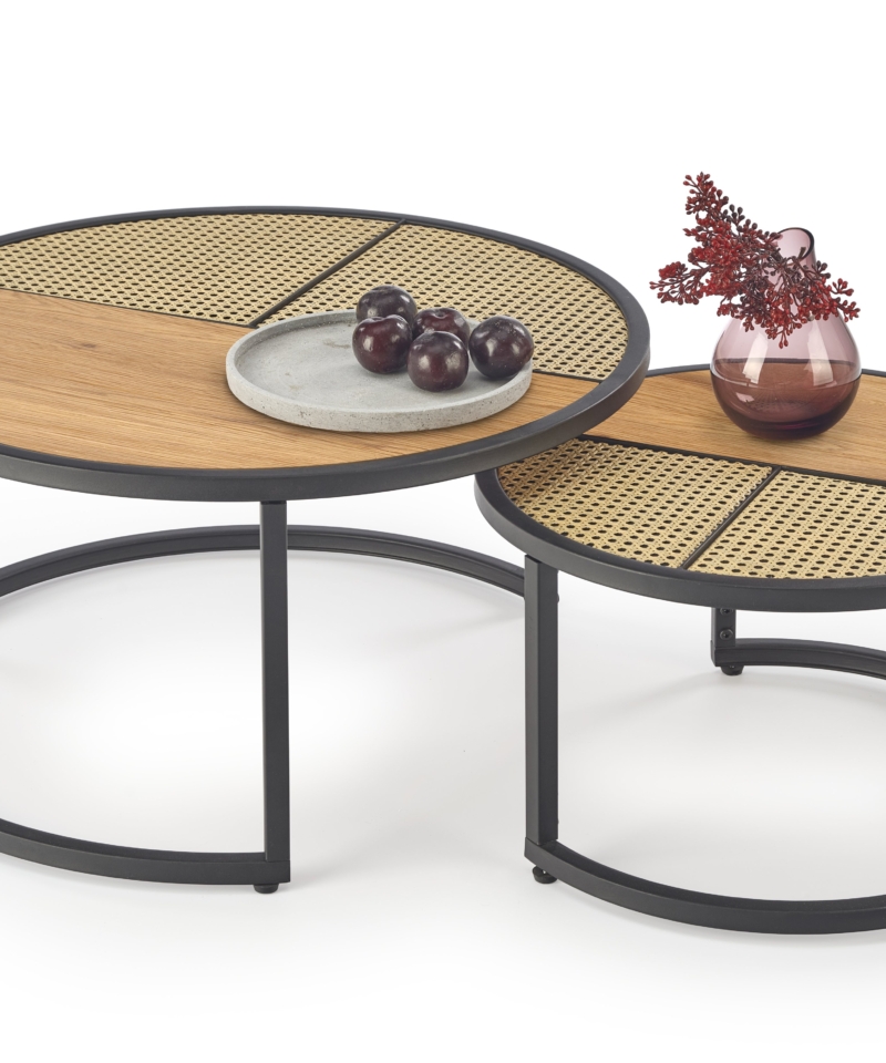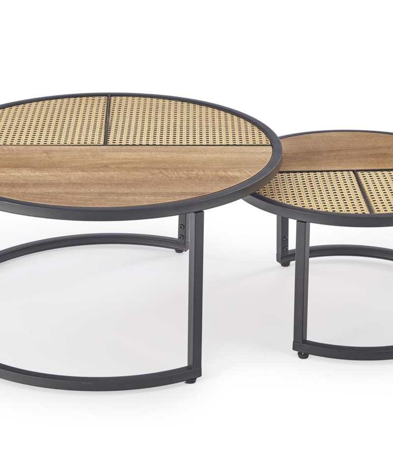 dimensions: fi 70/36 oraz fi 50/30 cm, set of two coffee tables, material: lamianted MDF / powder coated steel, color: golden oak / black