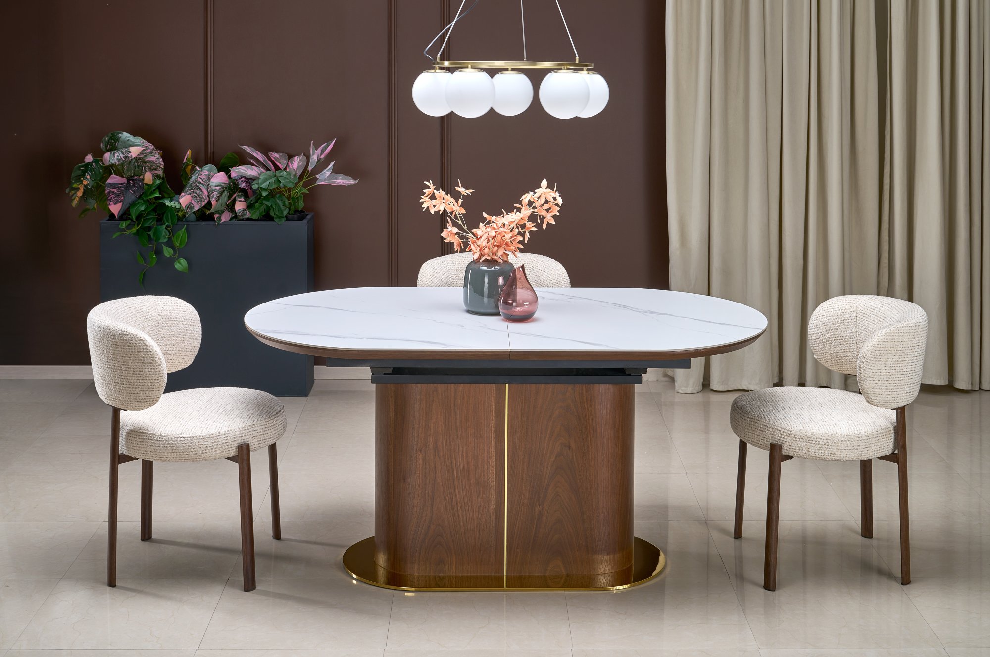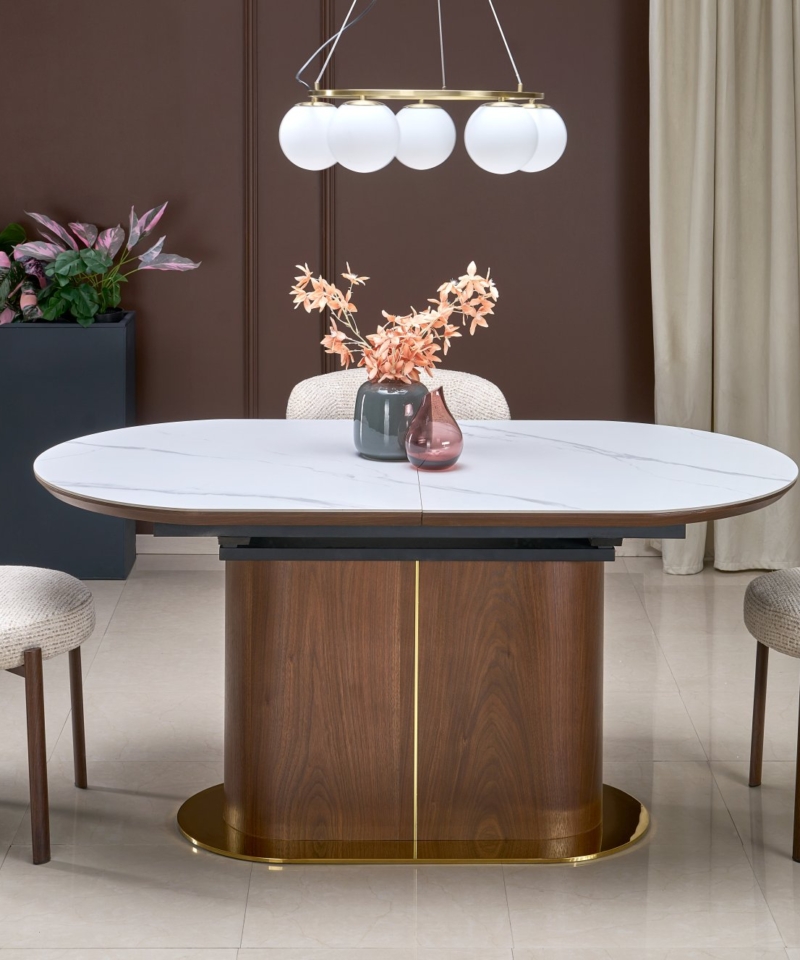 dimensions: 160-220/90/76 cm, extension table, material: sintered stone / lacquered MDF / laminated MDF, color: top – white marble, legs – walnut / gold