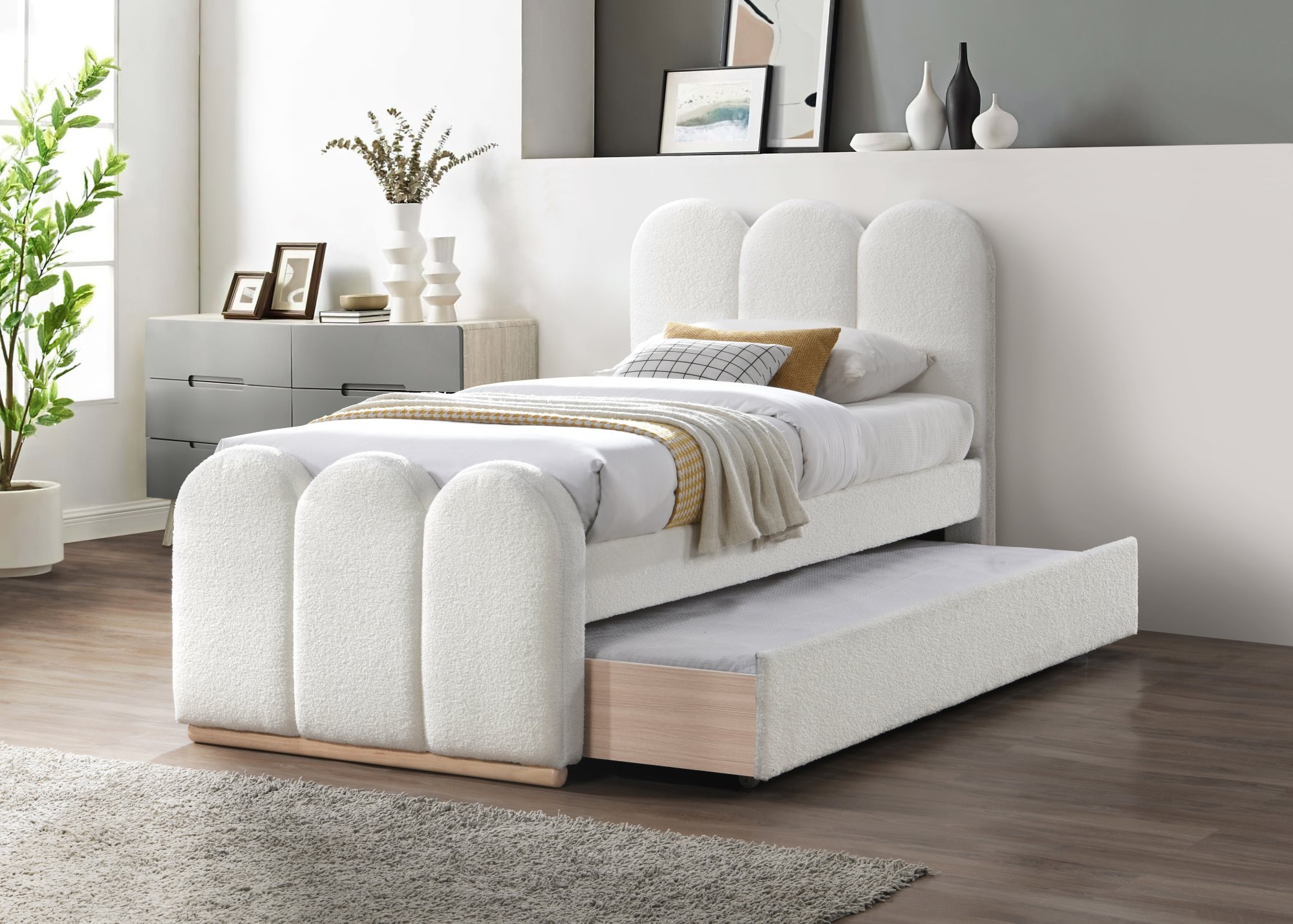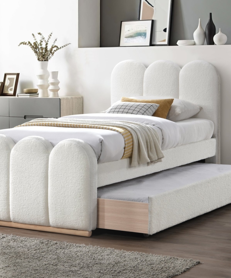 double bed with pull-out bottom mattress space, material: cloth / solid wood, color: cream,* bed without mattress, optional mattress POLARIS 90 or SYRIUSZ 90