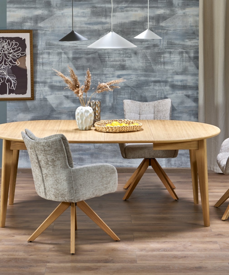 dimensions: 120-200/120/76 cm, extension table, material: laminated chipboard + natural oak veneer / solid oak wood, color: top – natural, legs – natural