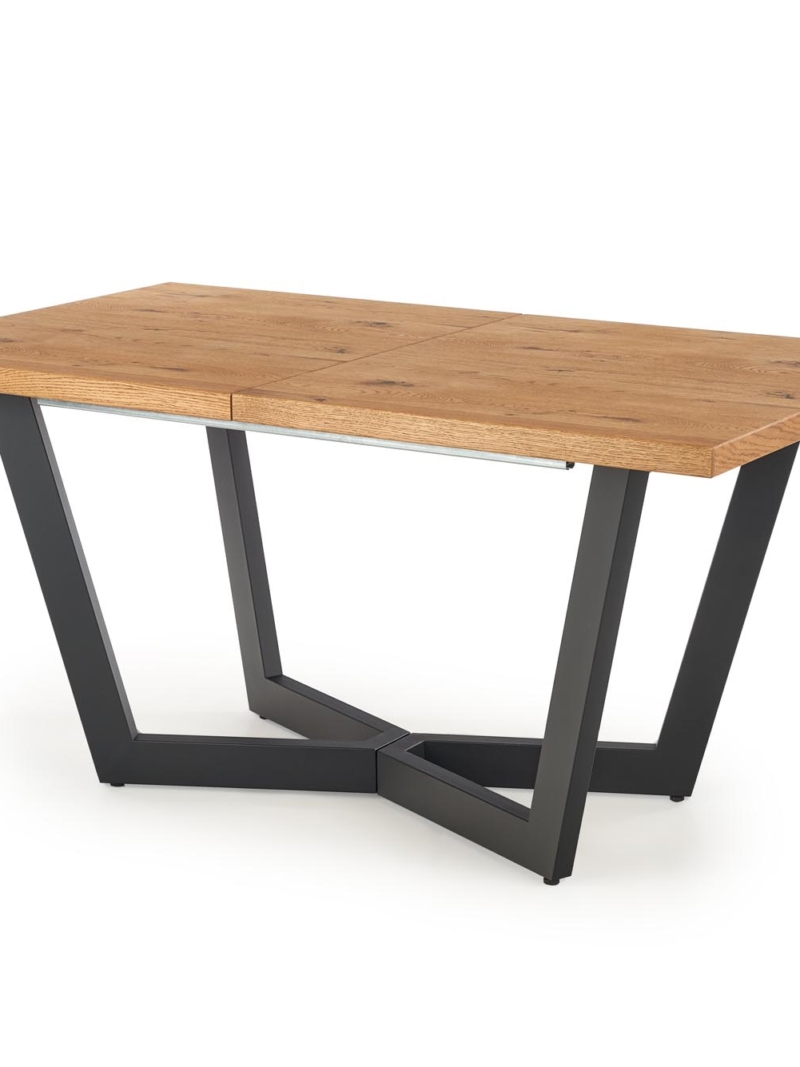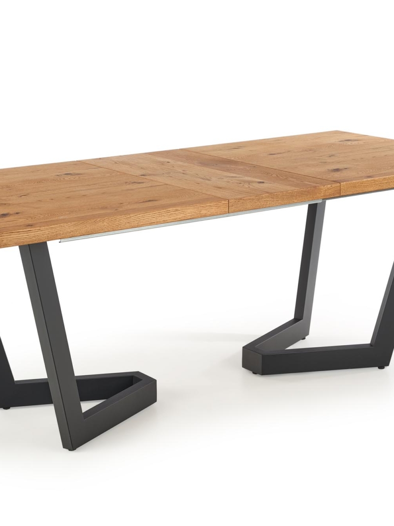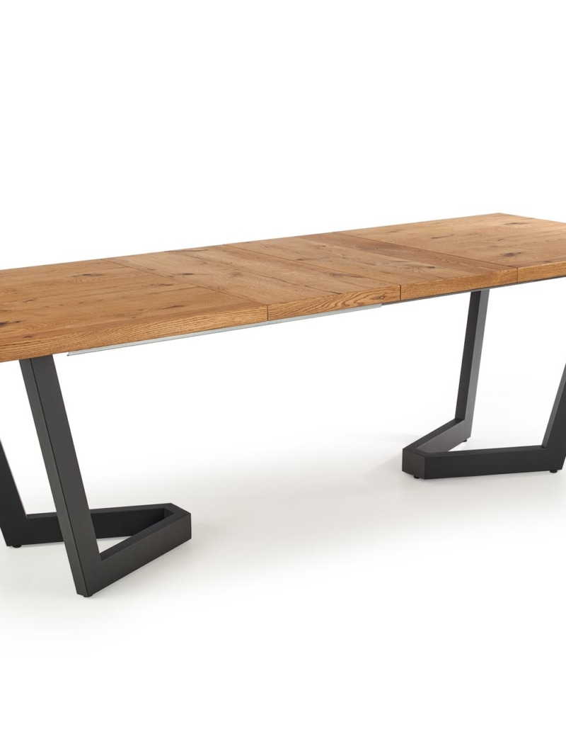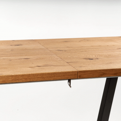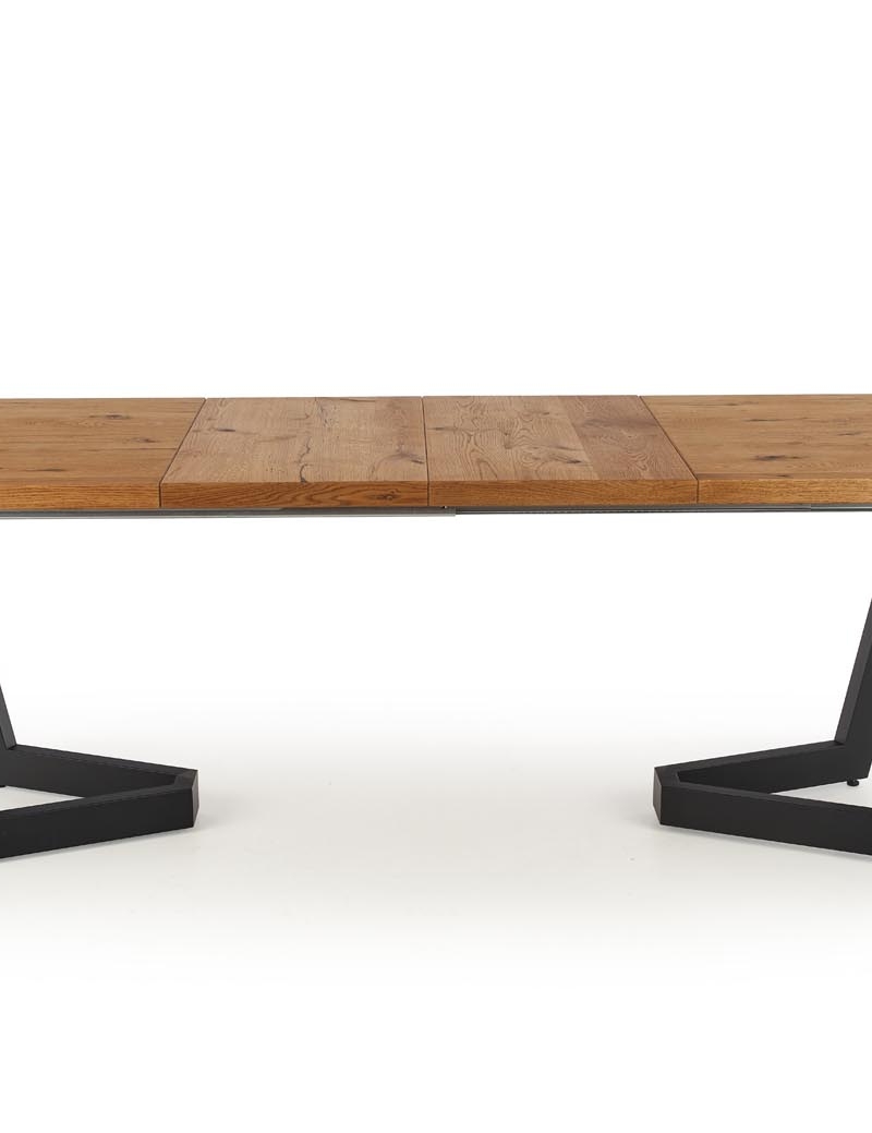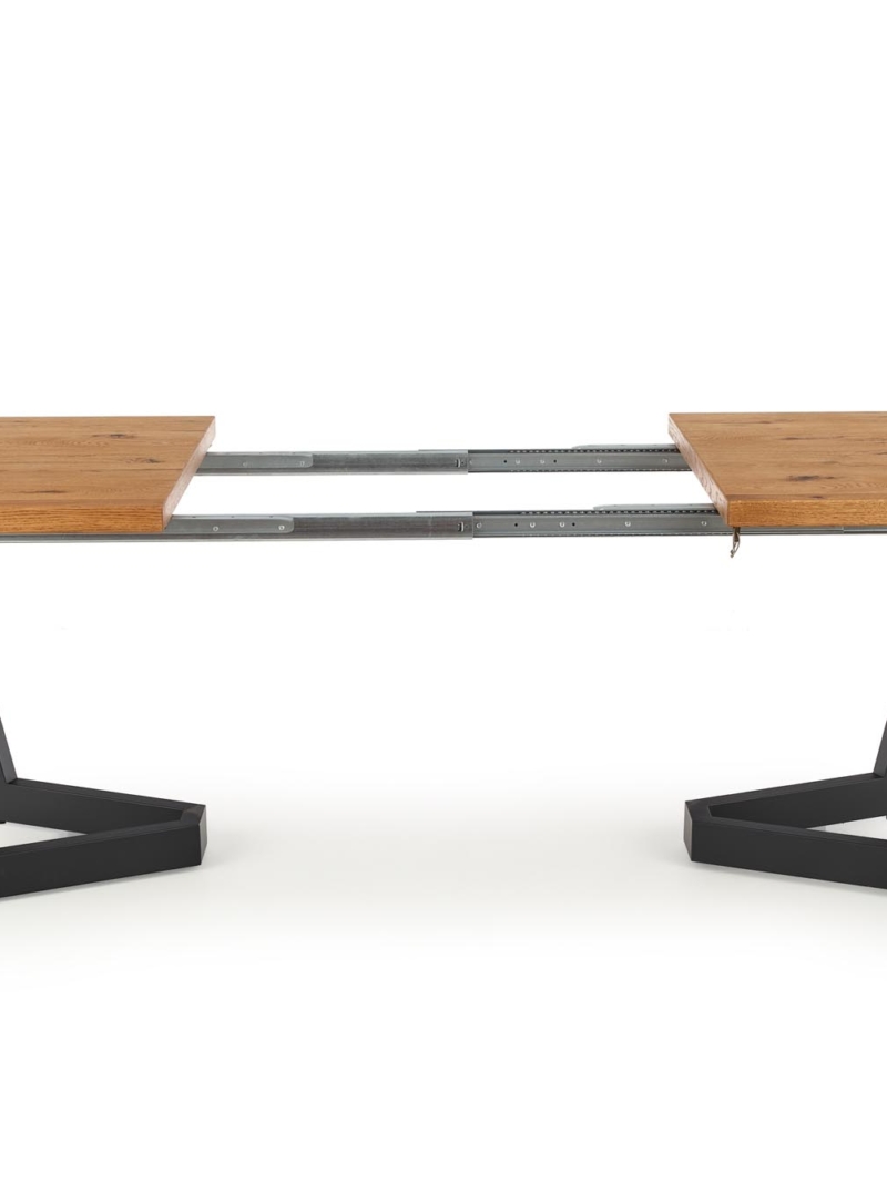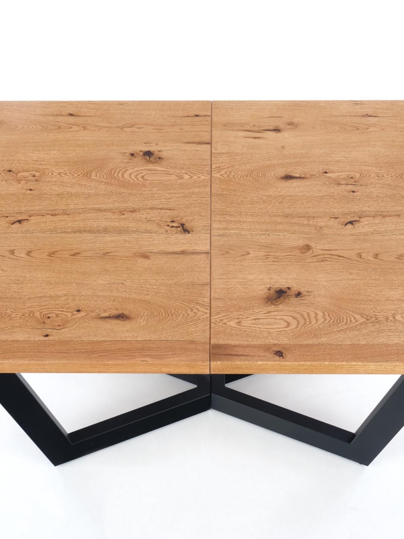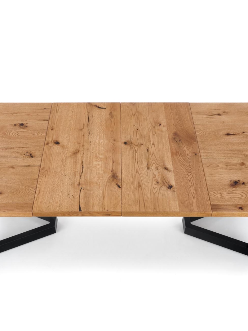 extension table, dimensions: 160-250(340)/90/77 cm; material: top – vaneered board, solid wood on edges, legs – powder coated steel, color: top – light oak, legs – black, * optional MASSIVE worktop extension (dimensions: 45×90 cm – 2 pcs.)