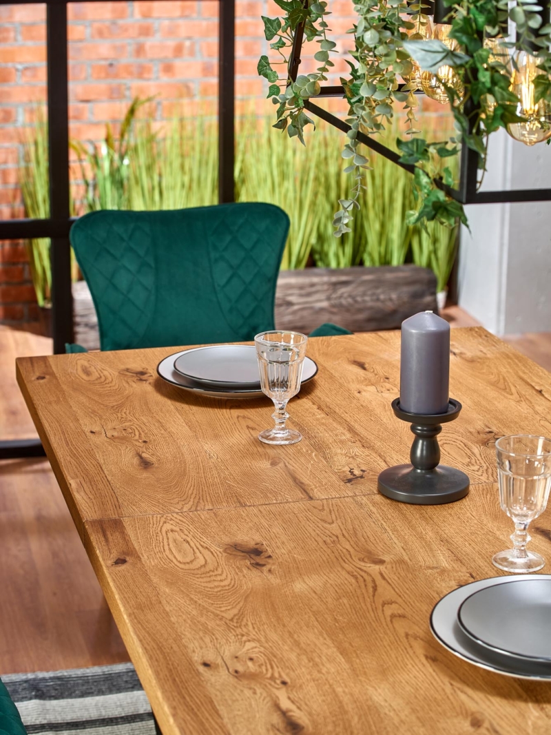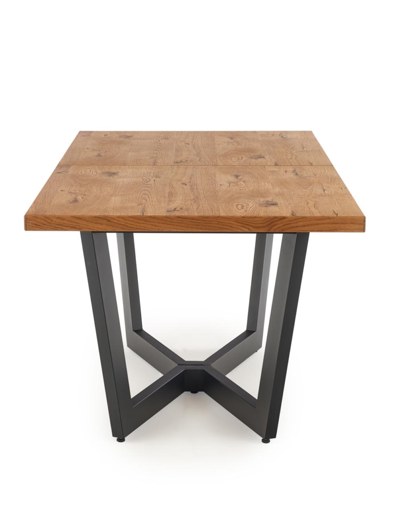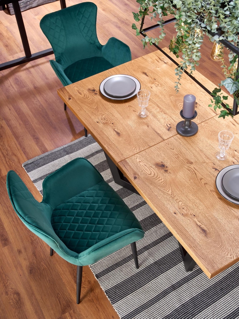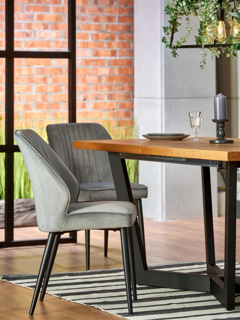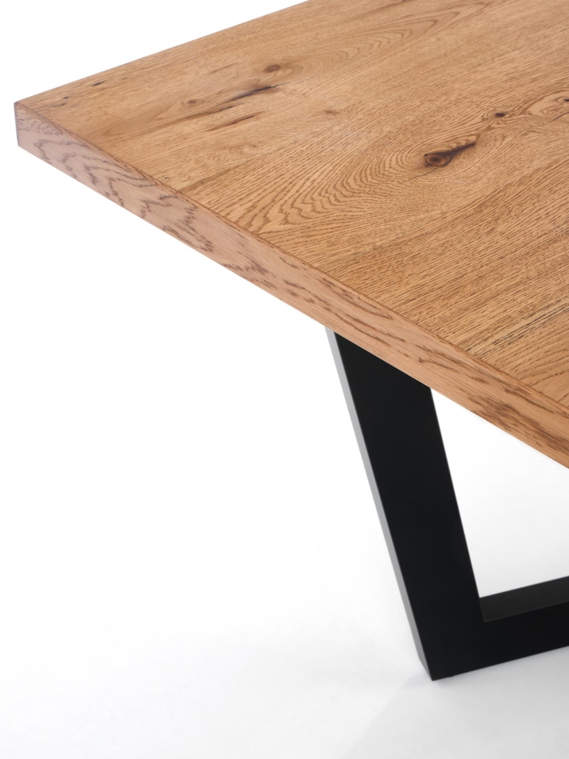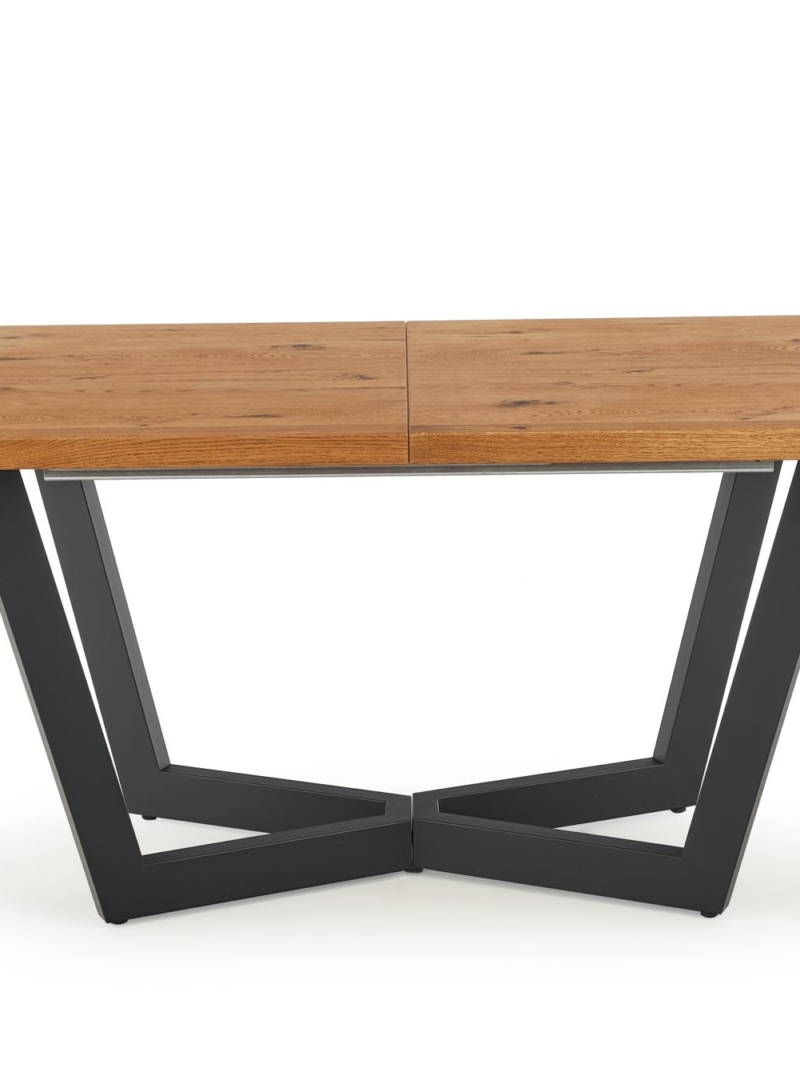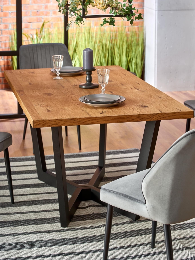 extension table, dimensions: 160-250(340)/90/77 cm; material: top – vaneered board, solid wood on edges, legs – powder coated steel, color: top – light oak, legs – black, * optional MASSIVE worktop extension (dimensions: 45×90 cm – 2 pcs.)