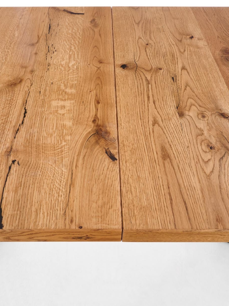 extension table, dimensions: 160-250(340)/90/77 cm; material: top – vaneered board, solid wood on edges, legs – powder coated steel, color: top – light oak, legs – black, * optional MASSIVE worktop extension (dimensions: 45×90 cm – 2 pcs.)
