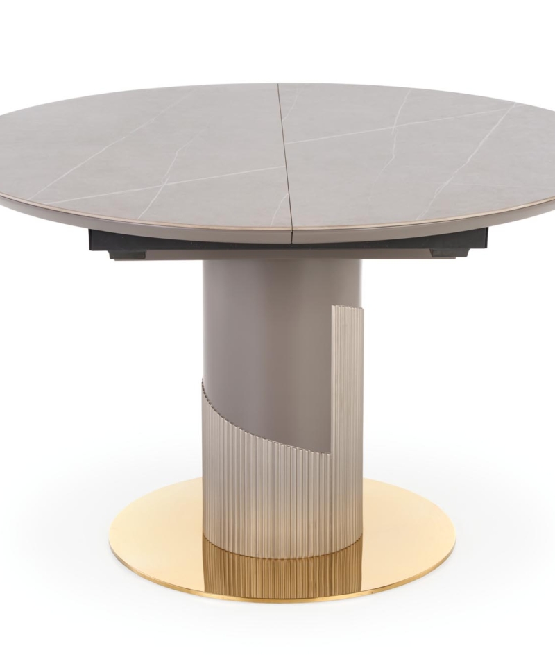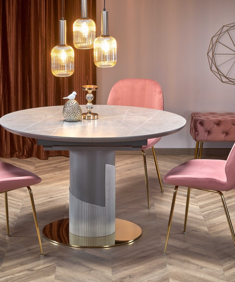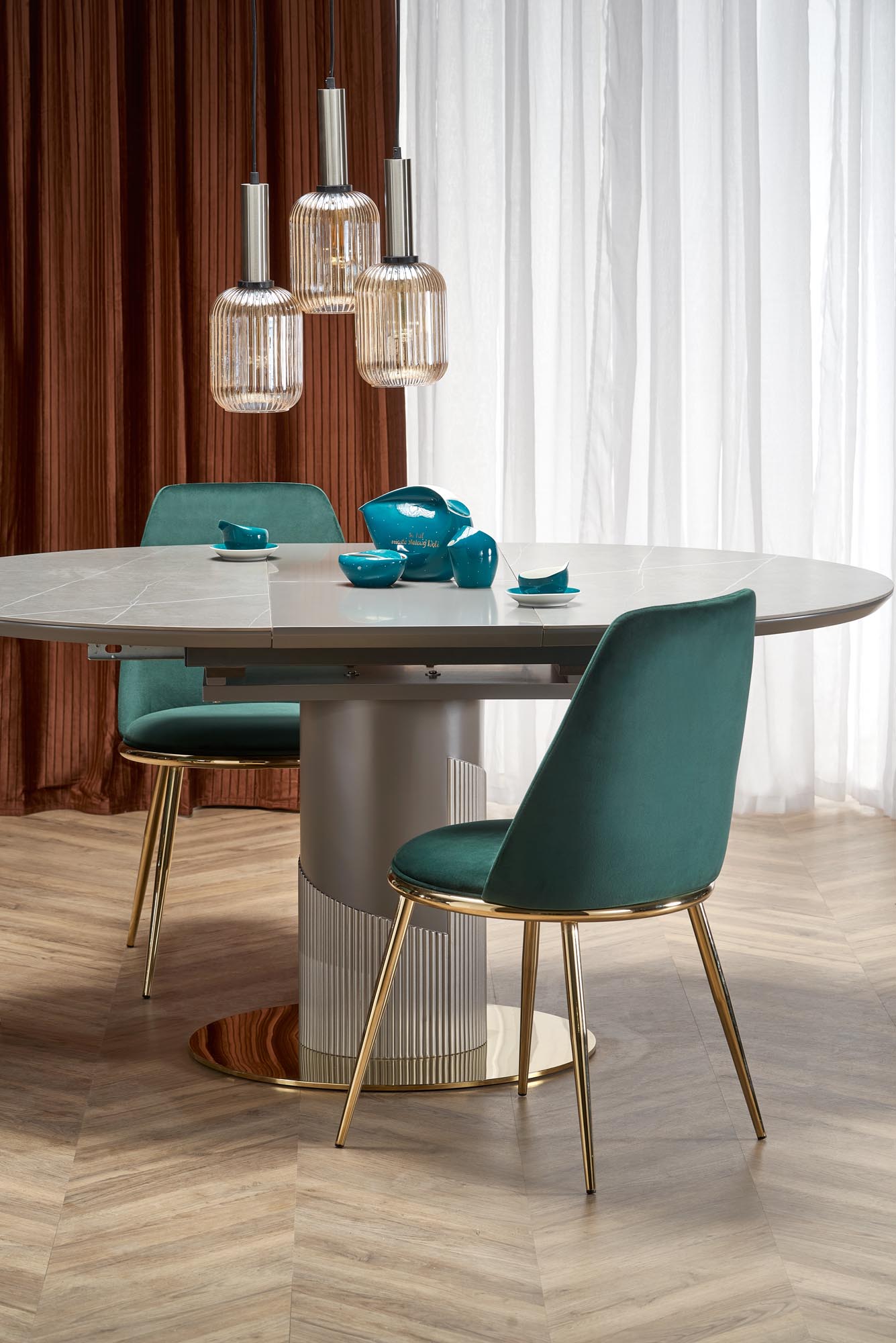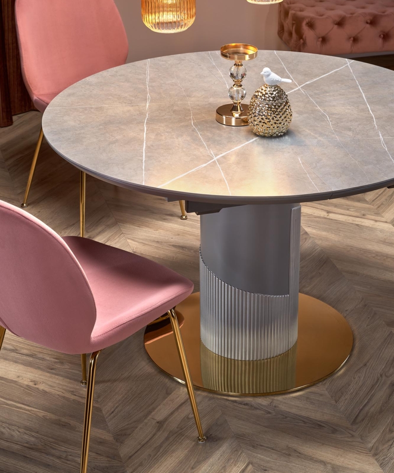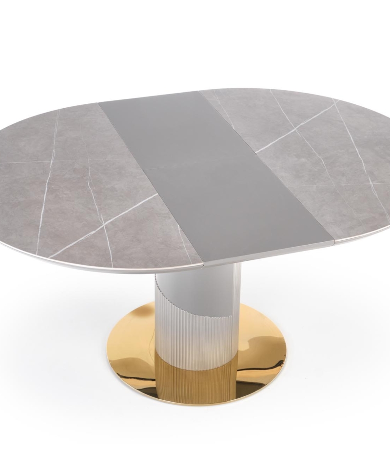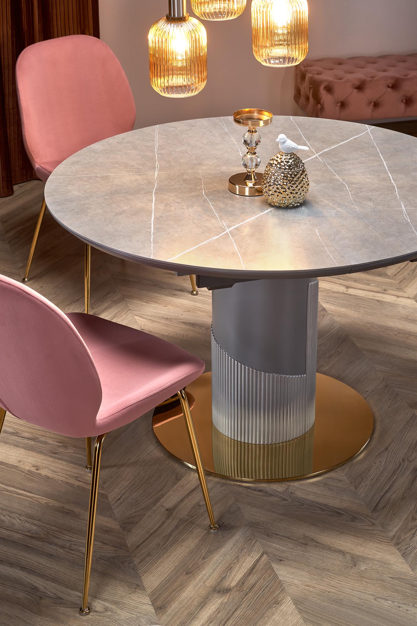 dimensions: 120-160/120/76 cm, extension table, material: ceramic / lacquered MDF / chrome steel / polypropylene, color: top – grey marble, legs – light grey / gold