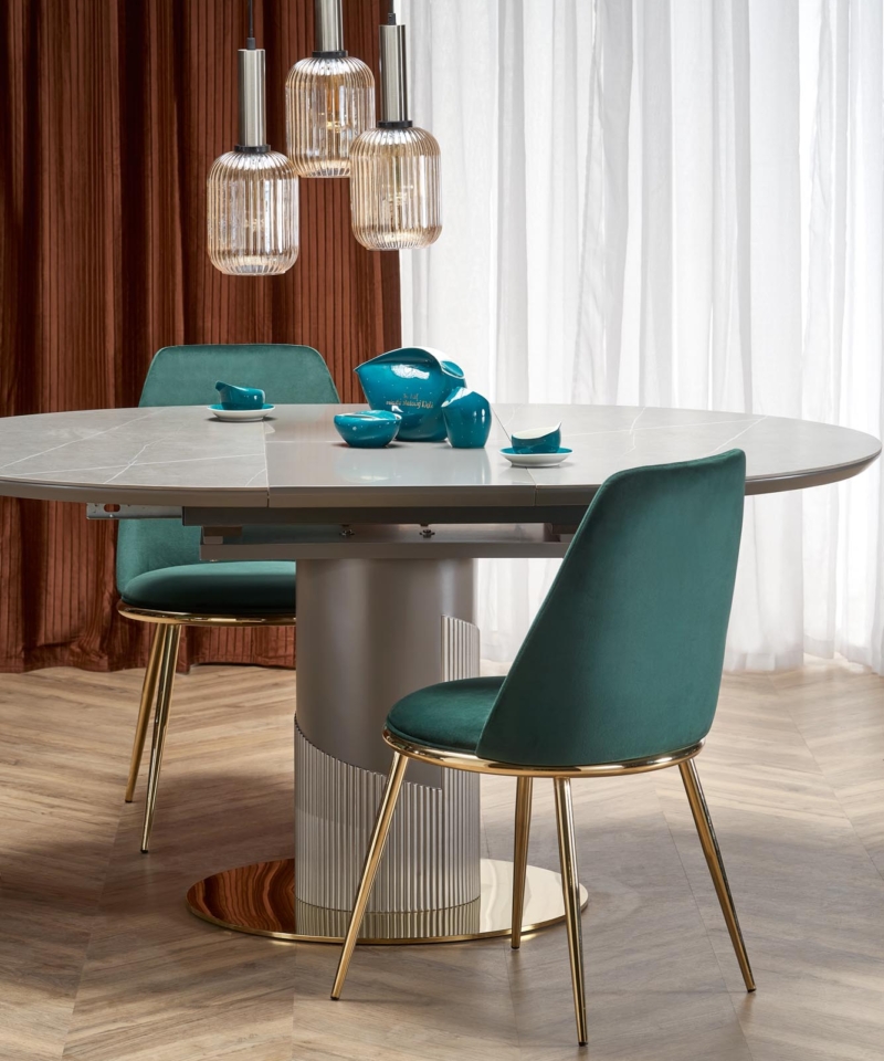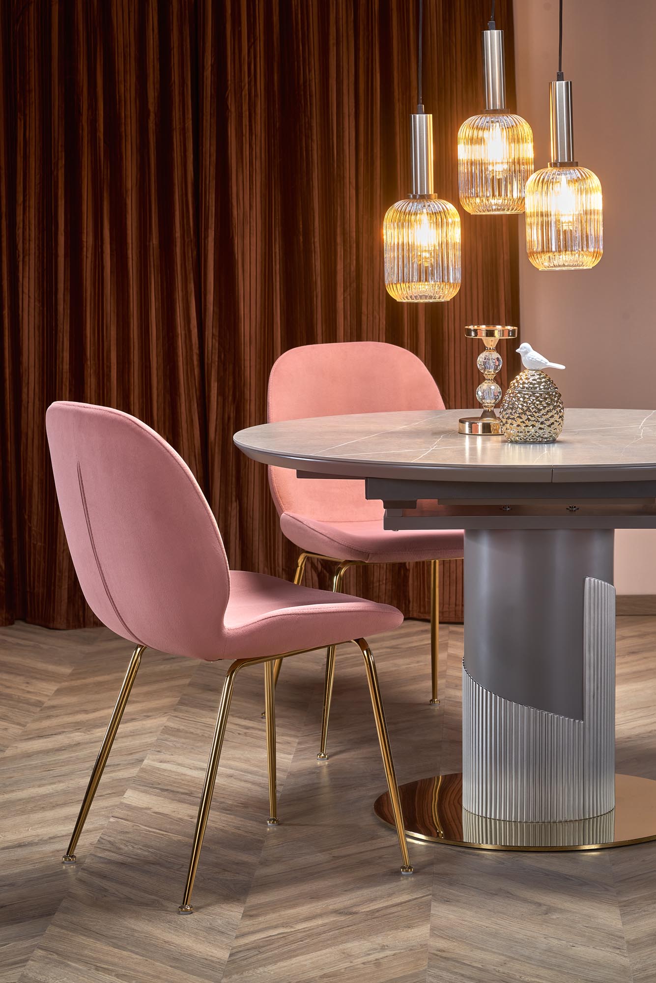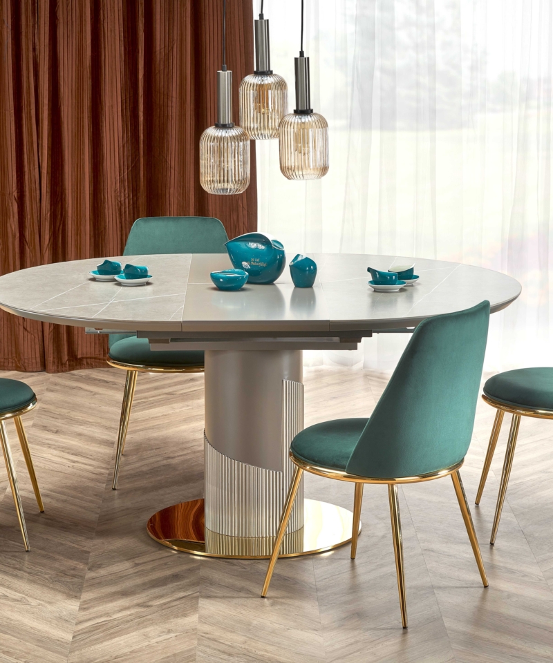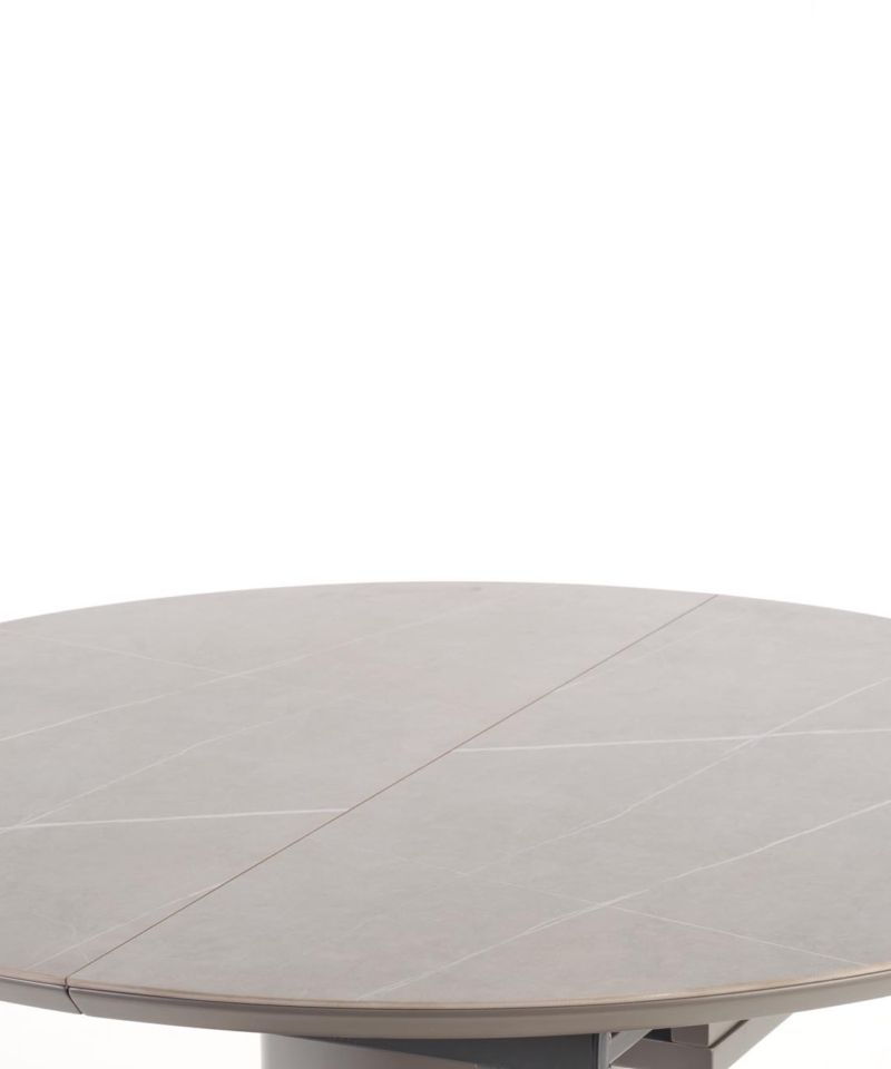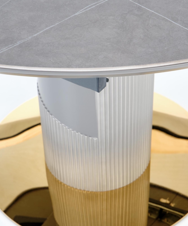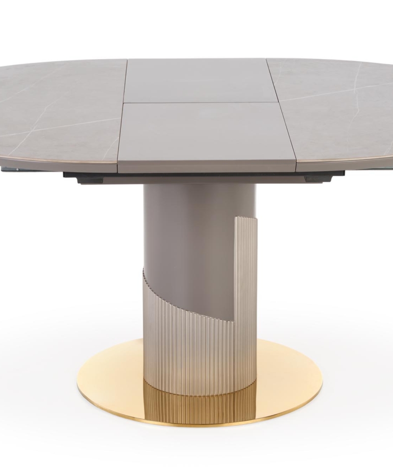 dimensions: 120-160/120/76 cm, extension table, material: ceramic / lacquered MDF / chrome steel / polypropylene, color: top – grey marble, legs – light grey / gold