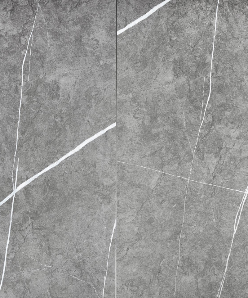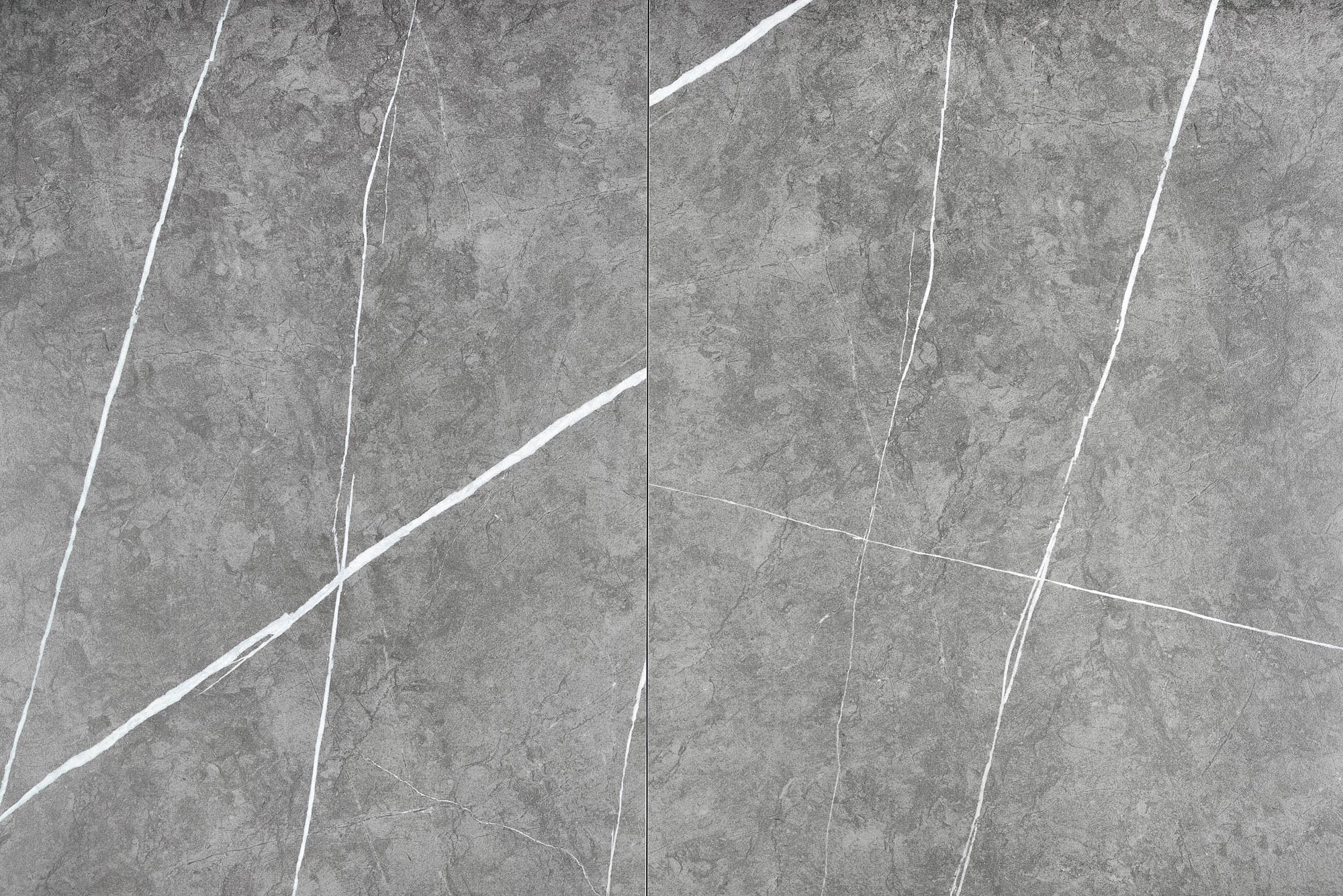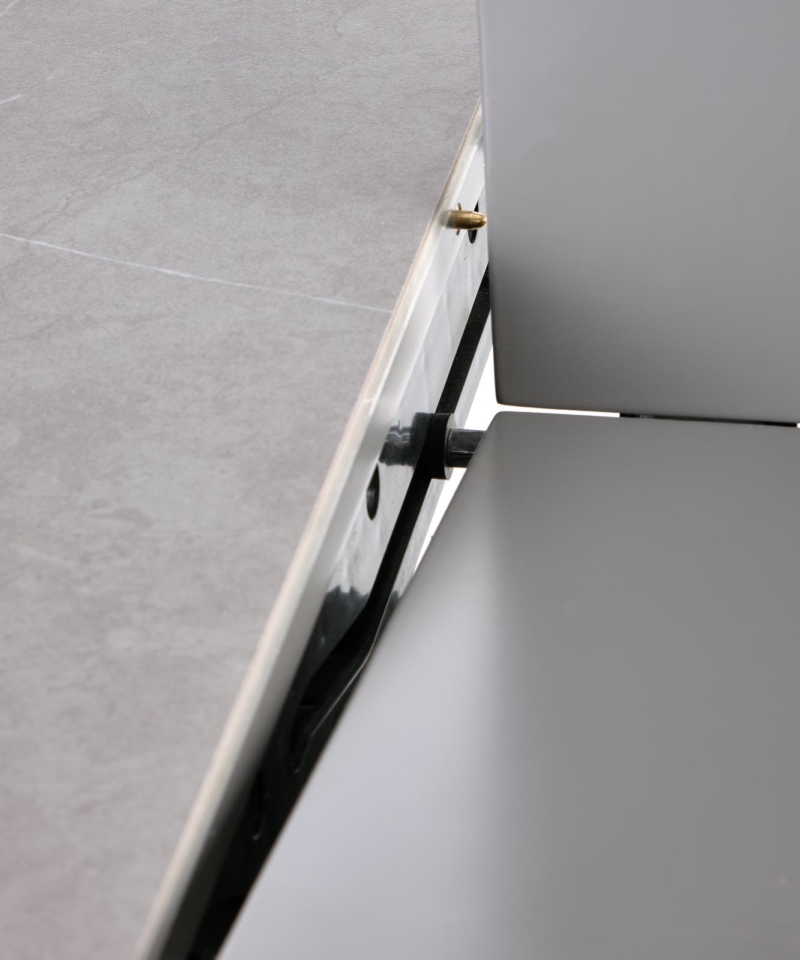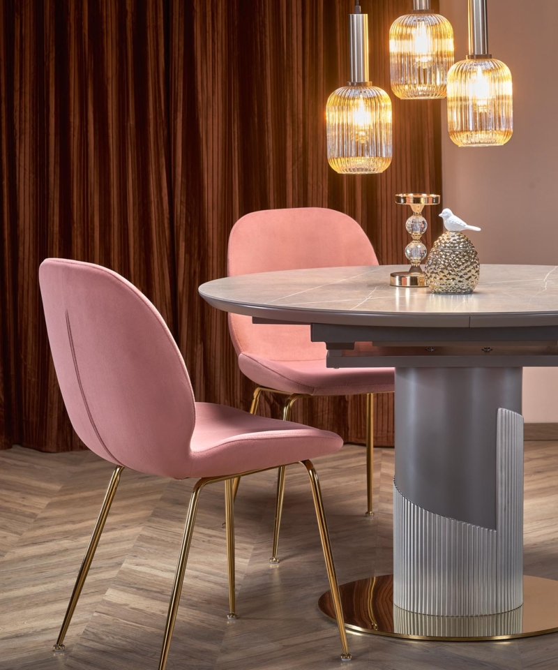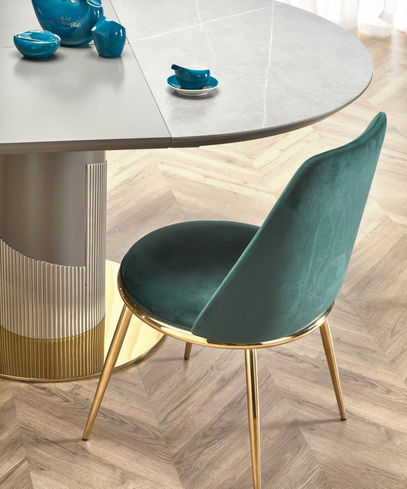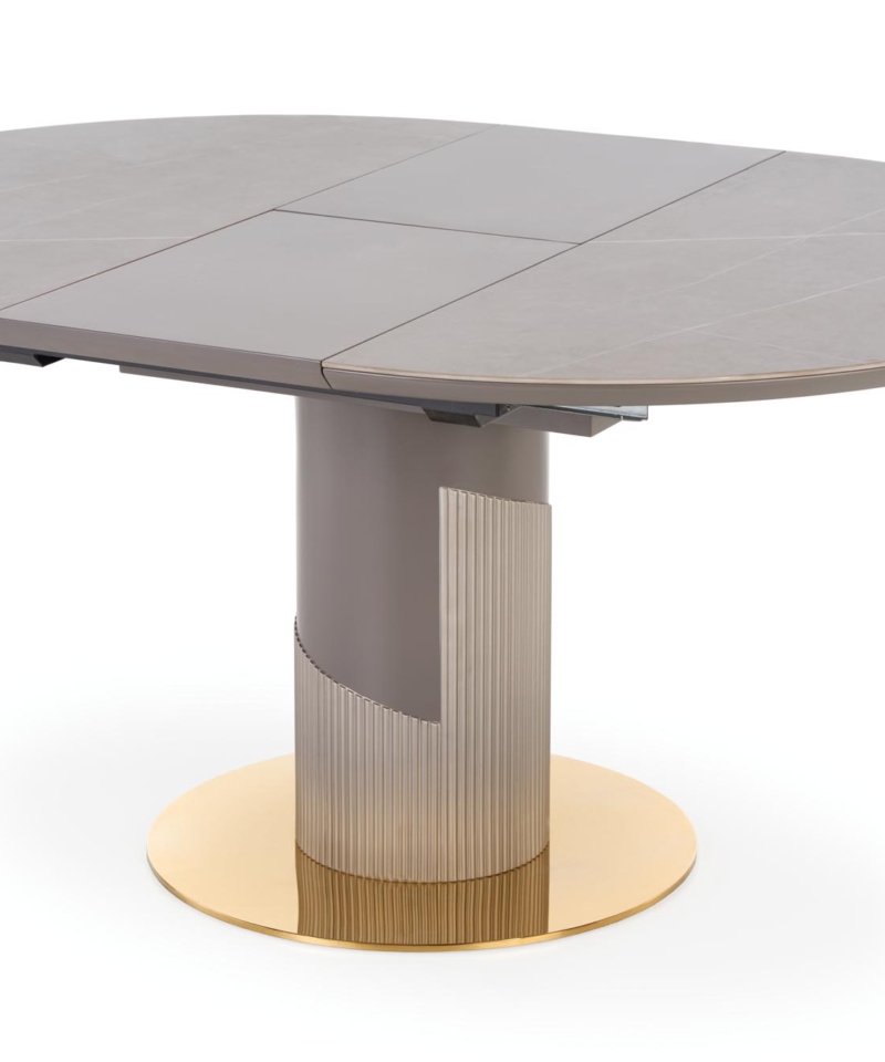 dimensions: 120-160/120/76 cm, extension table, material: ceramic / lacquered MDF / chrome steel / polypropylene, color: top – grey marble, legs – light grey / gold