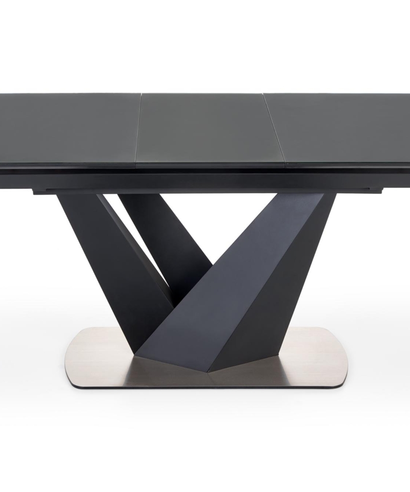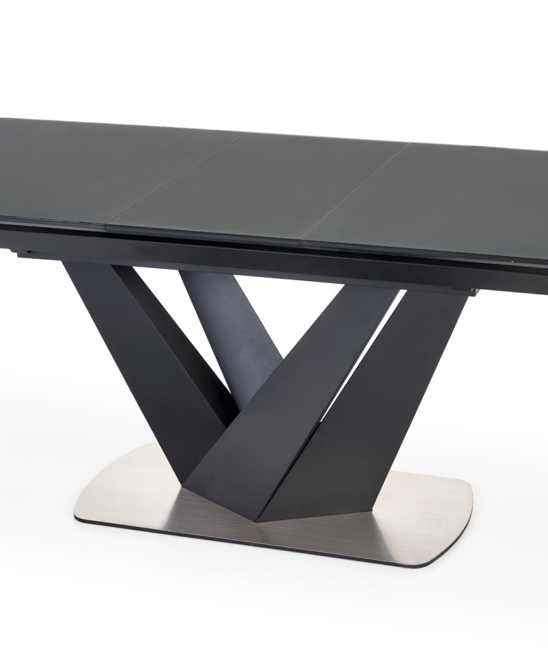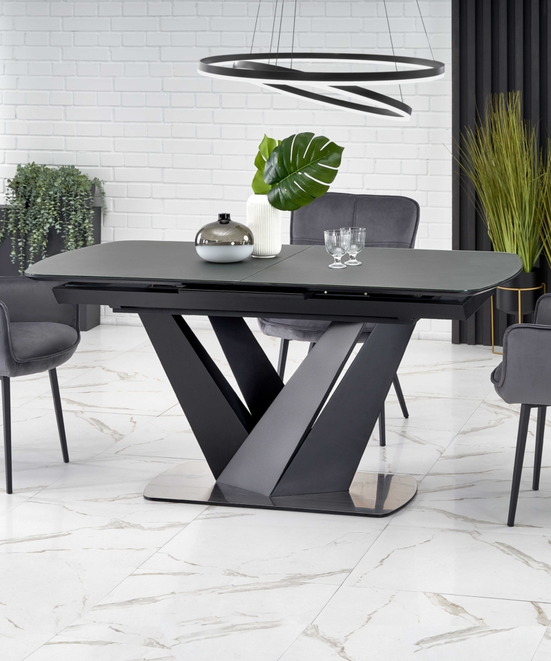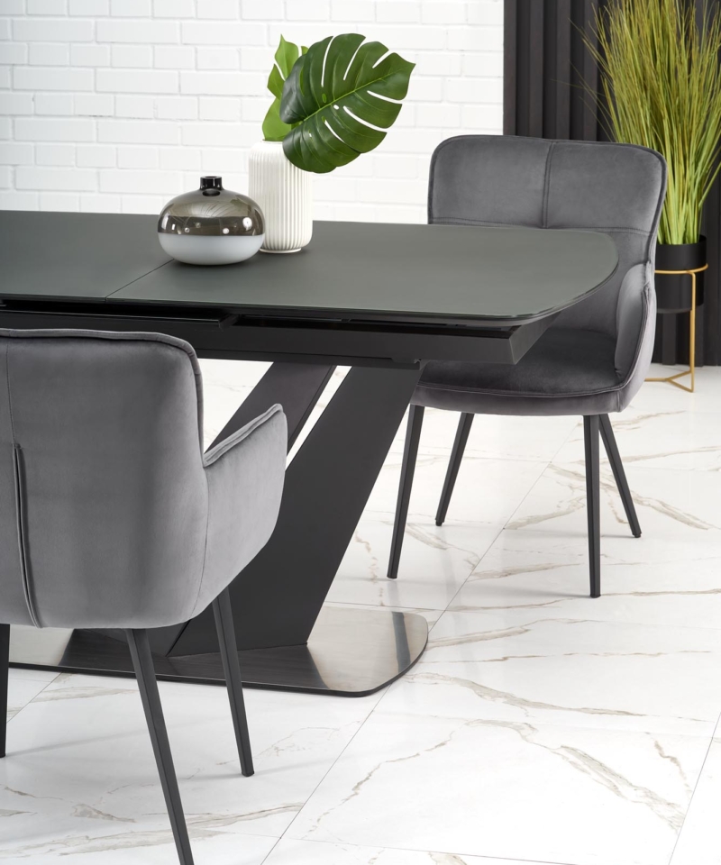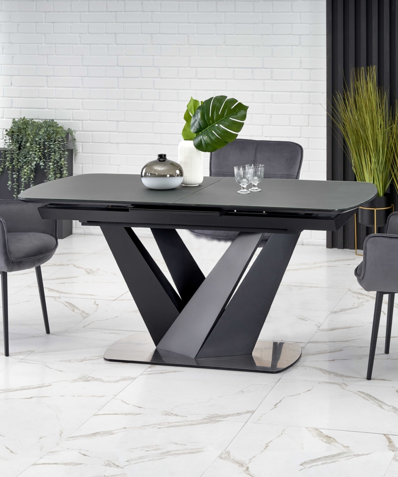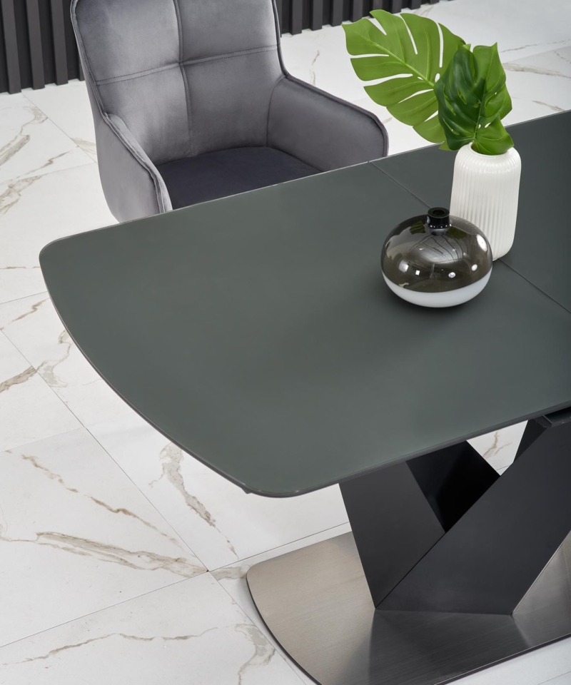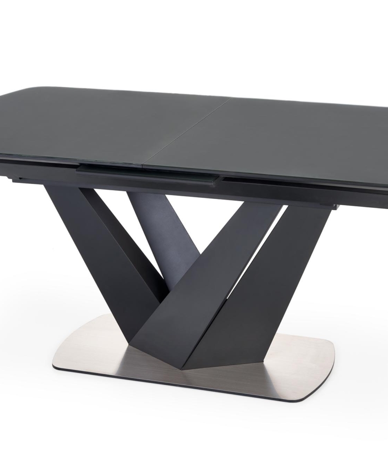dimensions: 160-200/90/77 cm, extension table, material: glass / lacquered MDF – matt / stainless steel, color: top – dark grey, legs – black