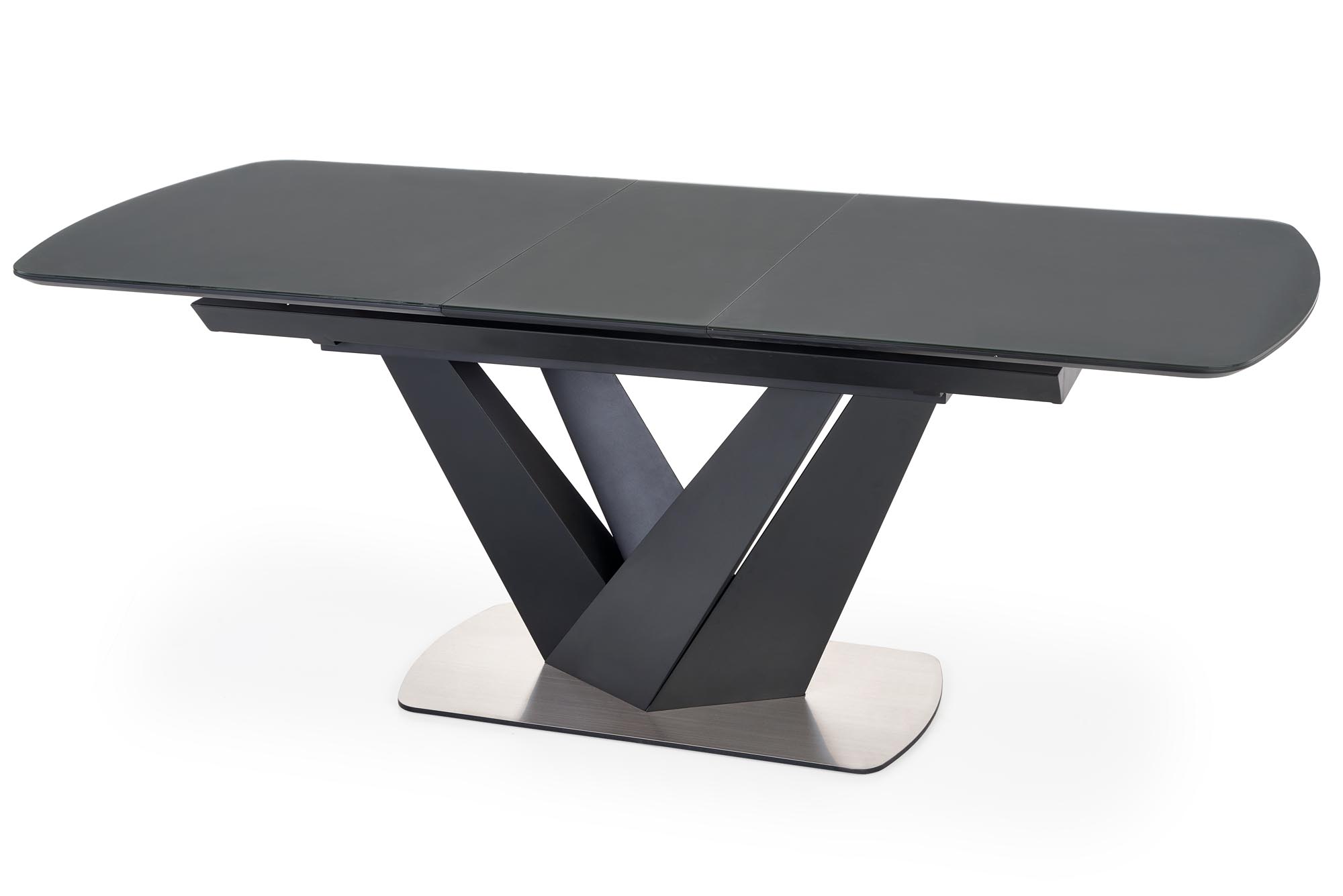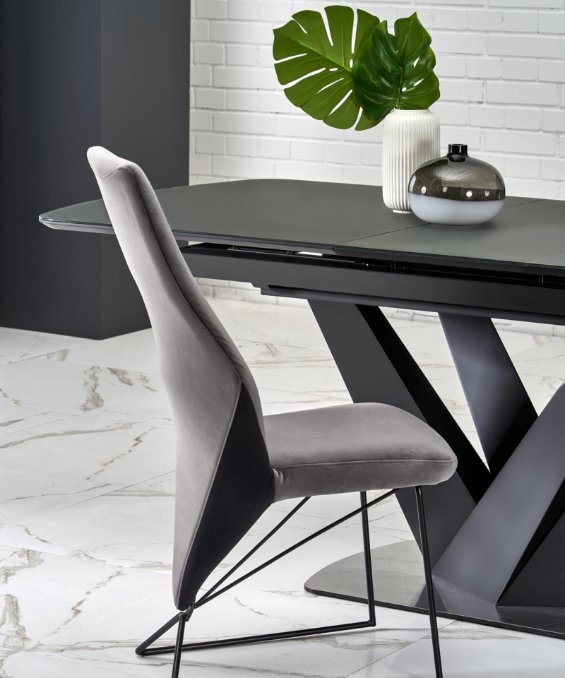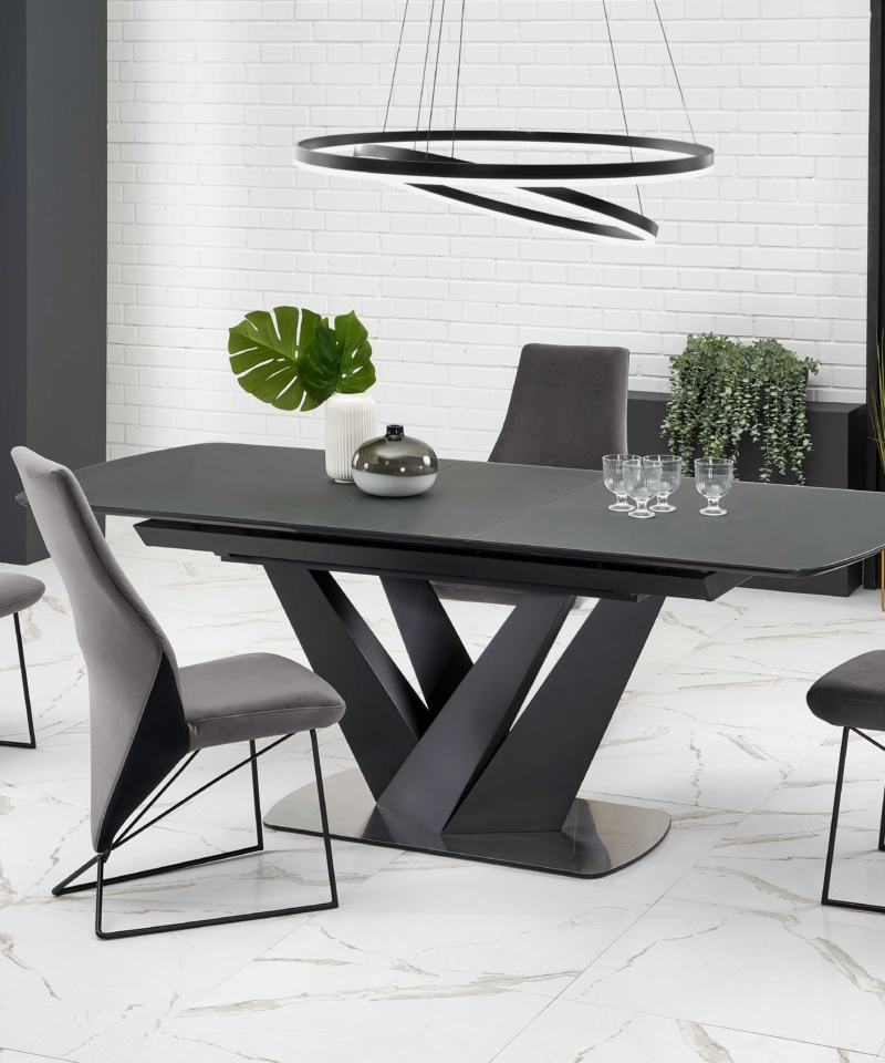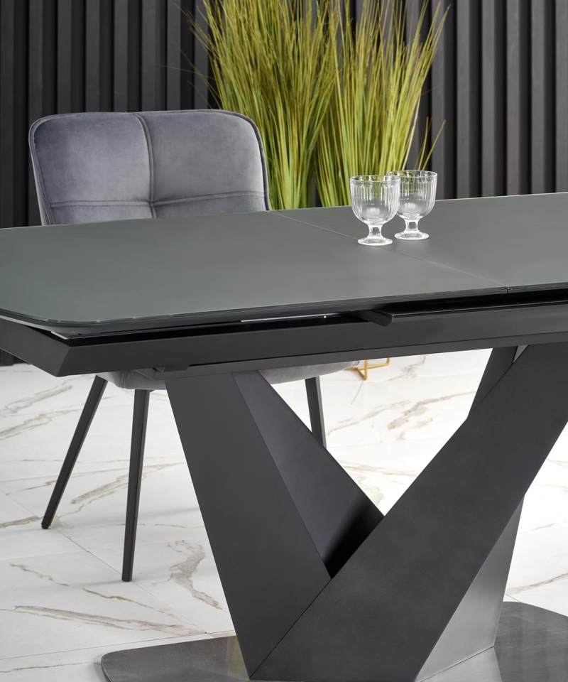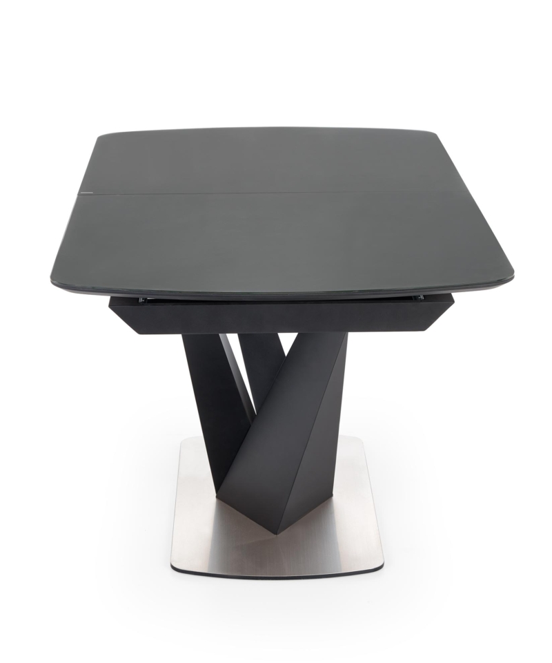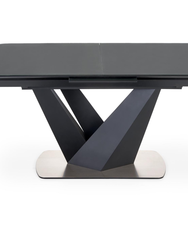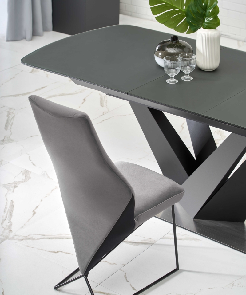 dimensions: 160-200/90/77 cm, extension table, material: glass / lacquered MDF – matt / stainless steel, color: top – dark grey, legs – black