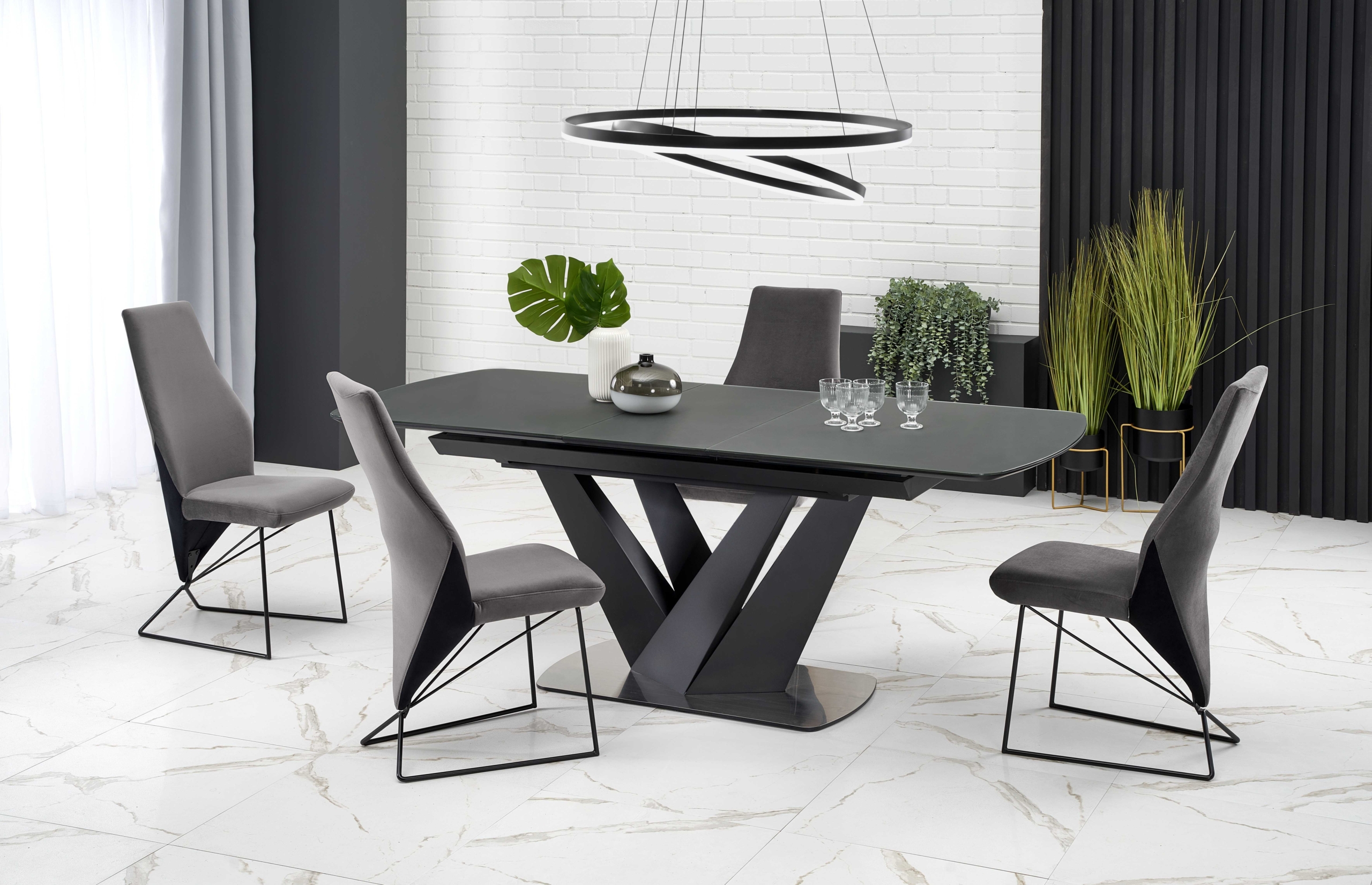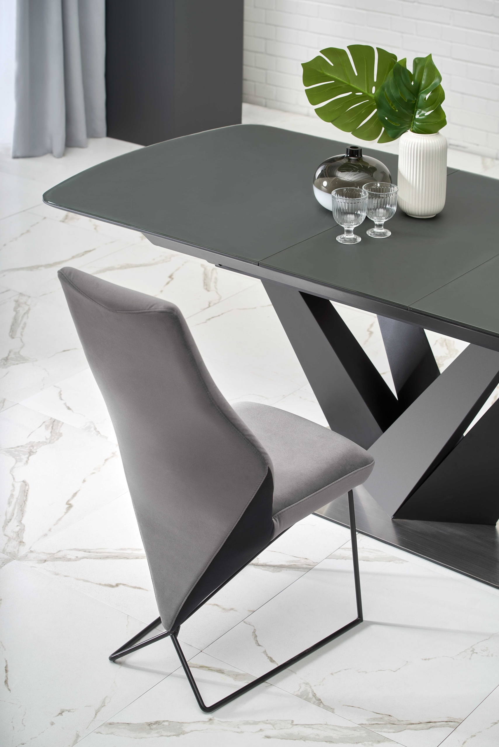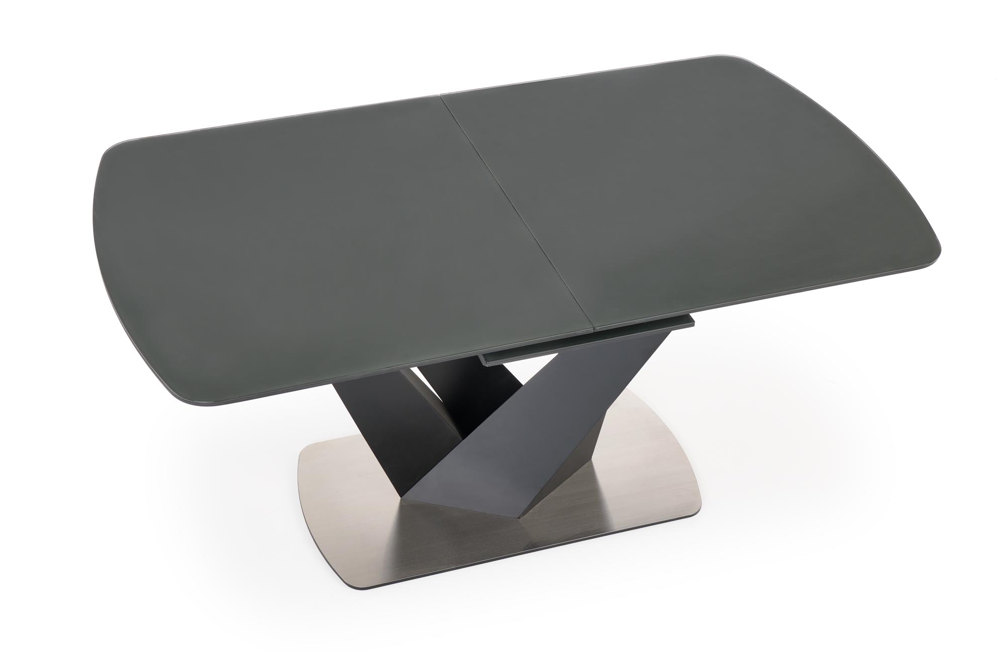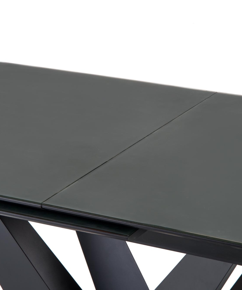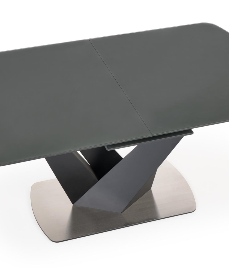 dimensions: 160-200/90/77 cm, extension table, material: glass / lacquered MDF – matt / stainless steel, color: top – dark grey, legs – black