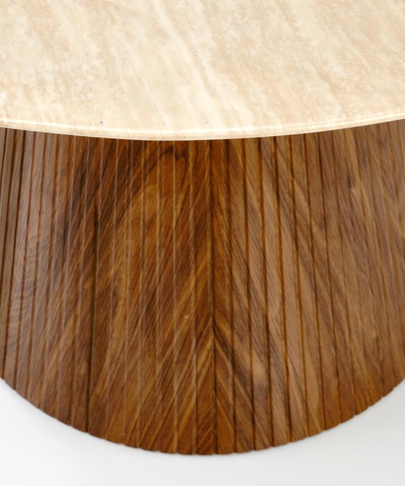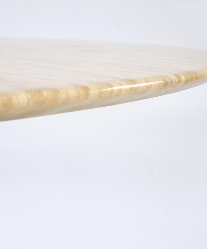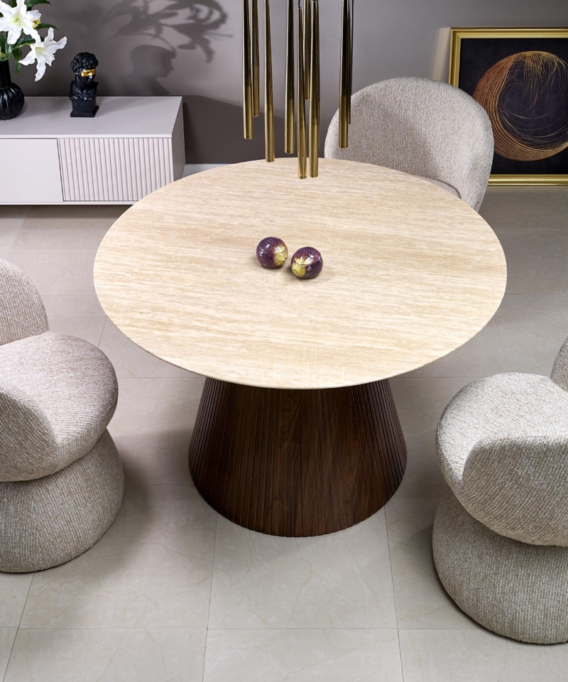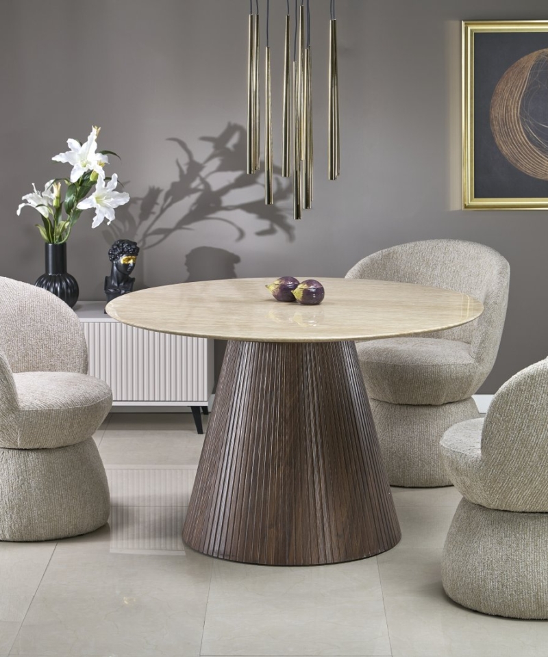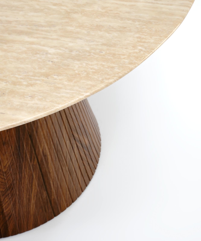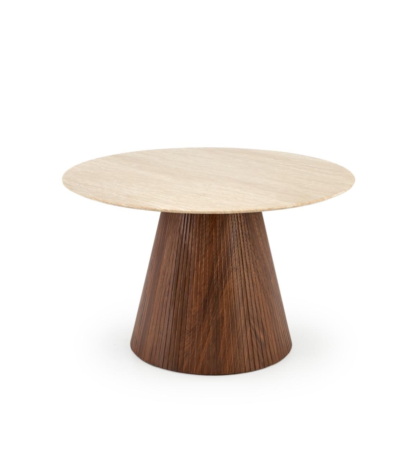 dimensions: fi120/76 cm, material: lacquered marble / laminated MDF, color: top – travertine, legs – walnut