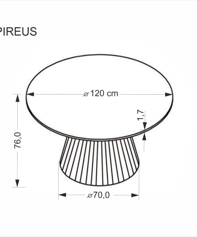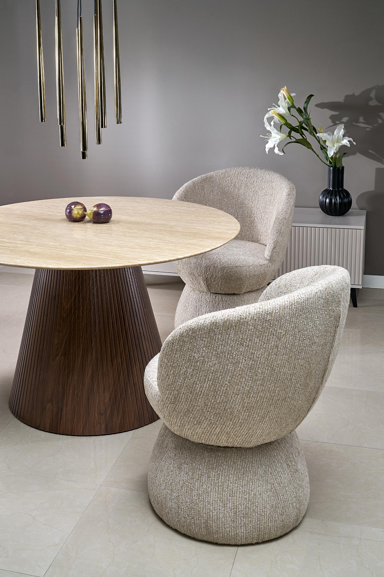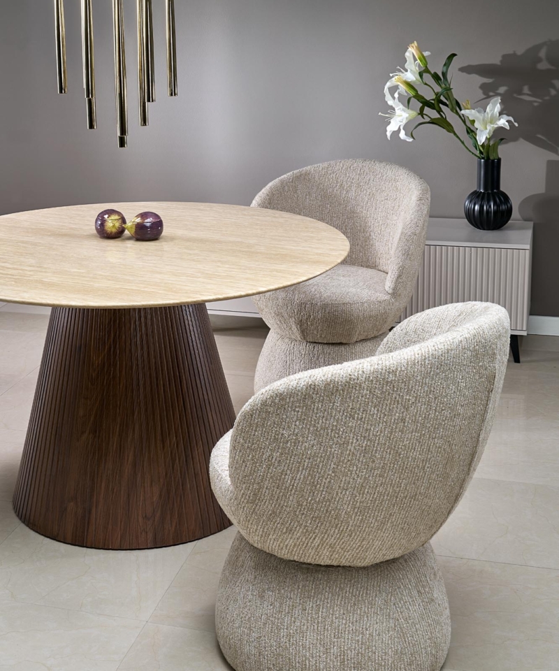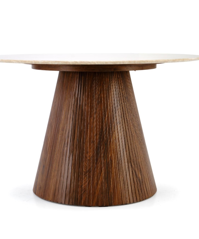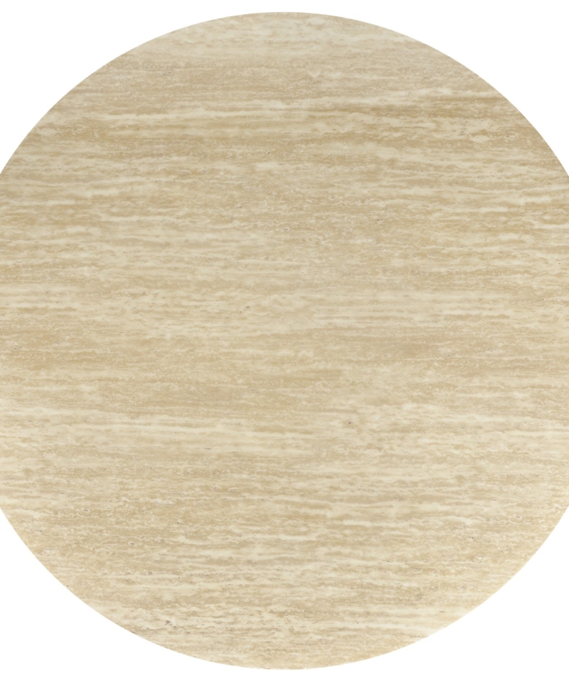 dimensions: fi120/76 cm, material: lacquered marble / laminated MDF, color: top – travertine, legs – walnut