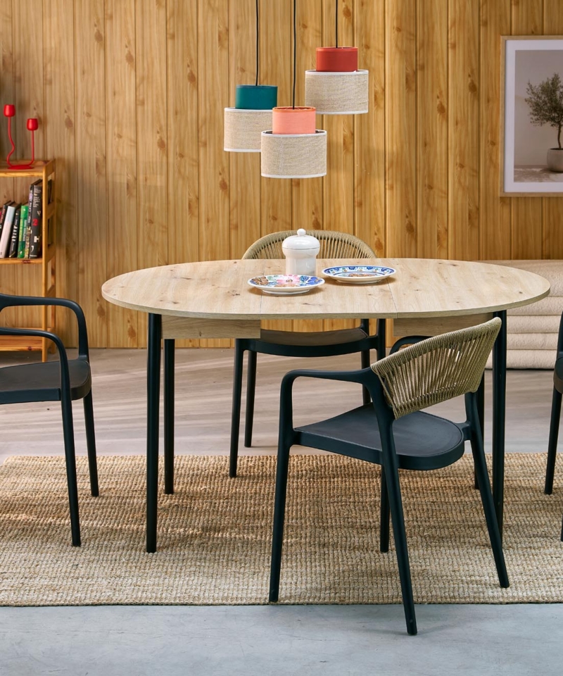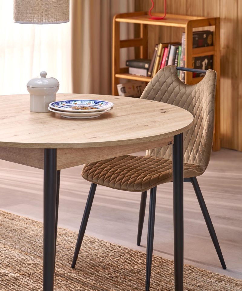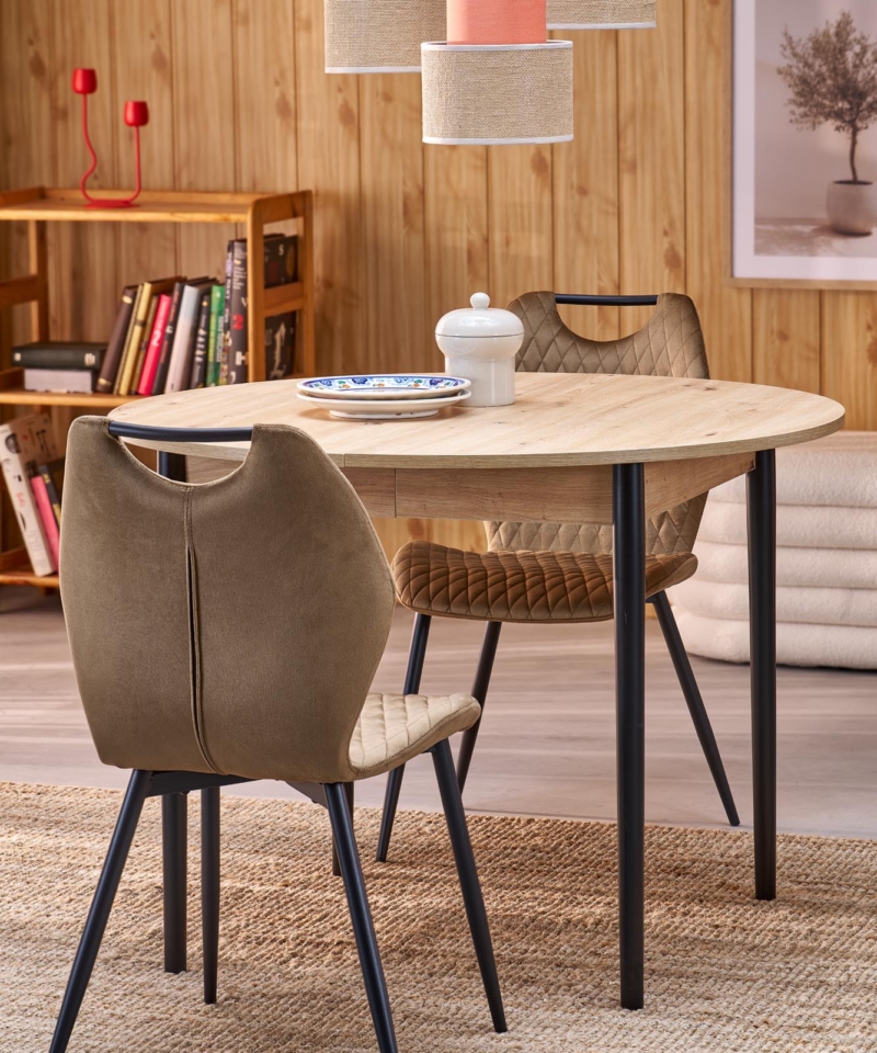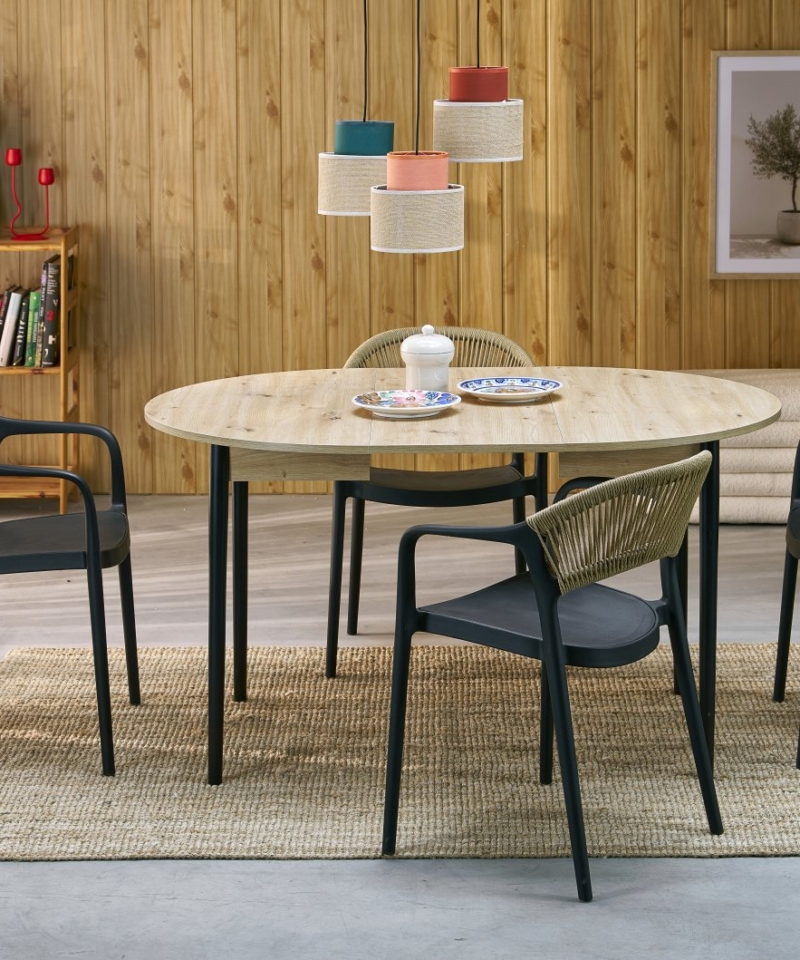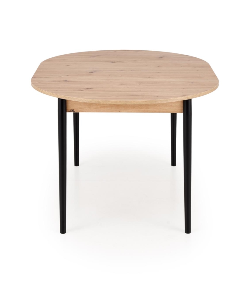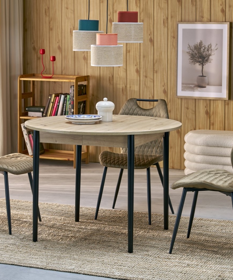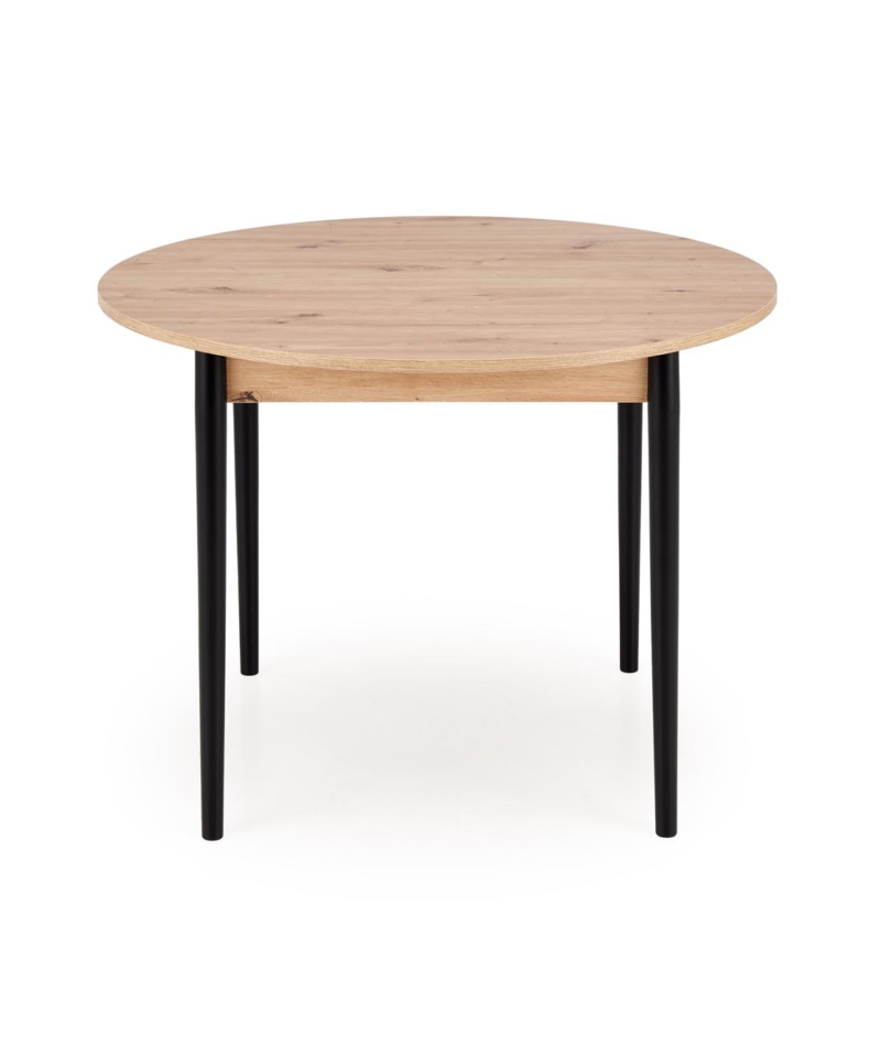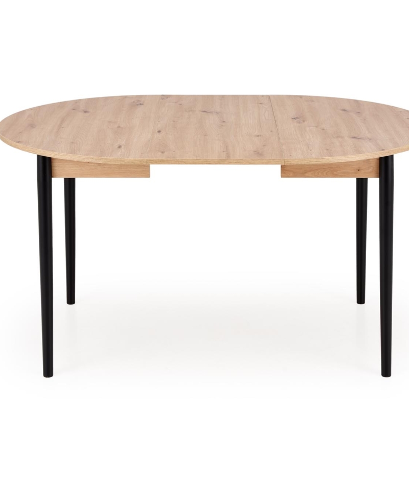 extension table, dimensions: 102-142/102/75 cm, material: laminated chipboard / solid beech wood, color: top – artisan oak, legs – black