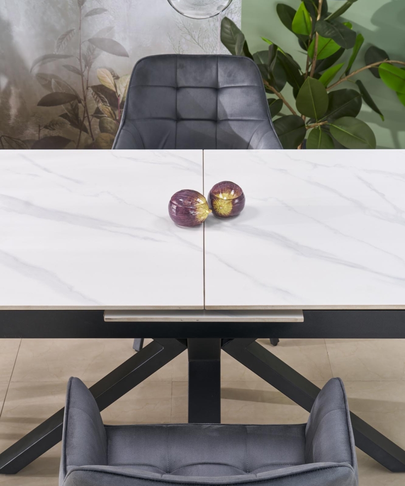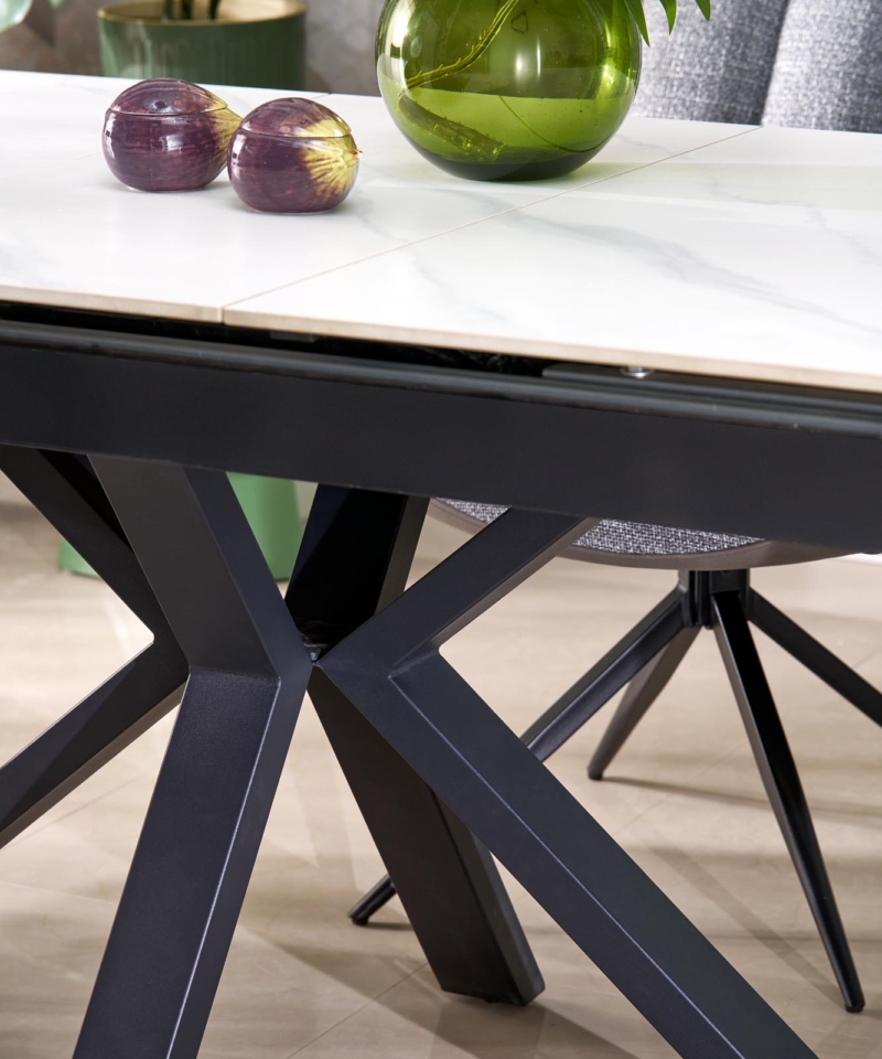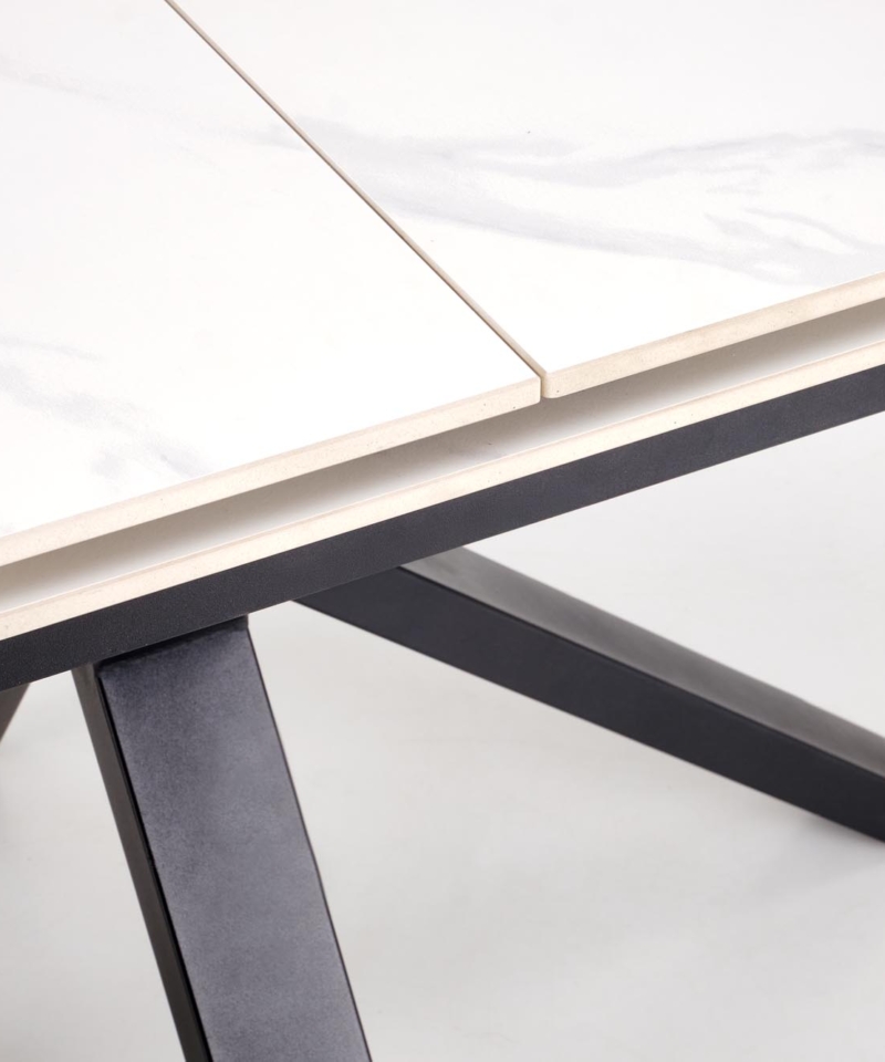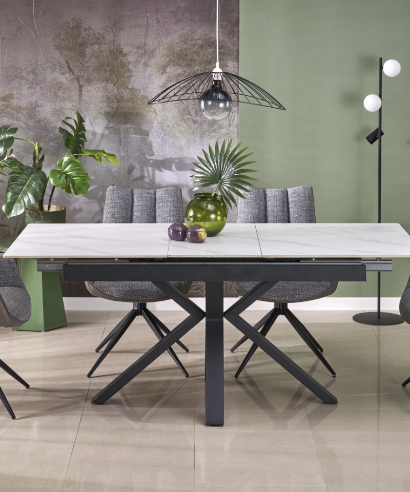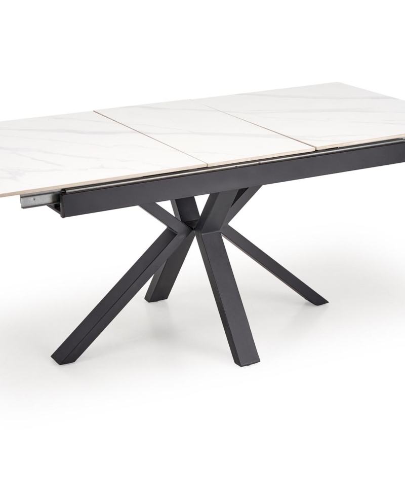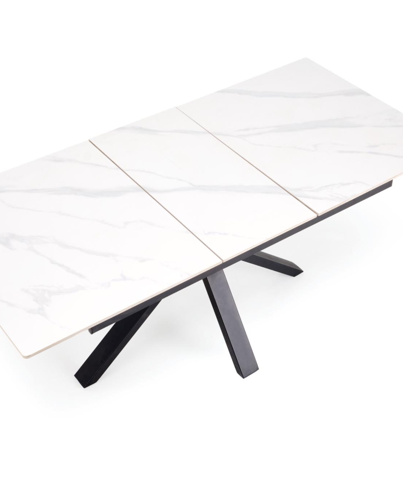 dimensions: 140-180/85/76 cm, extension table, material: sintered stone / powder coated steel, color: top – white marble, legs – black