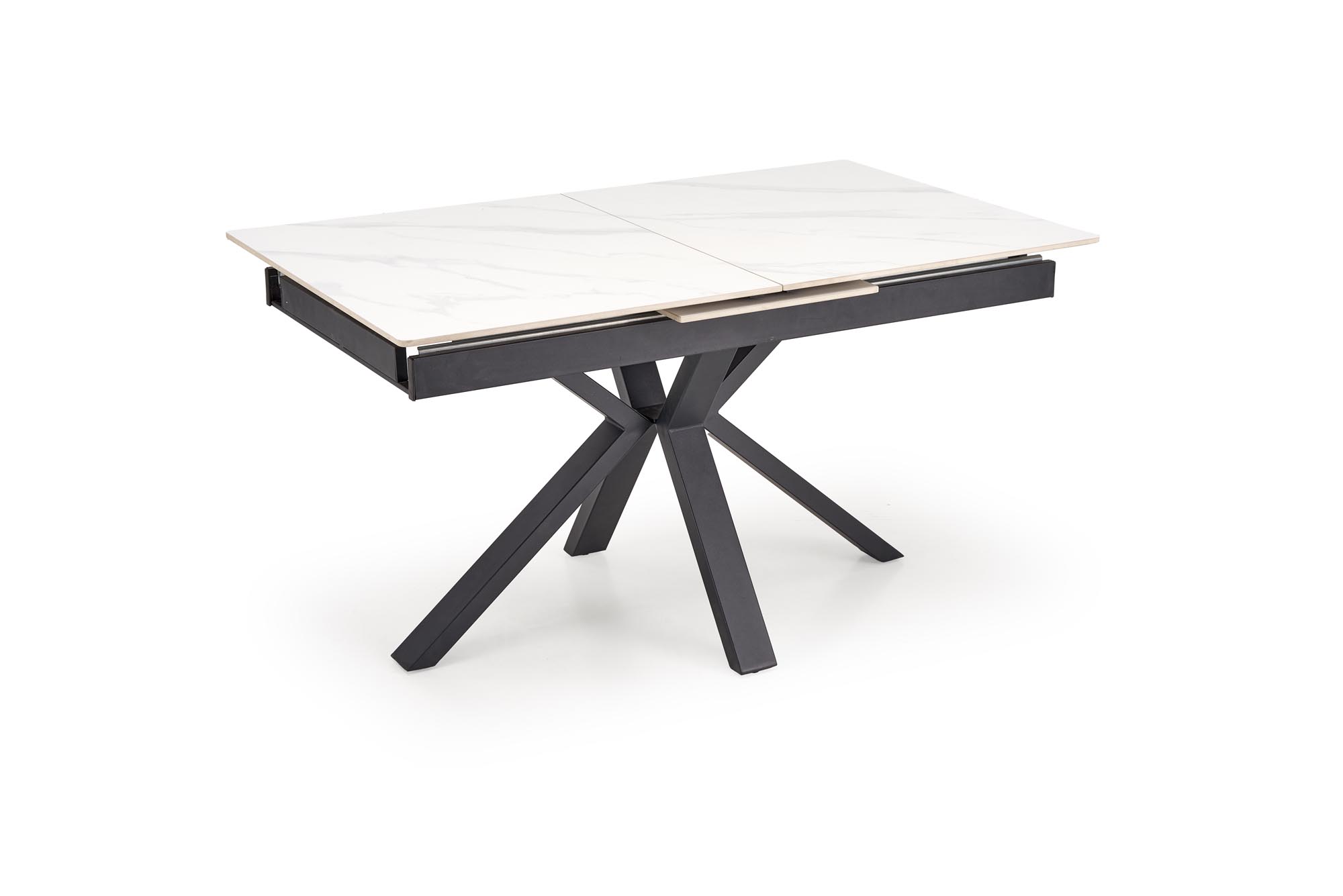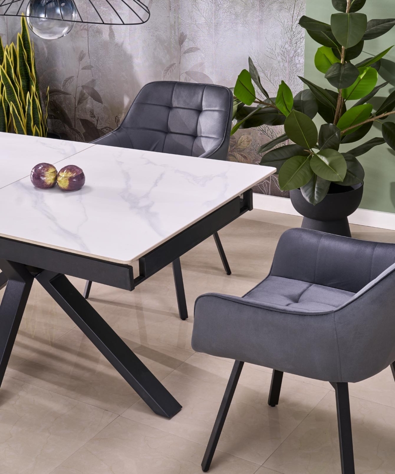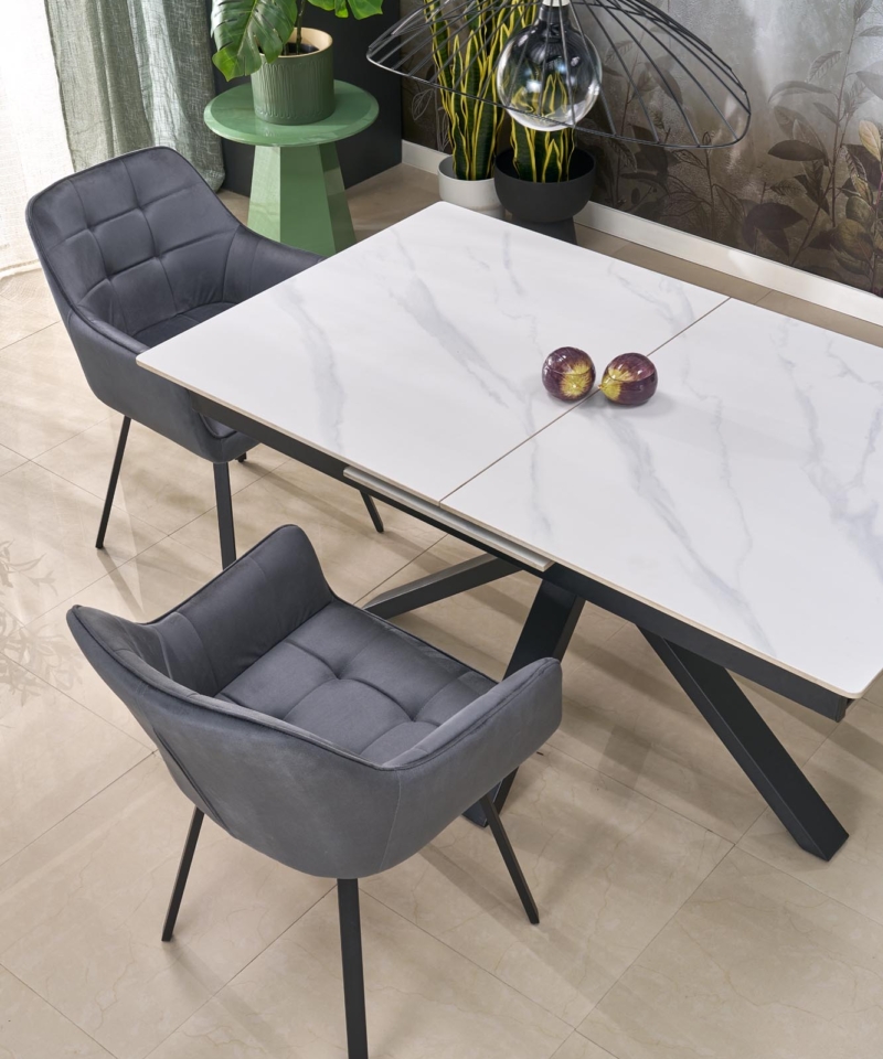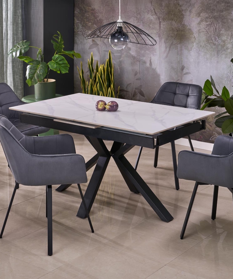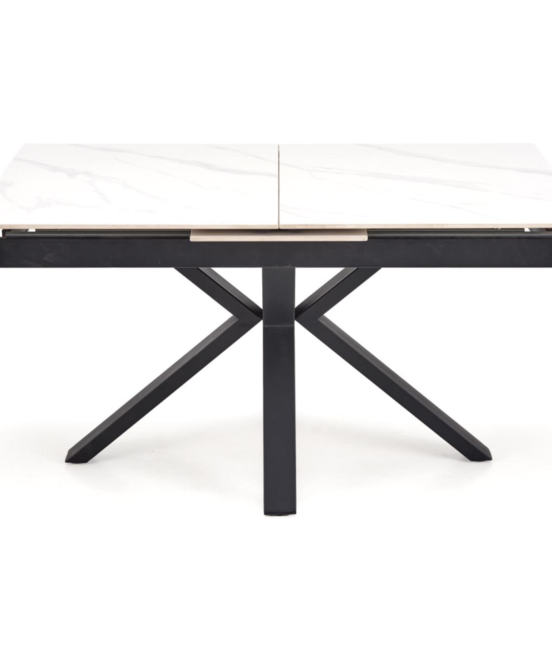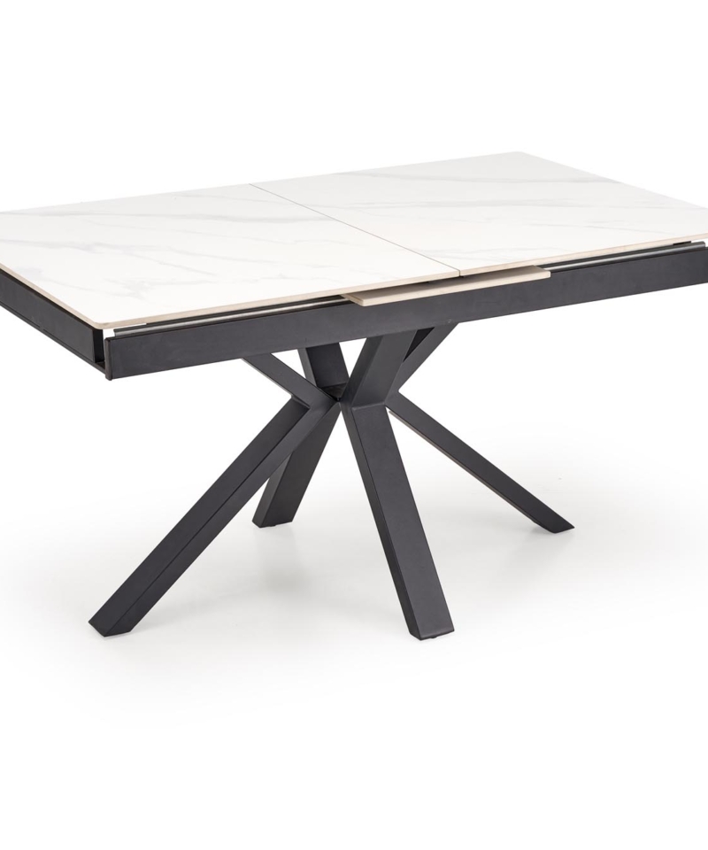 dimensions: 140-180/85/76 cm, extension table, material: sintered stone / powder coated steel, color: top – white marble, legs – black