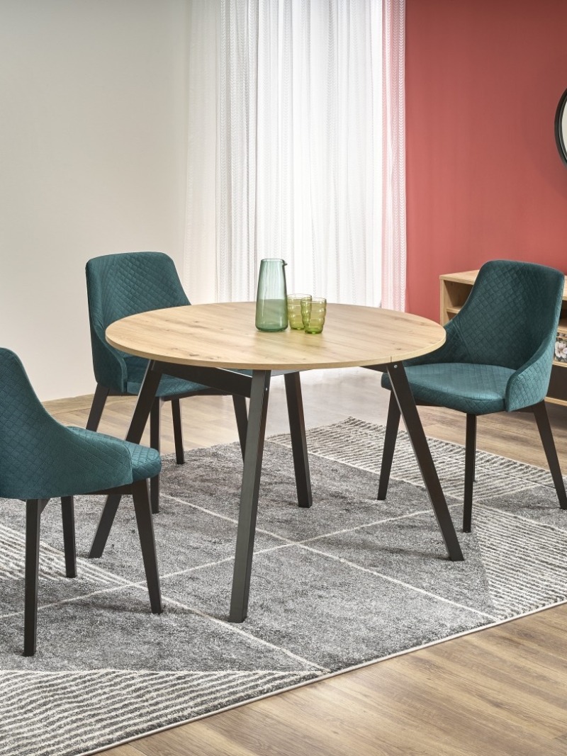 dimensions: 102-142/102/73 cm, extension table, material: laminated chipboard / solid beech wood, color: top – artisan oak, legs – black
