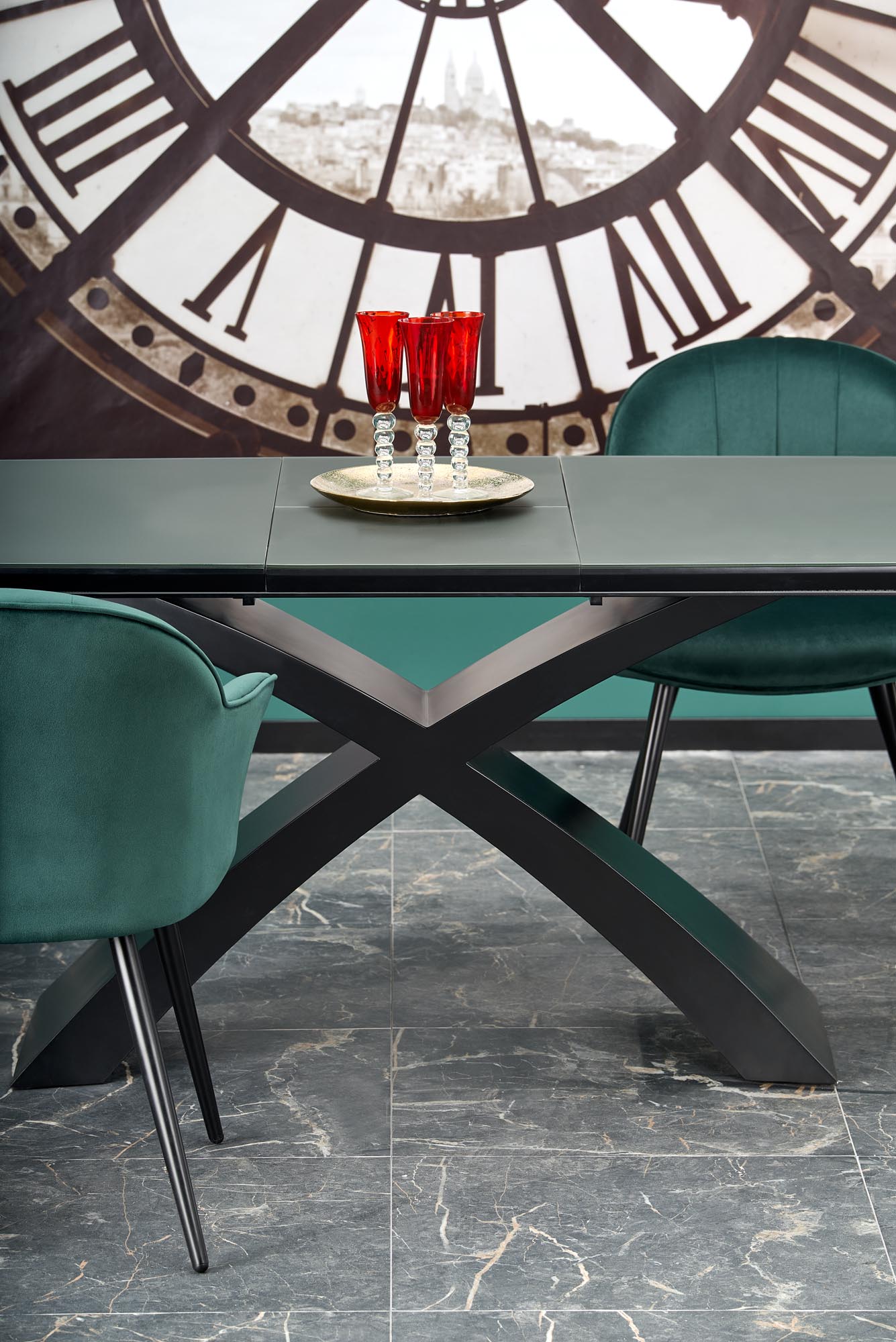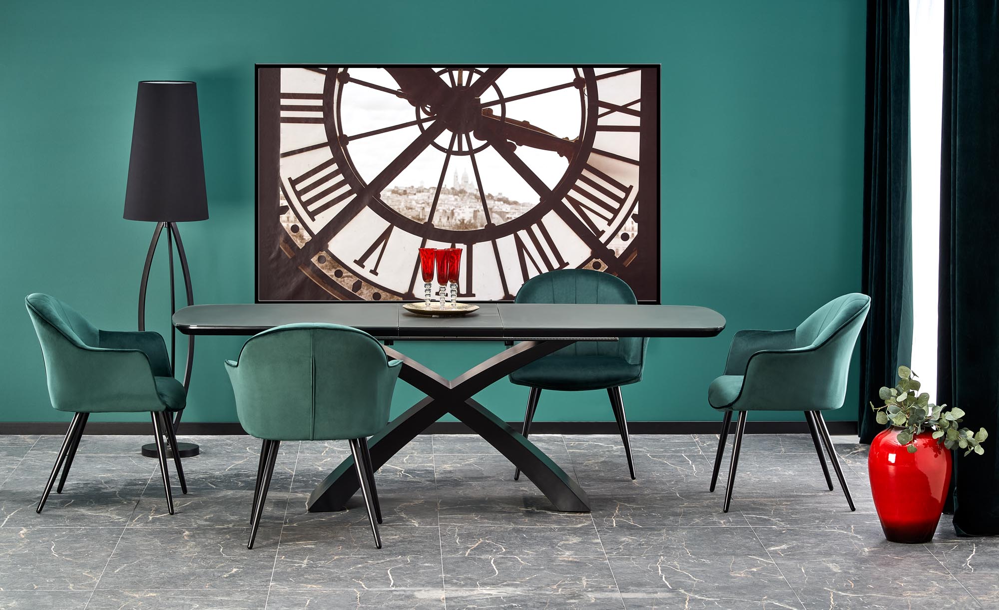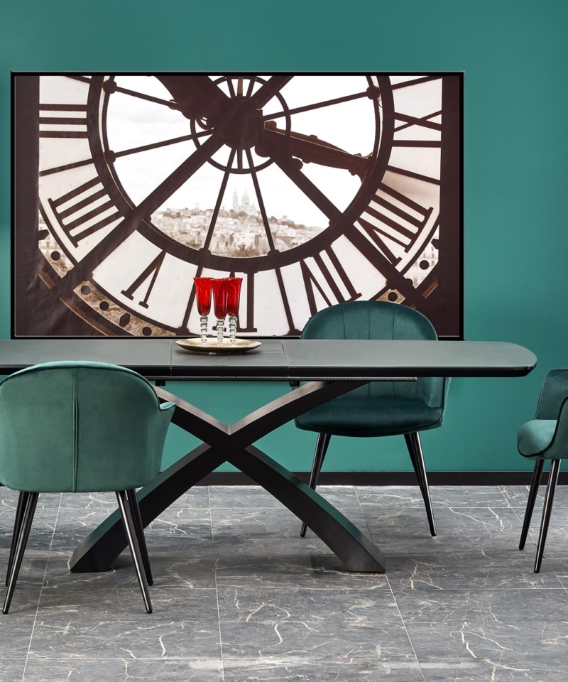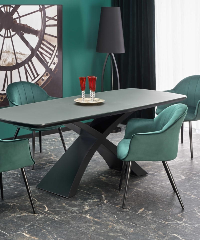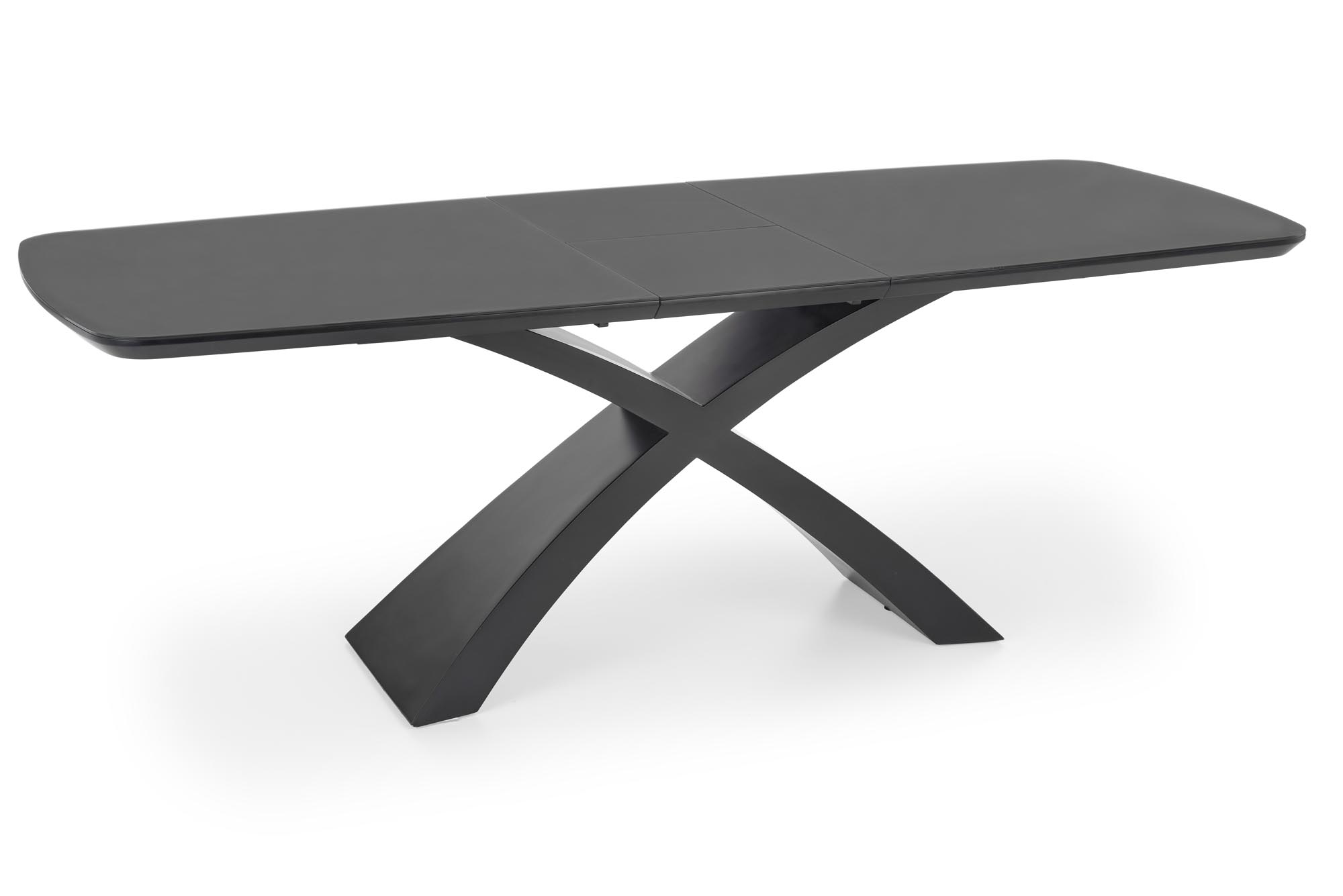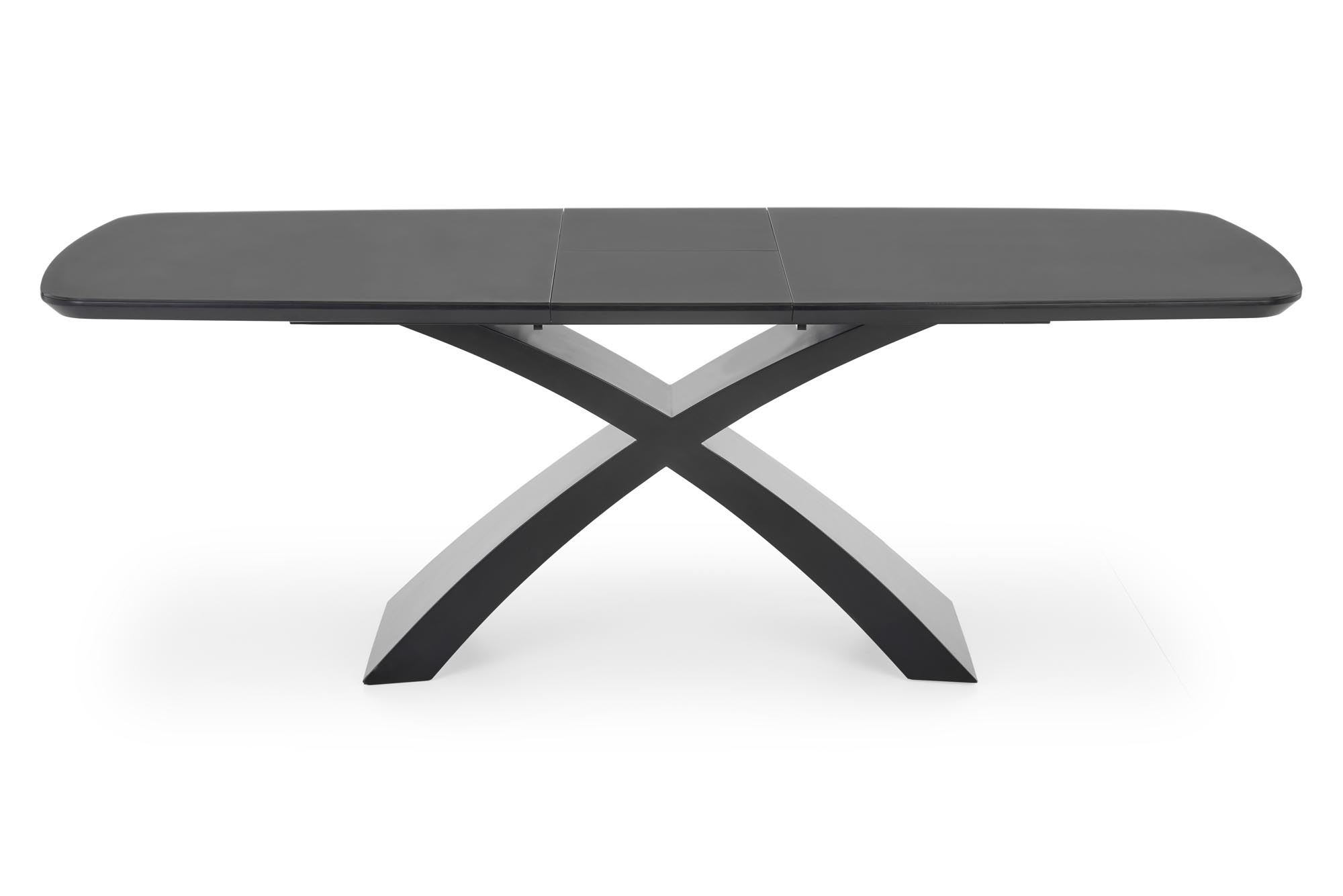 dimensions: 180-220/89/75 cm, extension table, material: glass / lacquered MDF, color: top – dark grey, legs – black