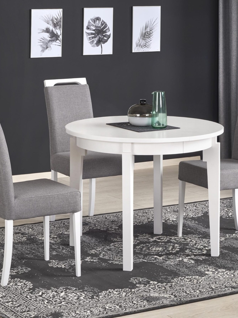 dimensions: 100÷200/100/77 cm, extension table, material: MDF + natural oak veneer / solid wood – beech, color: top – white, legs – white