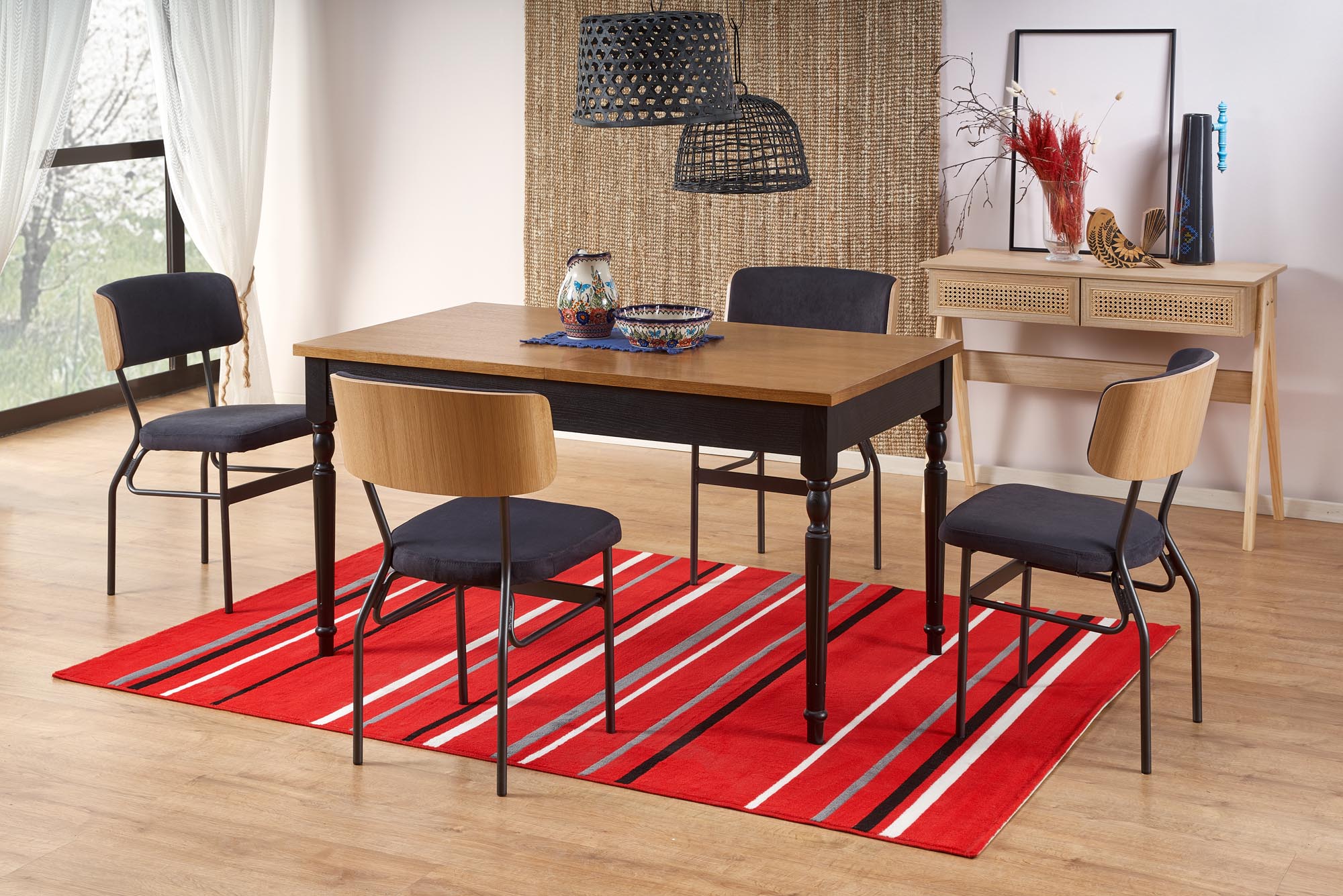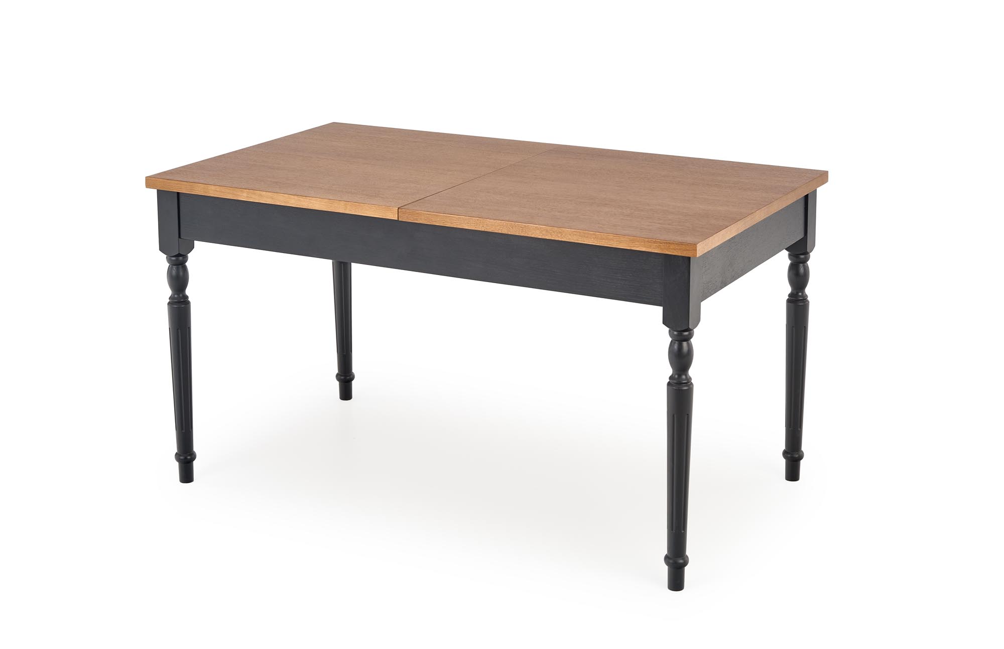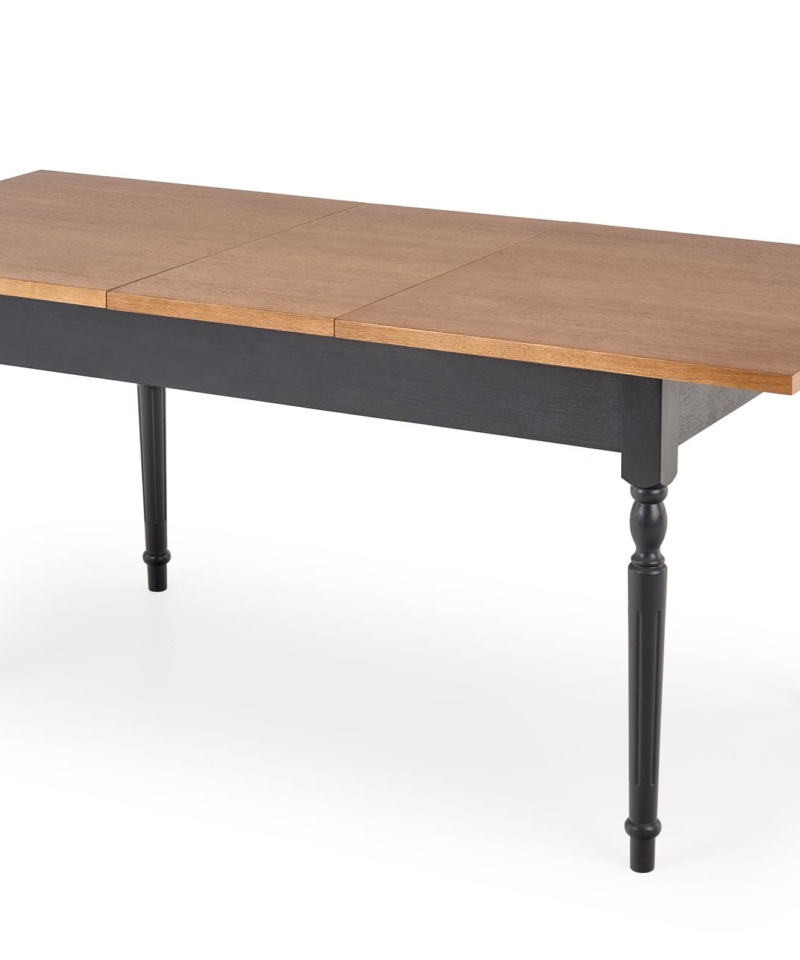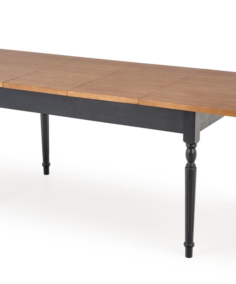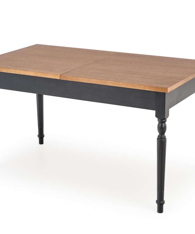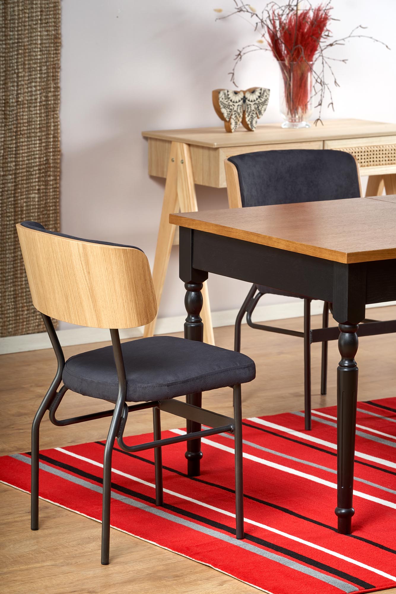 dimensions: 120-160/120/75 cm, extension table, material: laminated chipbiard + natural veneer – oak / lacquered MDF / solid beech wood, color: top – dark oak, legs – black