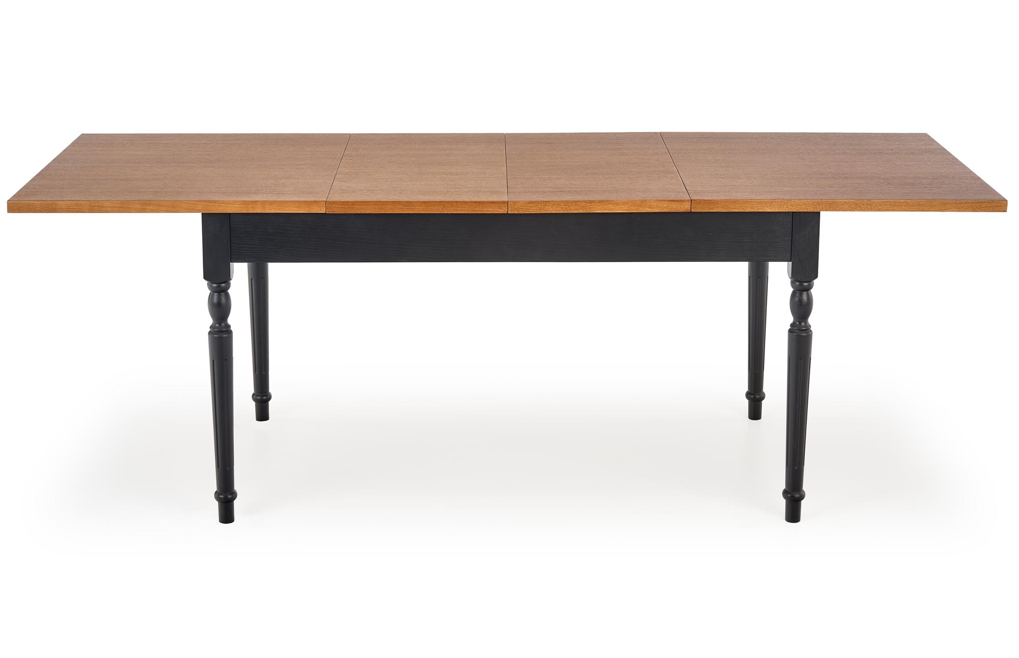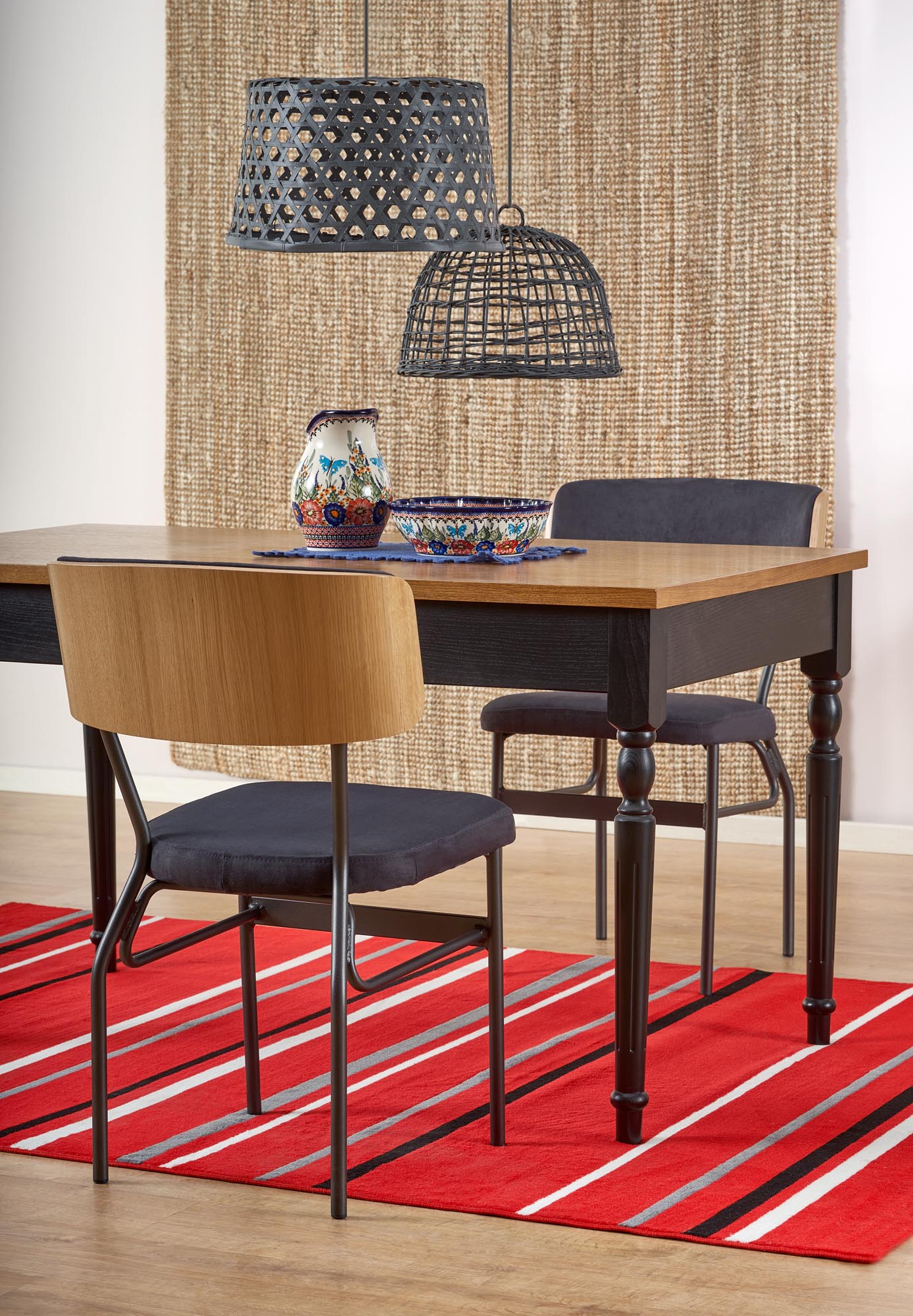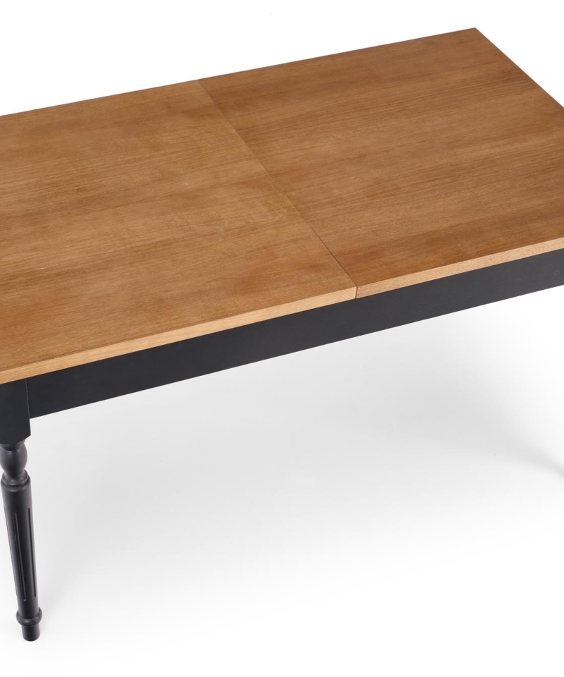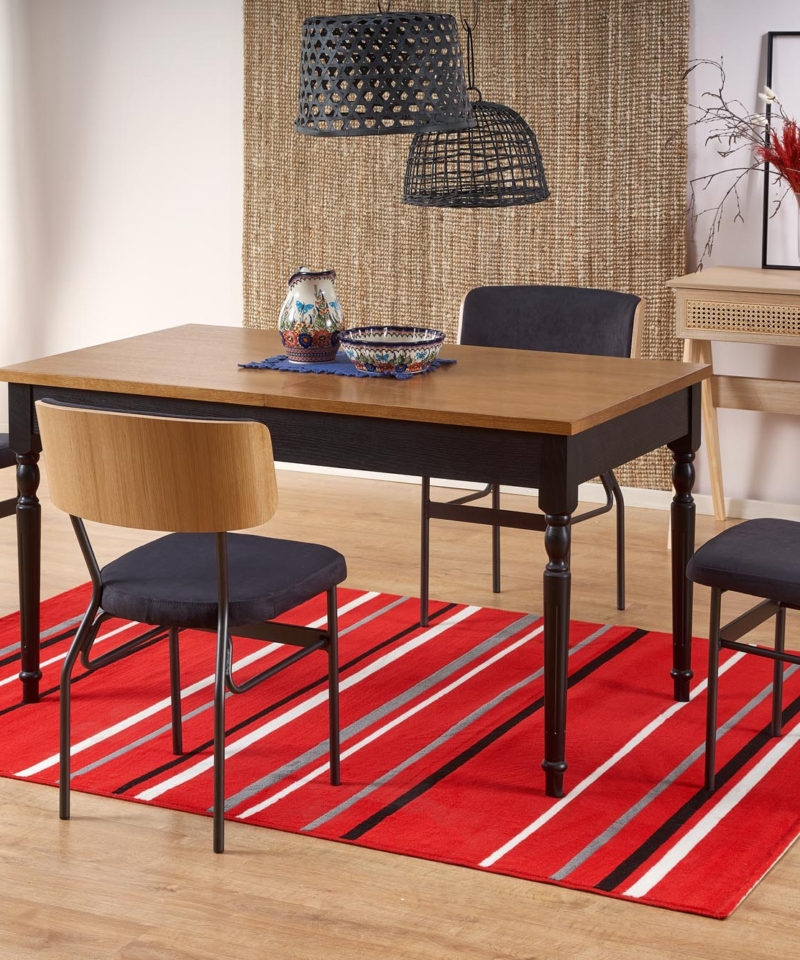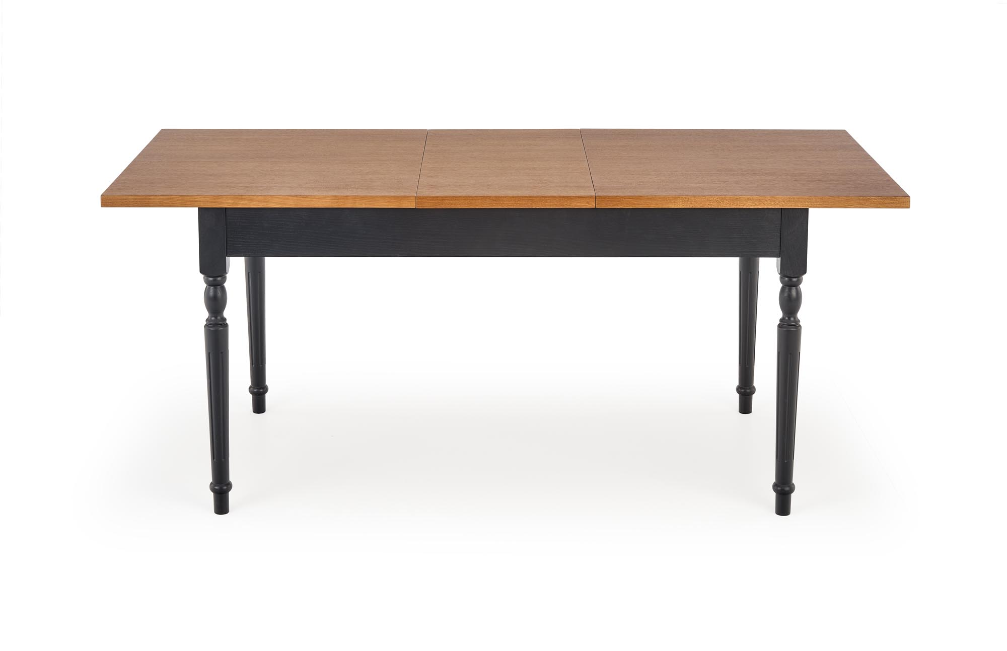 dimensions: 120-160/120/75 cm, extension table, material: laminated chipbiard + natural veneer – oak / lacquered MDF / solid beech wood, color: top – dark oak, legs – black