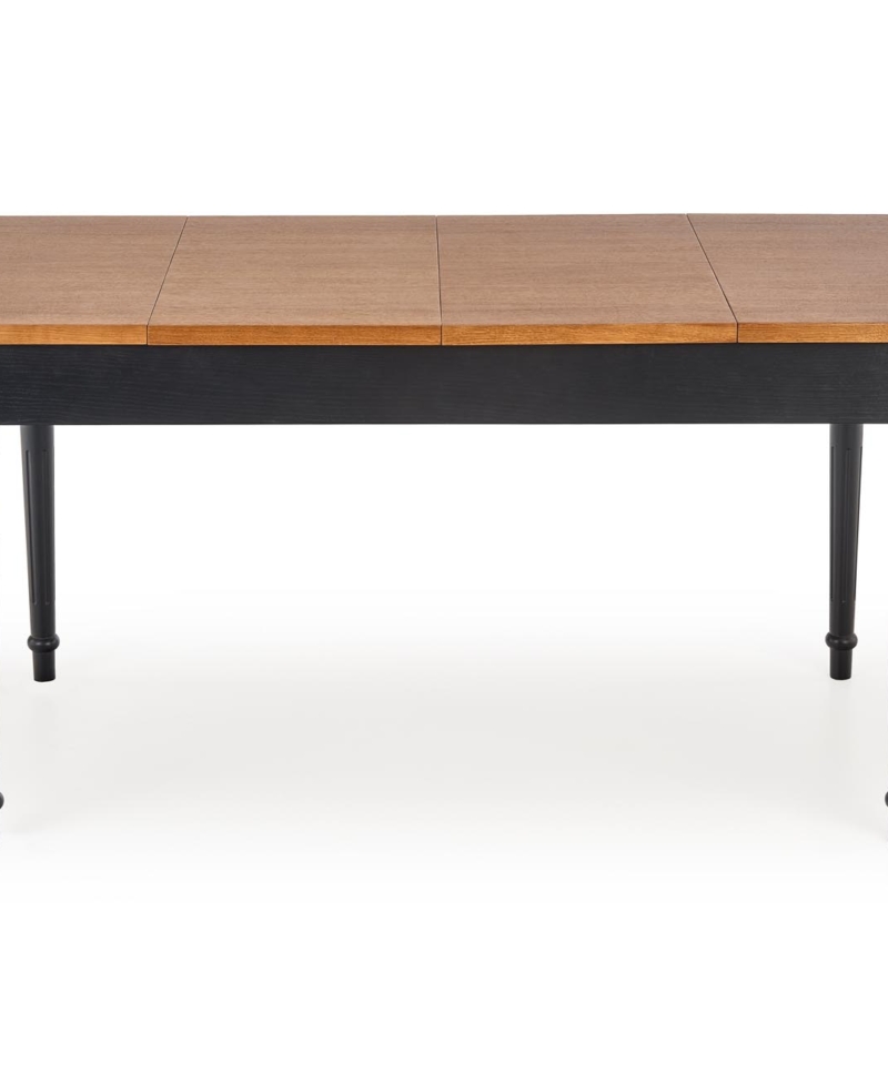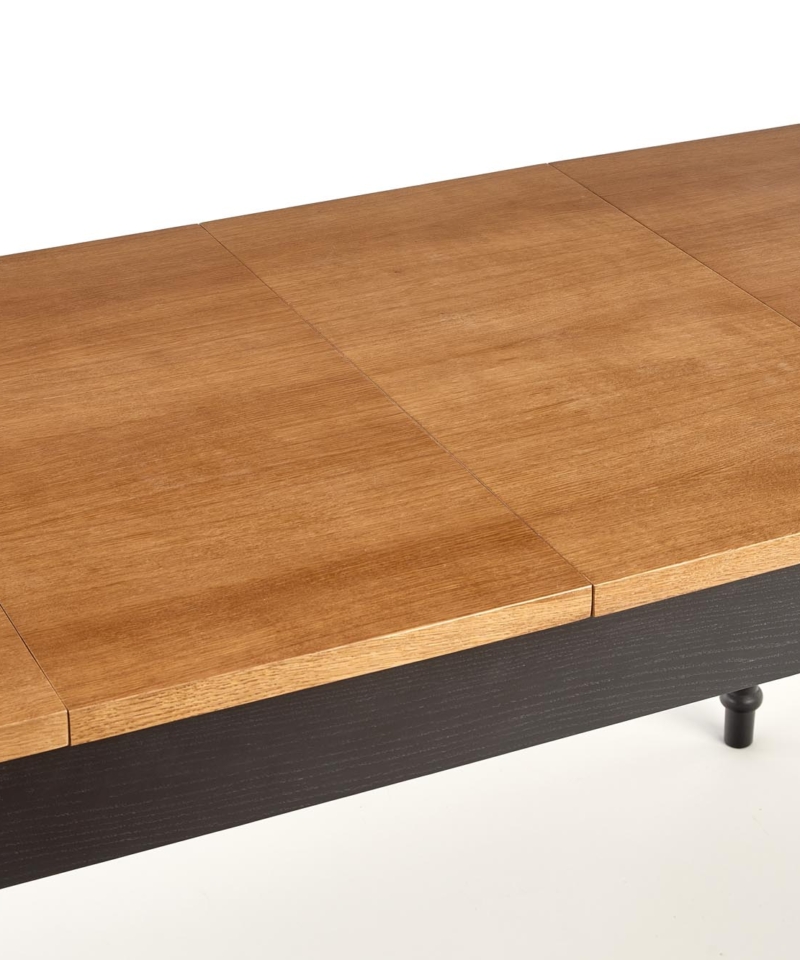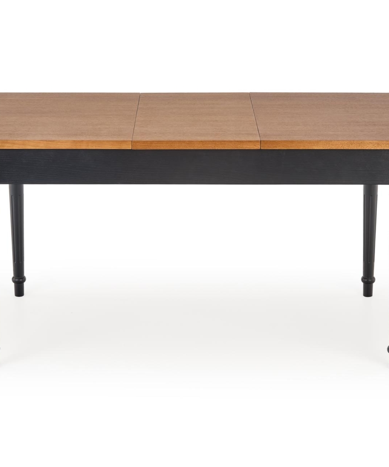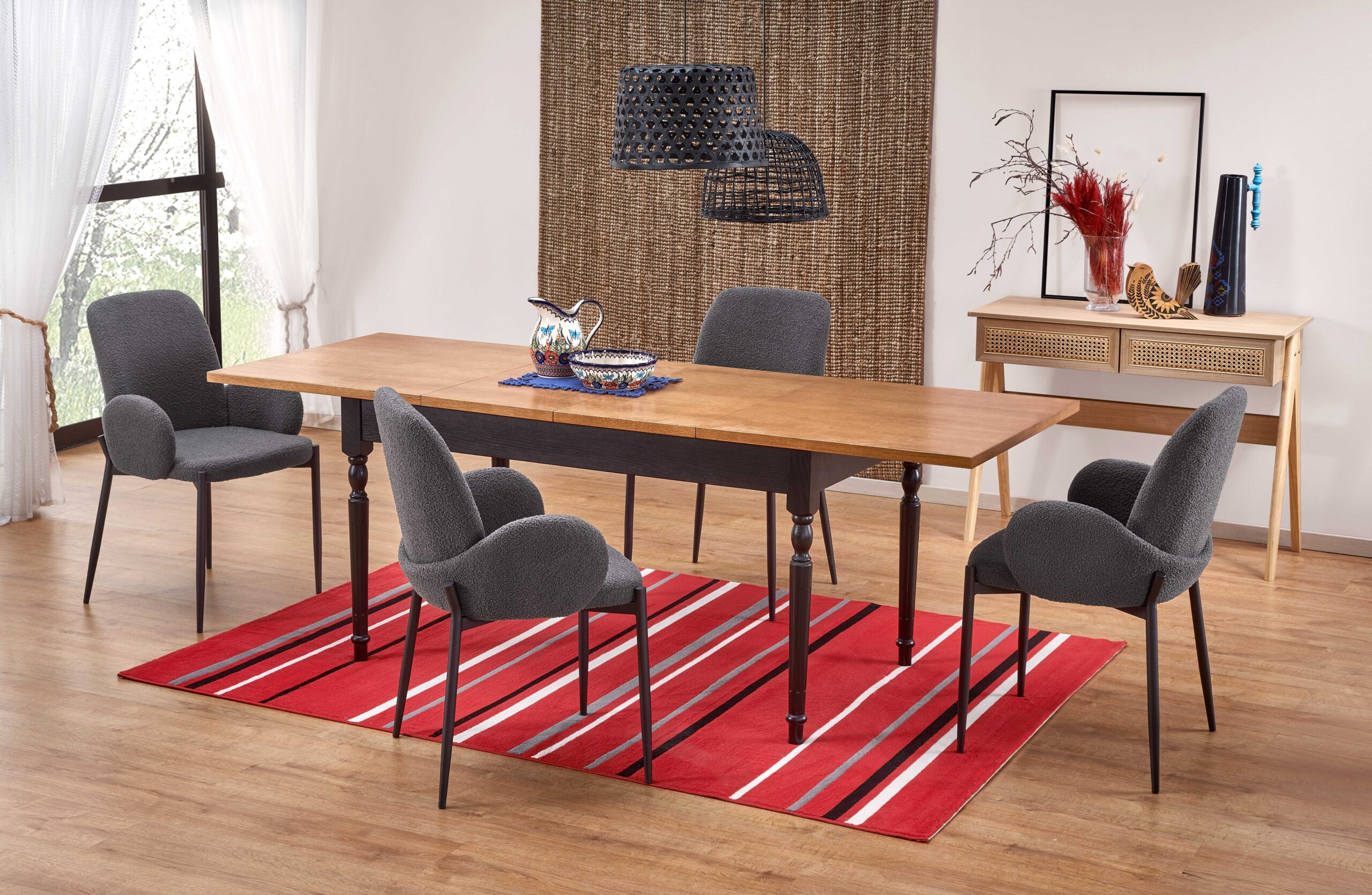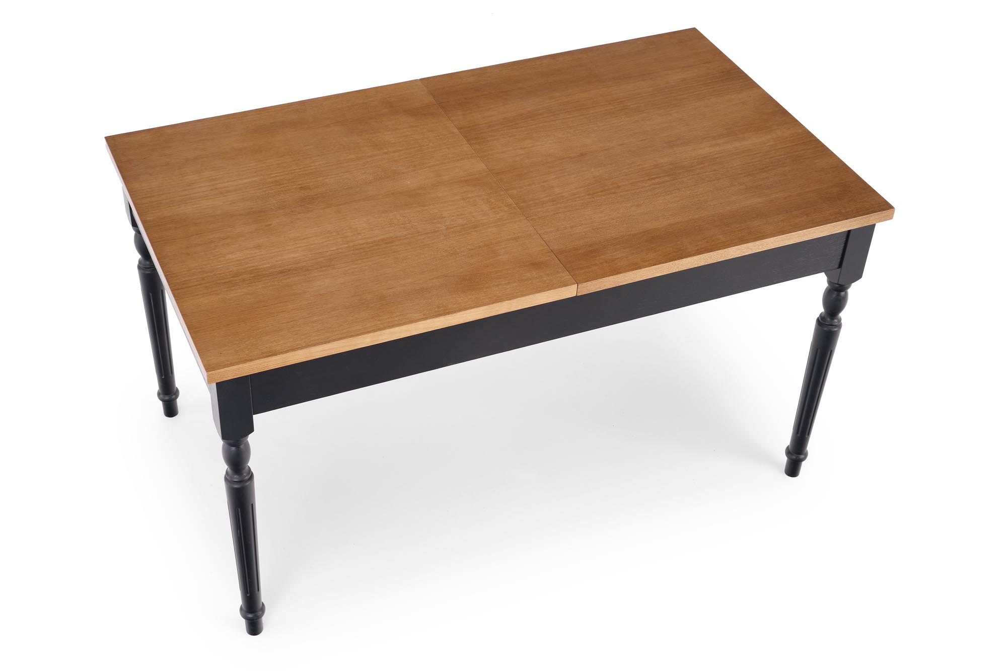 dimensions: 120-160/120/75 cm, extension table, material: laminated chipbiard + natural veneer – oak / lacquered MDF / solid beech wood, color: top – dark oak, legs – black
