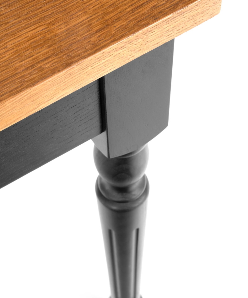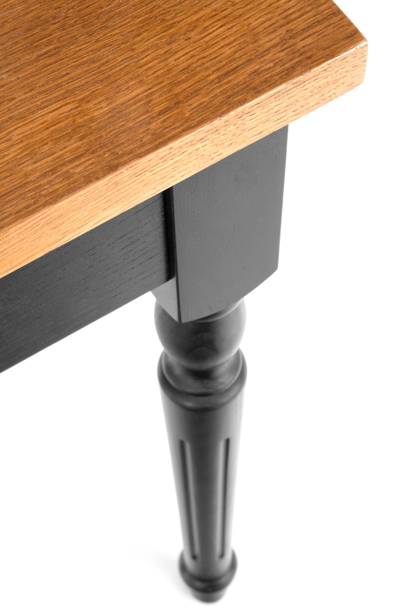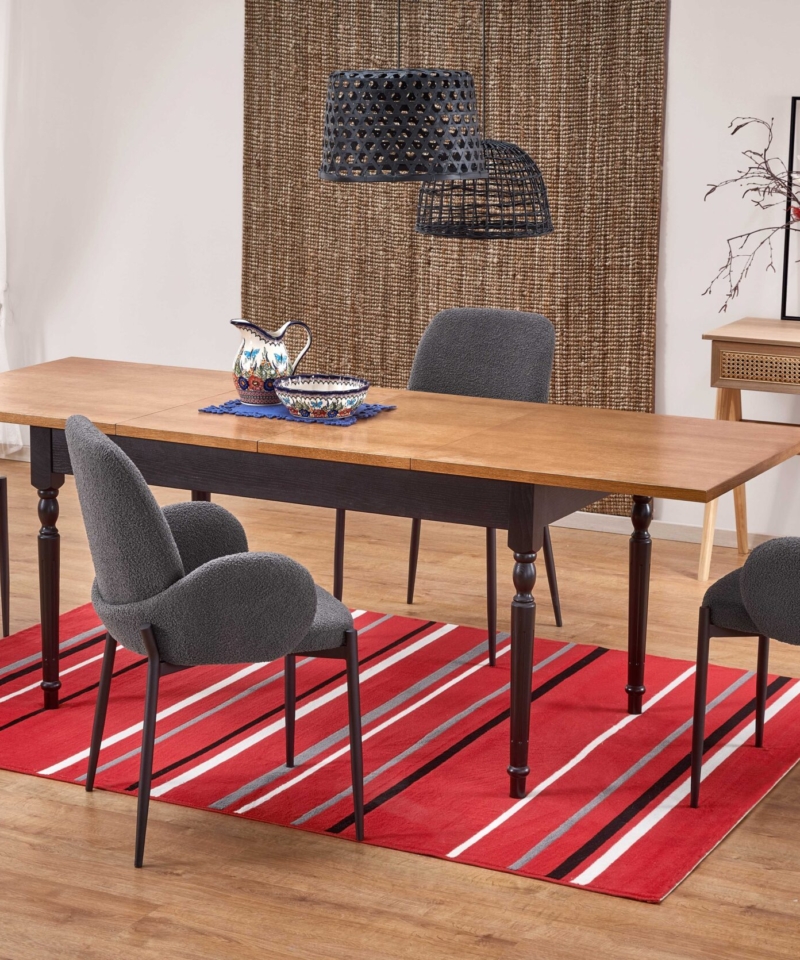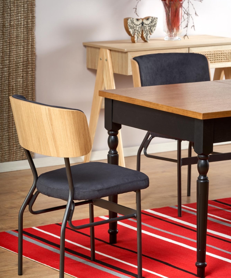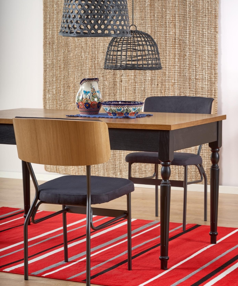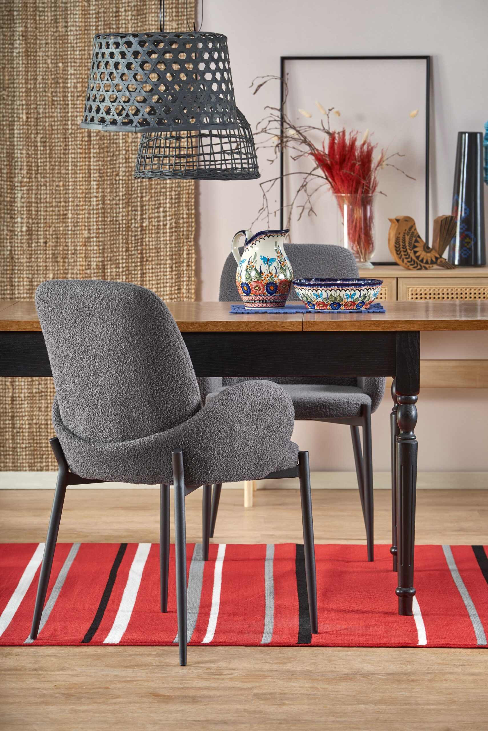dimensions: 120-160/120/75 cm, extension table, material: laminated chipbiard + natural veneer – oak / lacquered MDF / solid beech wood, color: top – dark oak, legs – black