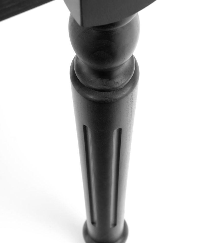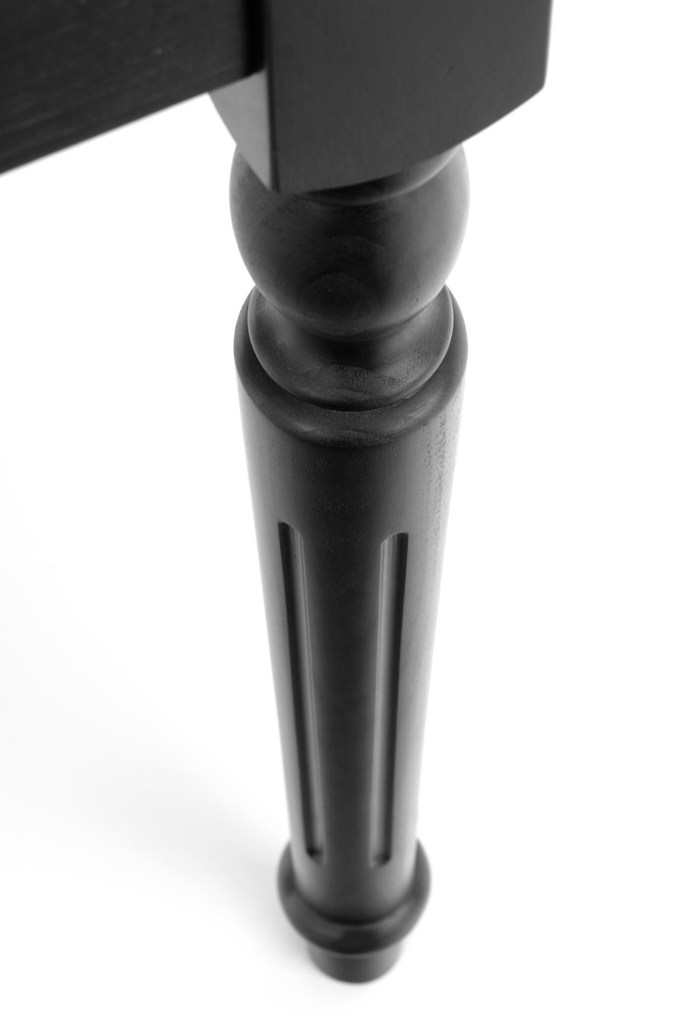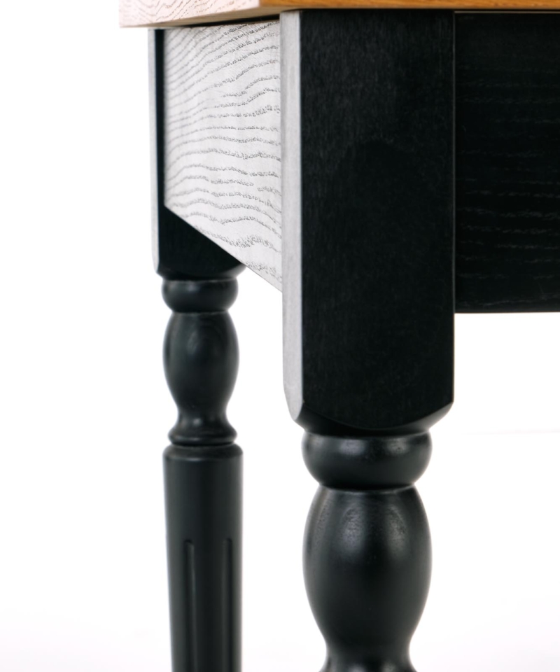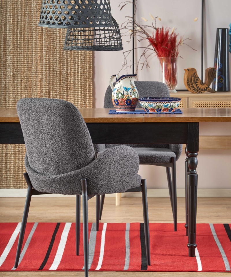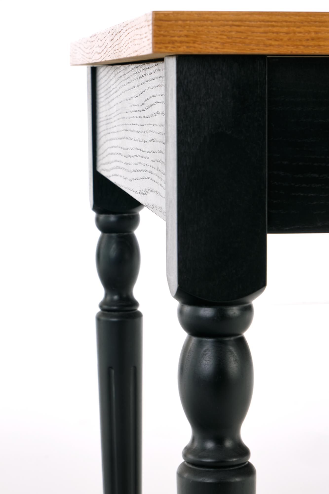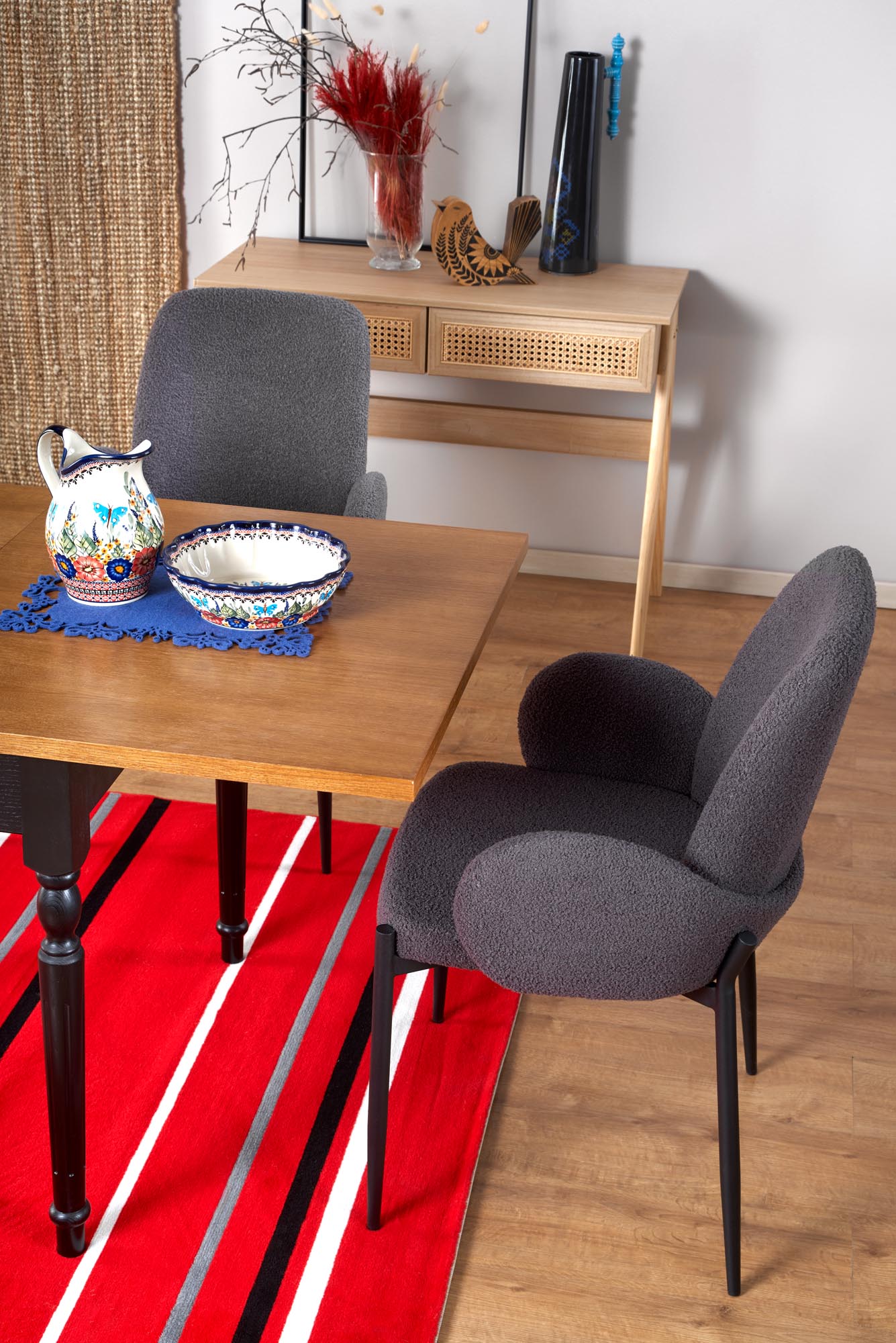 dimensions: 120-160/120/75 cm, extension table, material: laminated chipbiard + natural veneer – oak / lacquered MDF / solid beech wood, color: top – dark oak, legs – black