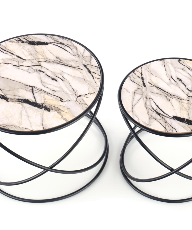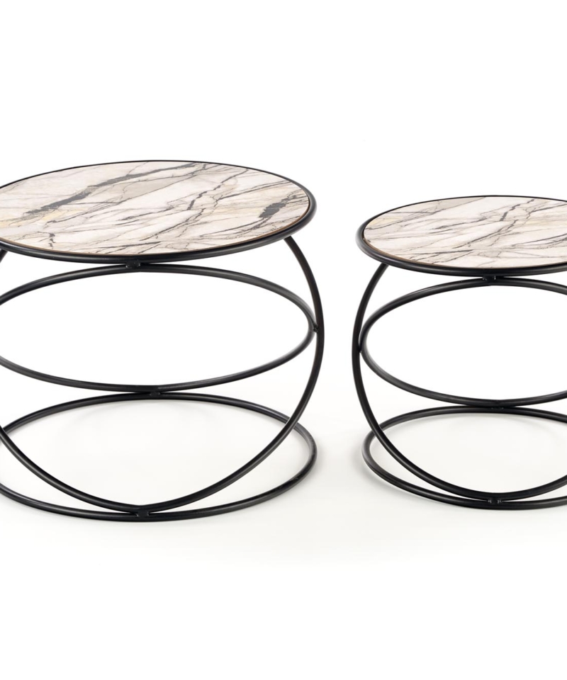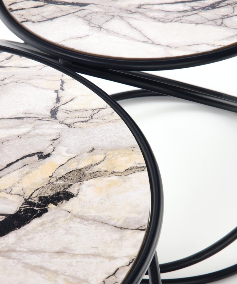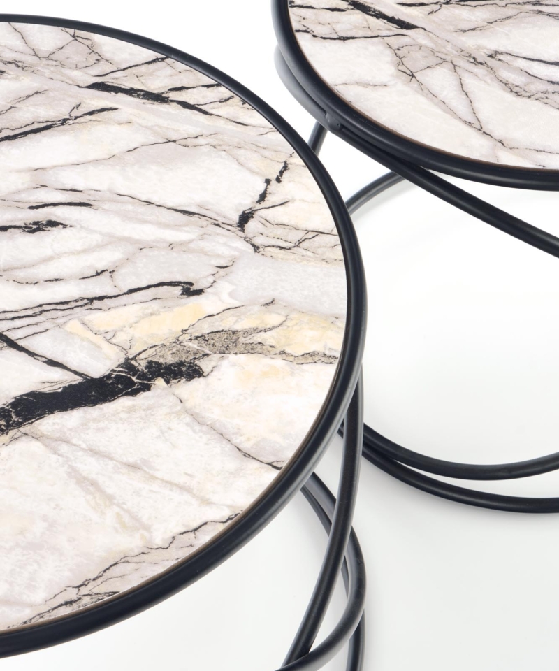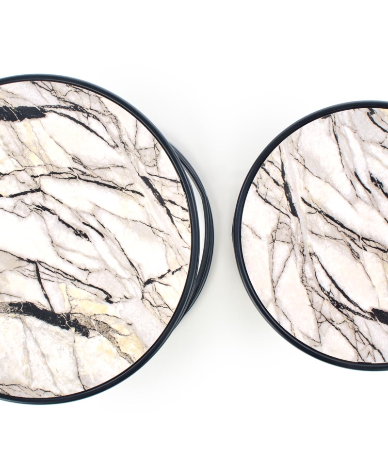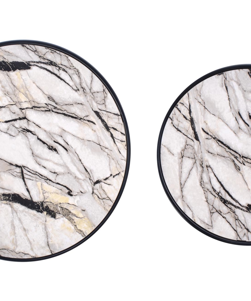 set of 2 benches, dimensions: fi 40/35 cm and fi 50/39 cm, material: laminated MDF / powder coated steel, color: white marble – black