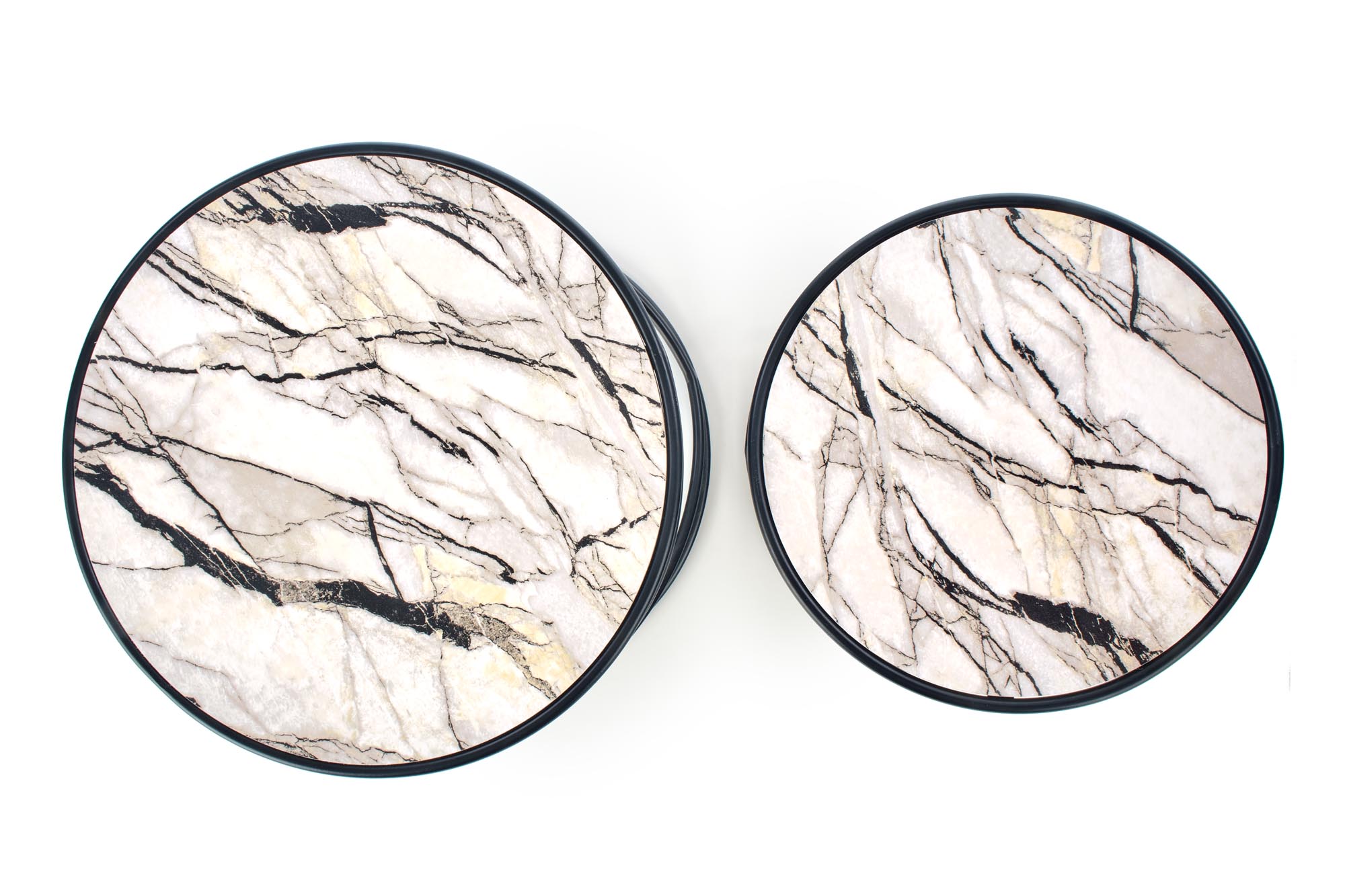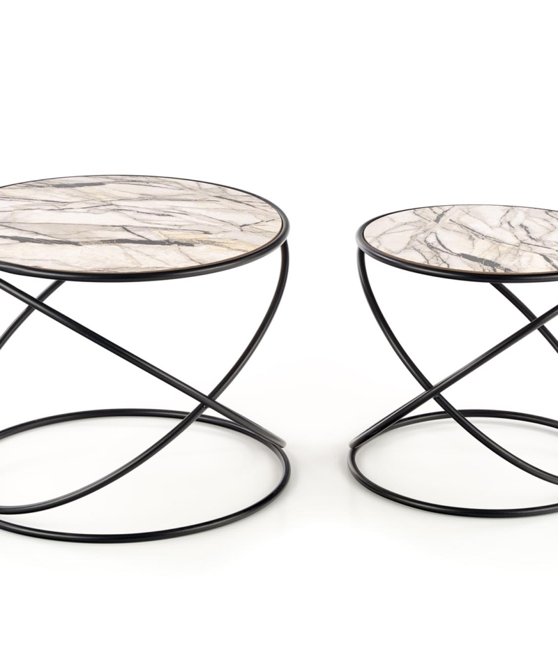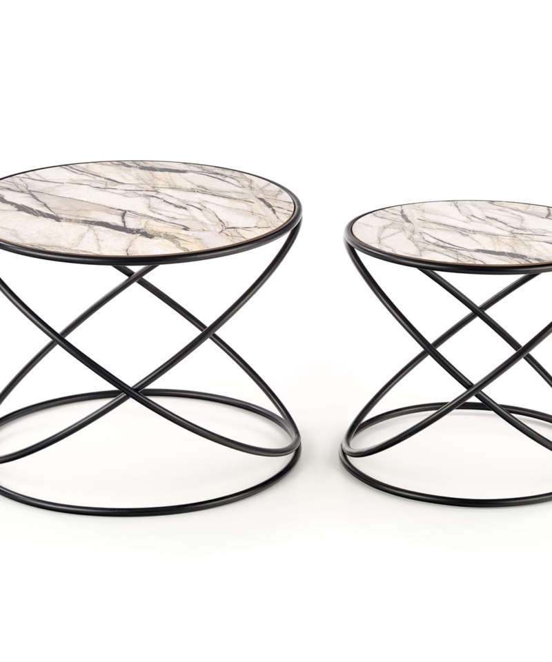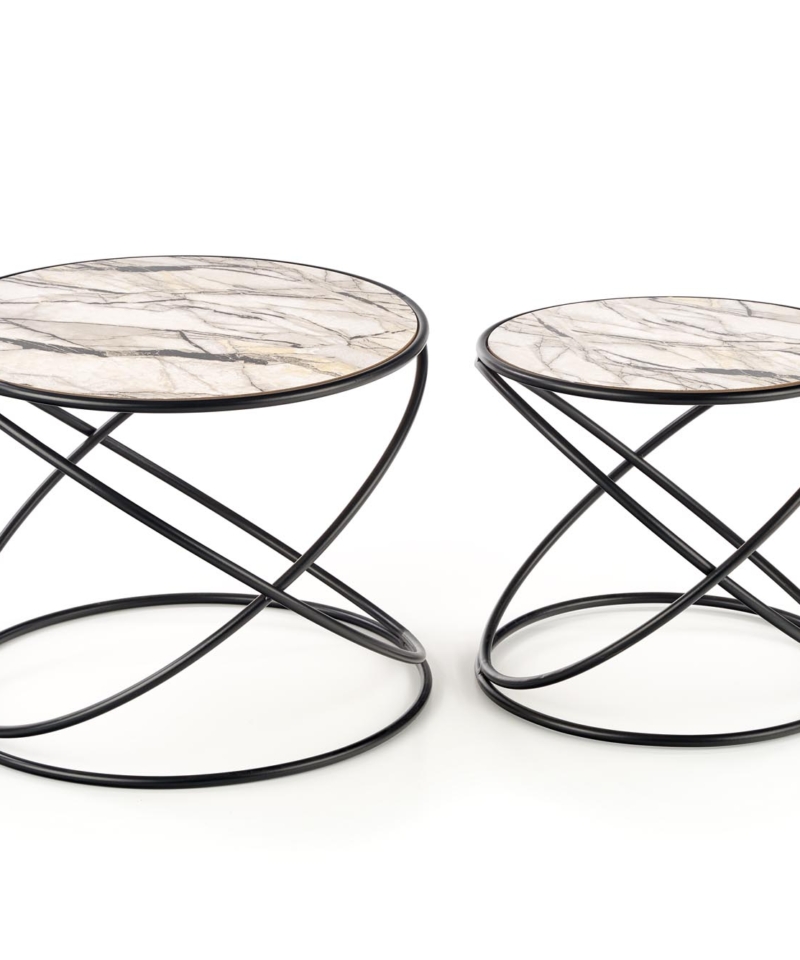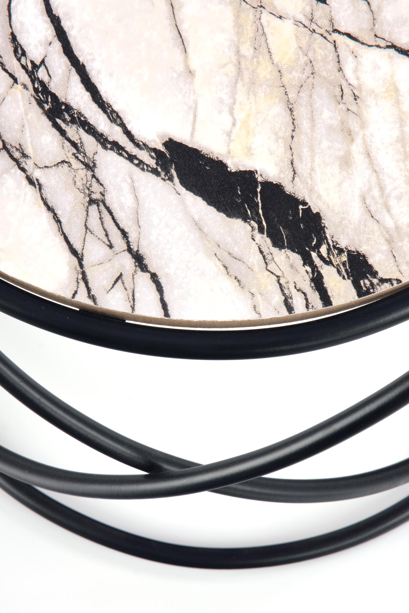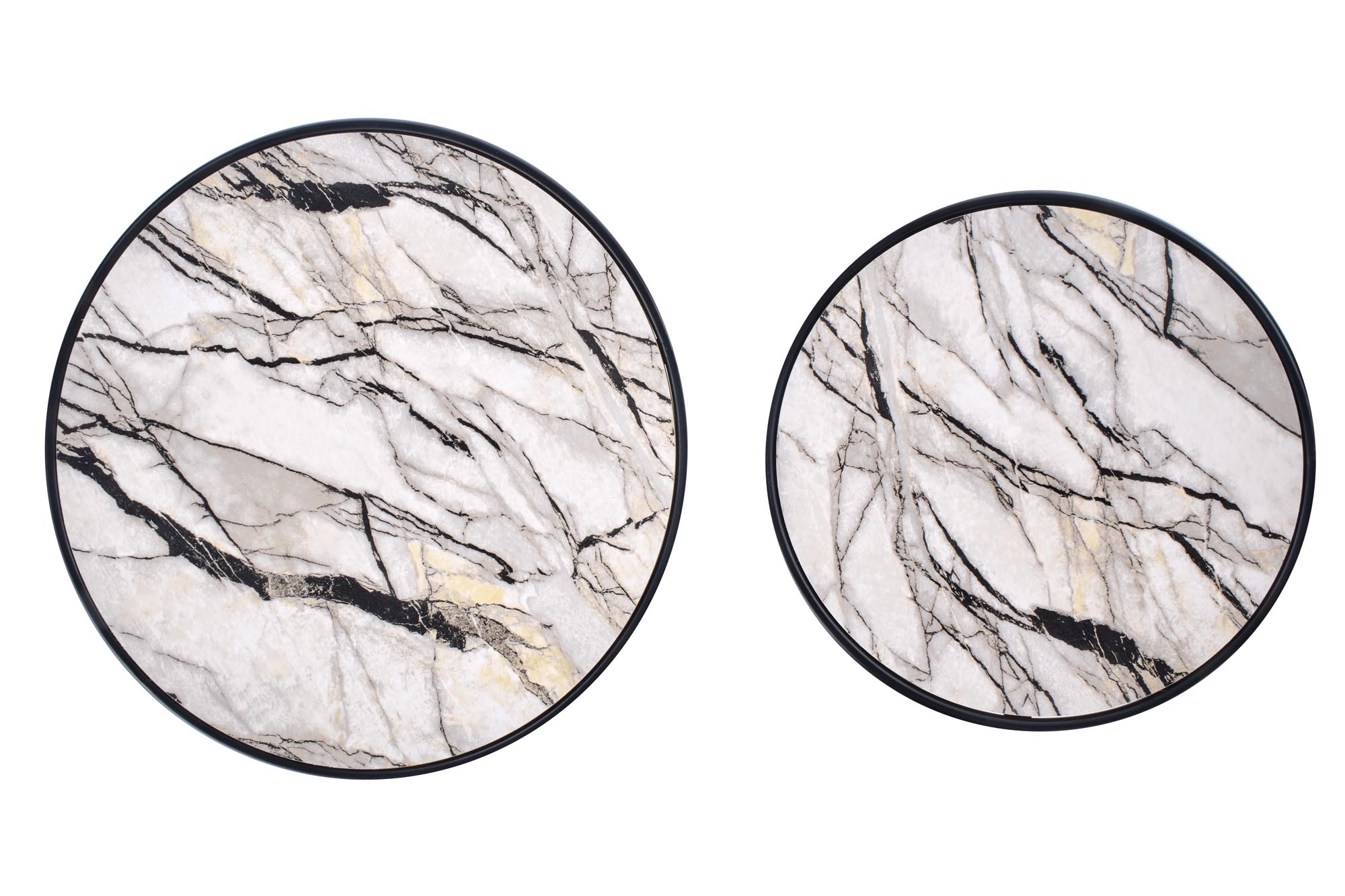 set of 2 benches, dimensions: fi 40/35 cm and fi 50/39 cm, material: laminated MDF / powder coated steel, color: white marble – black