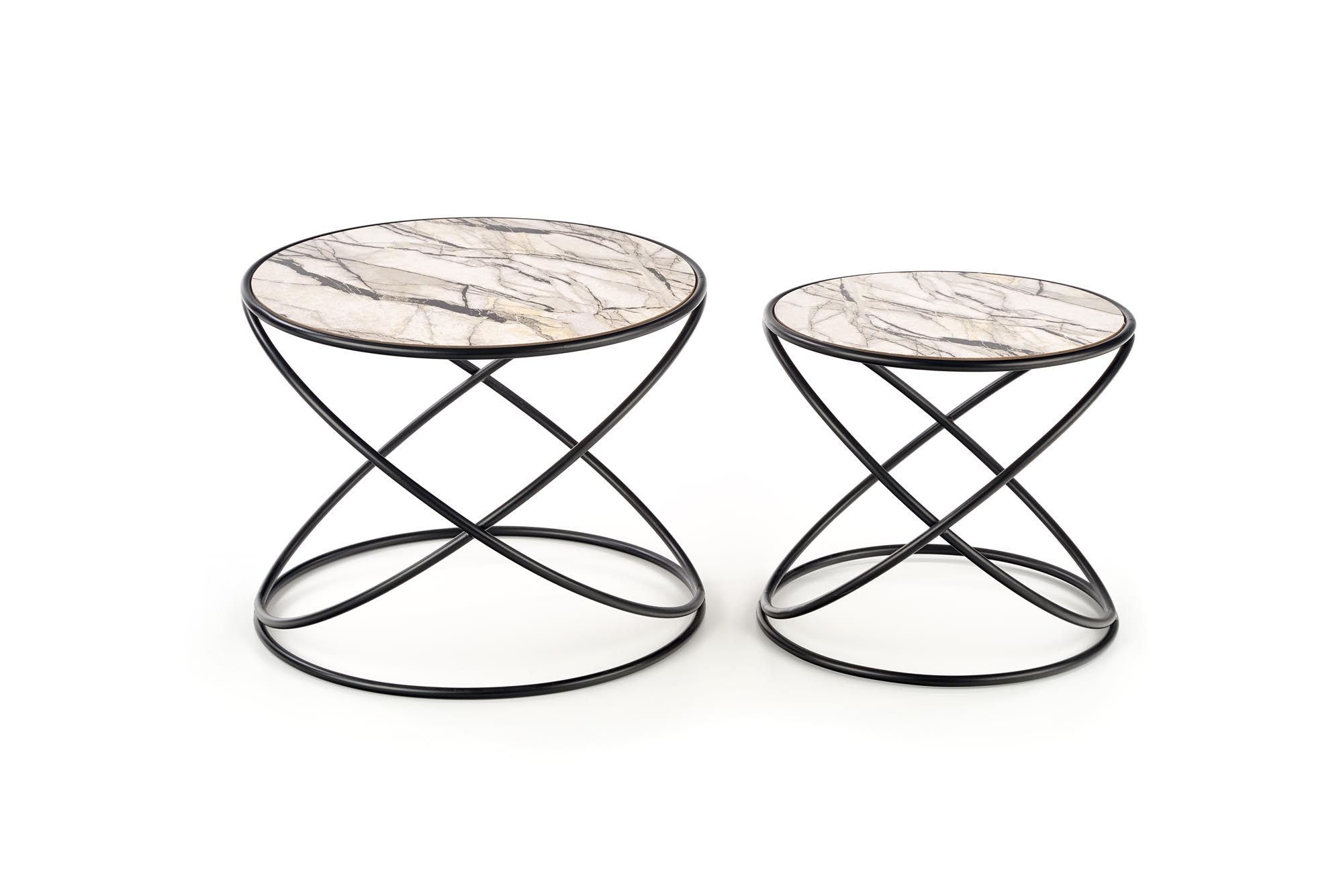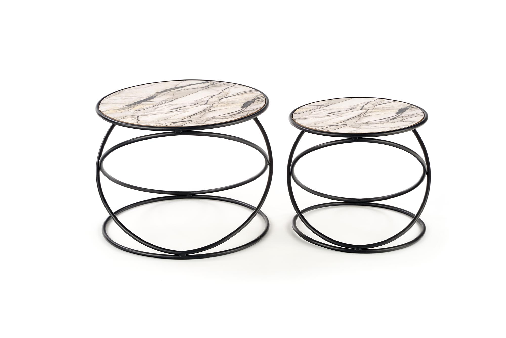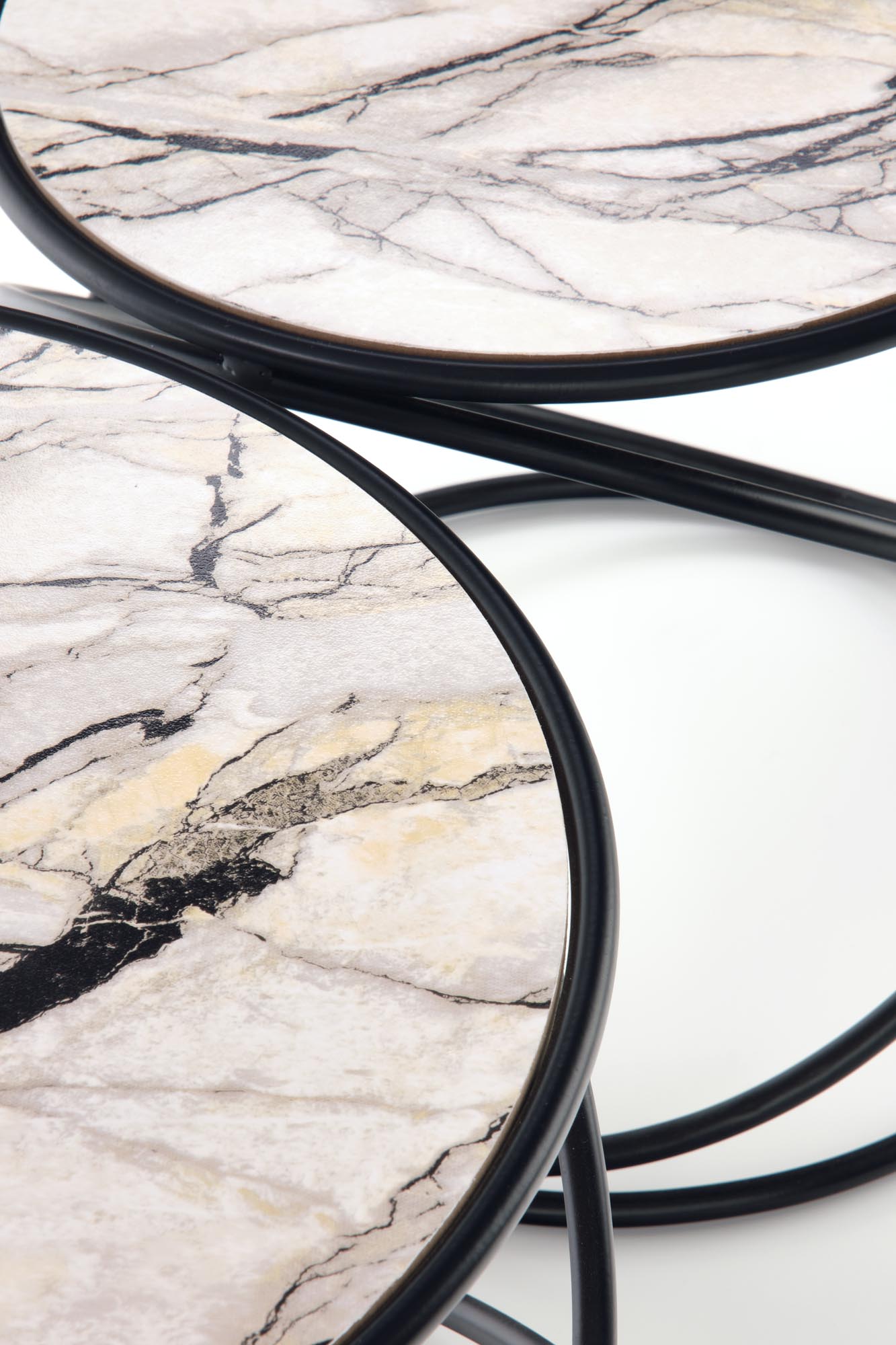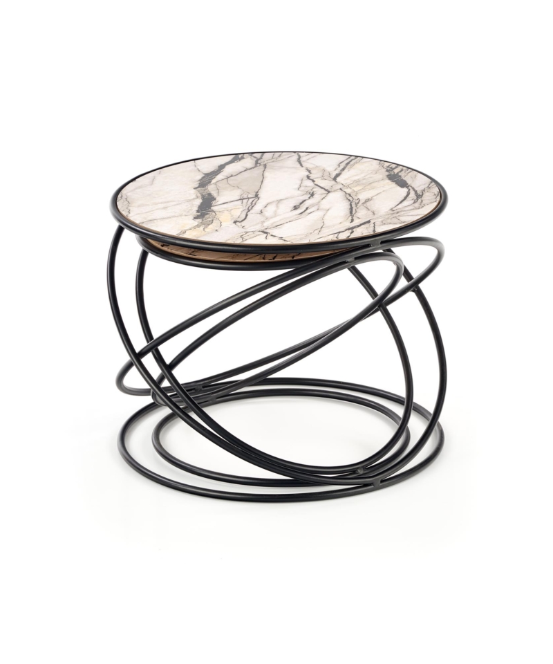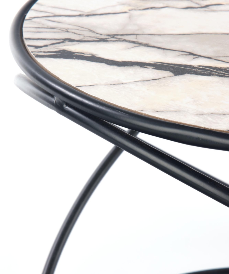 set of 2 benches, dimensions: fi 40/35 cm and fi 50/39 cm, material: laminated MDF / powder coated steel, color: white marble – black