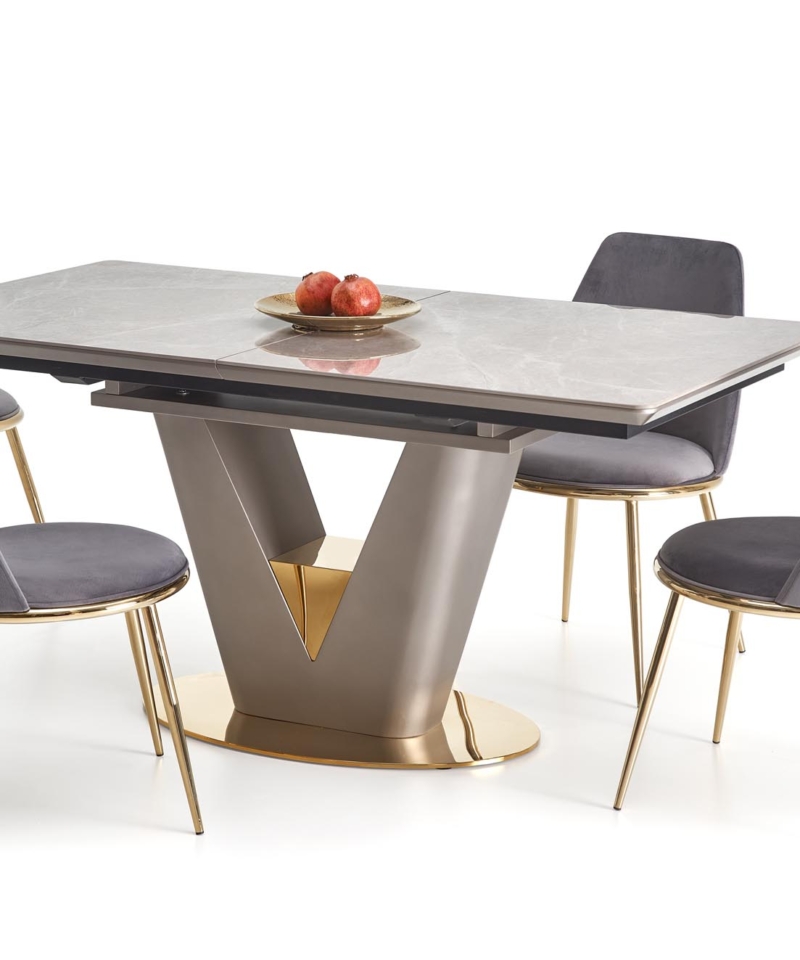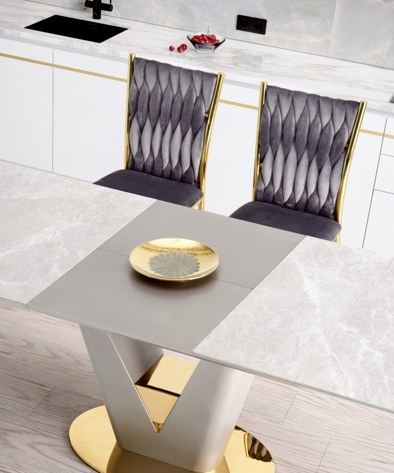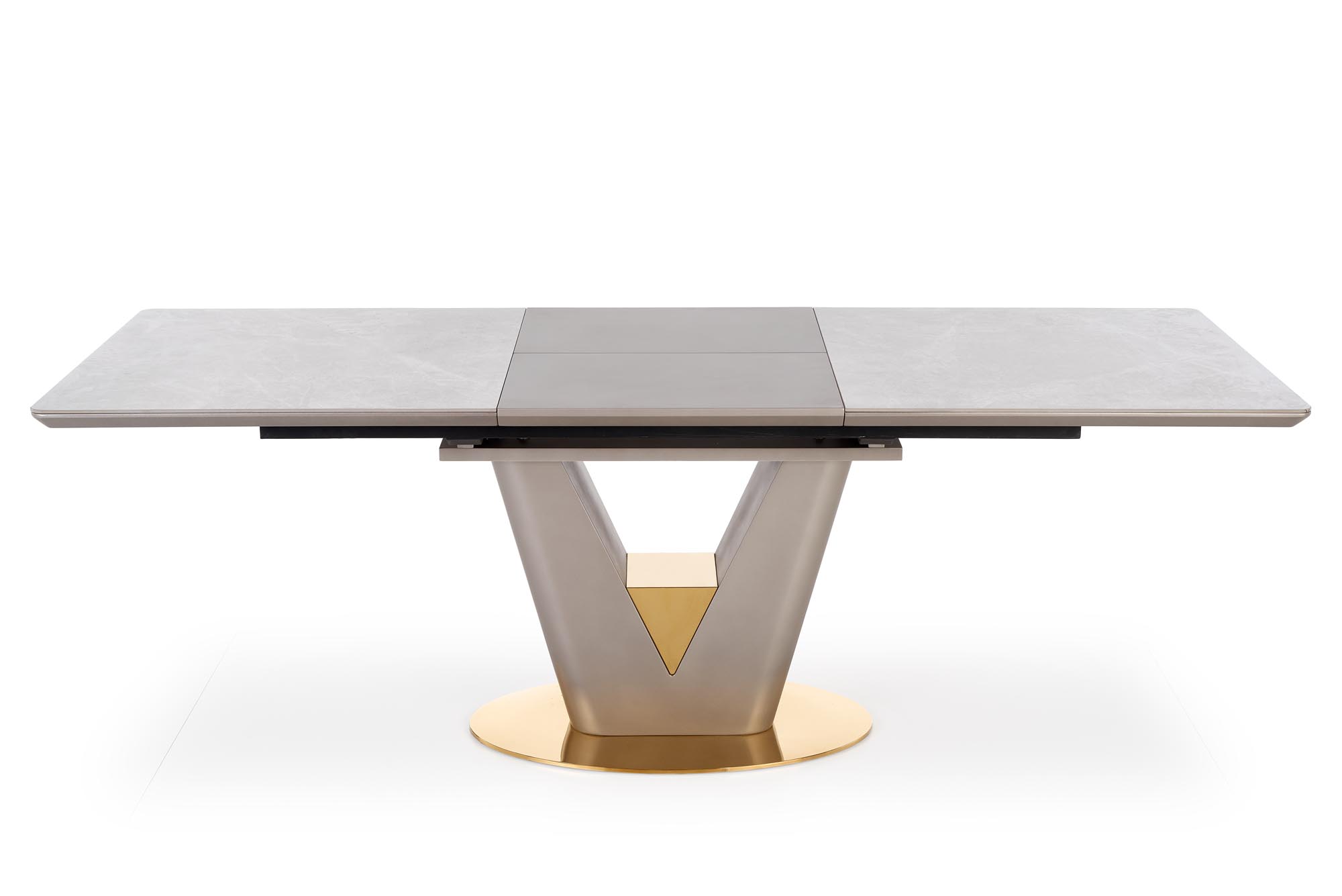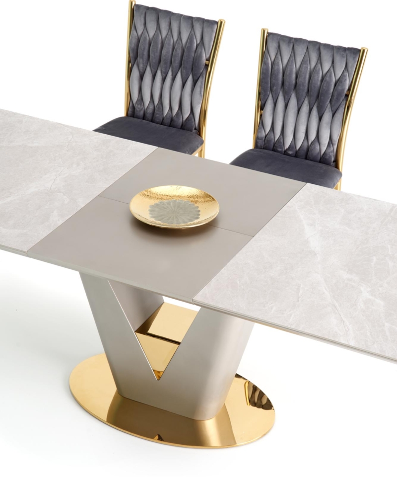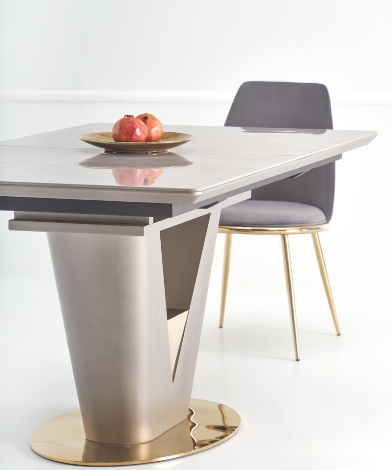 dimensions: 160-220/90/76 cm, extension table, material: ceramic / lacquered MDF / chrome steel, color: top – grey marble, legs – light grey / gold