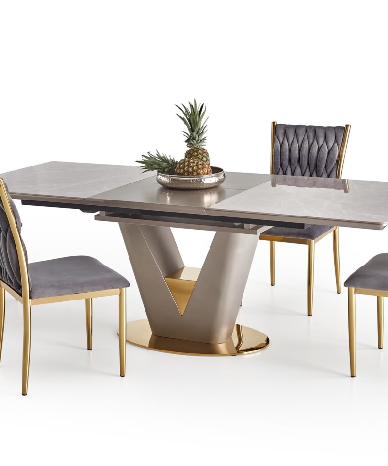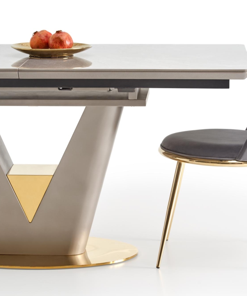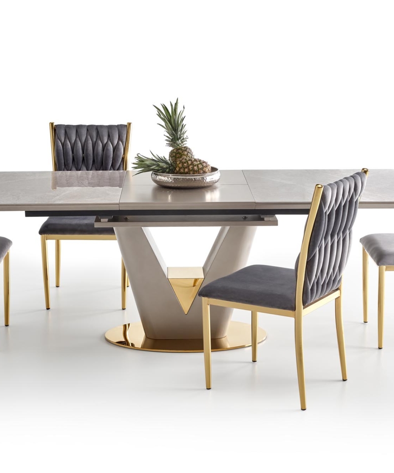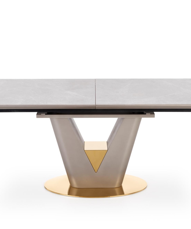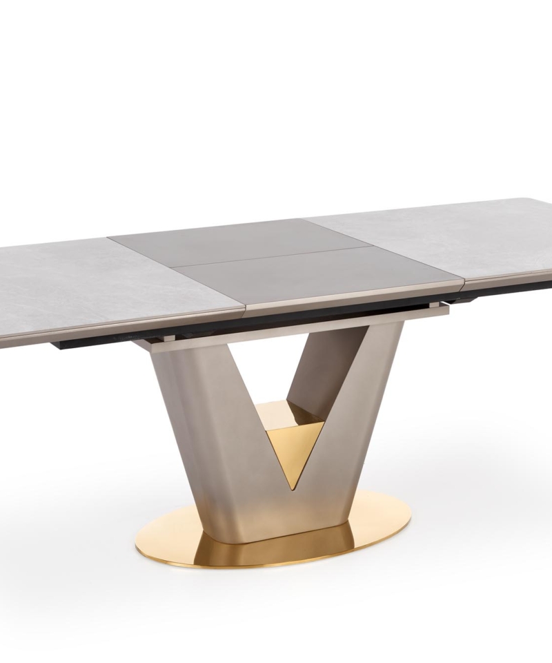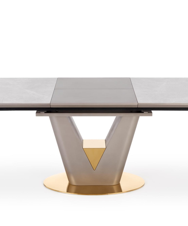 dimensions: 160-220/90/76 cm, extension table, material: ceramic / lacquered MDF / chrome steel, color: top – grey marble, legs – light grey / gold