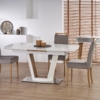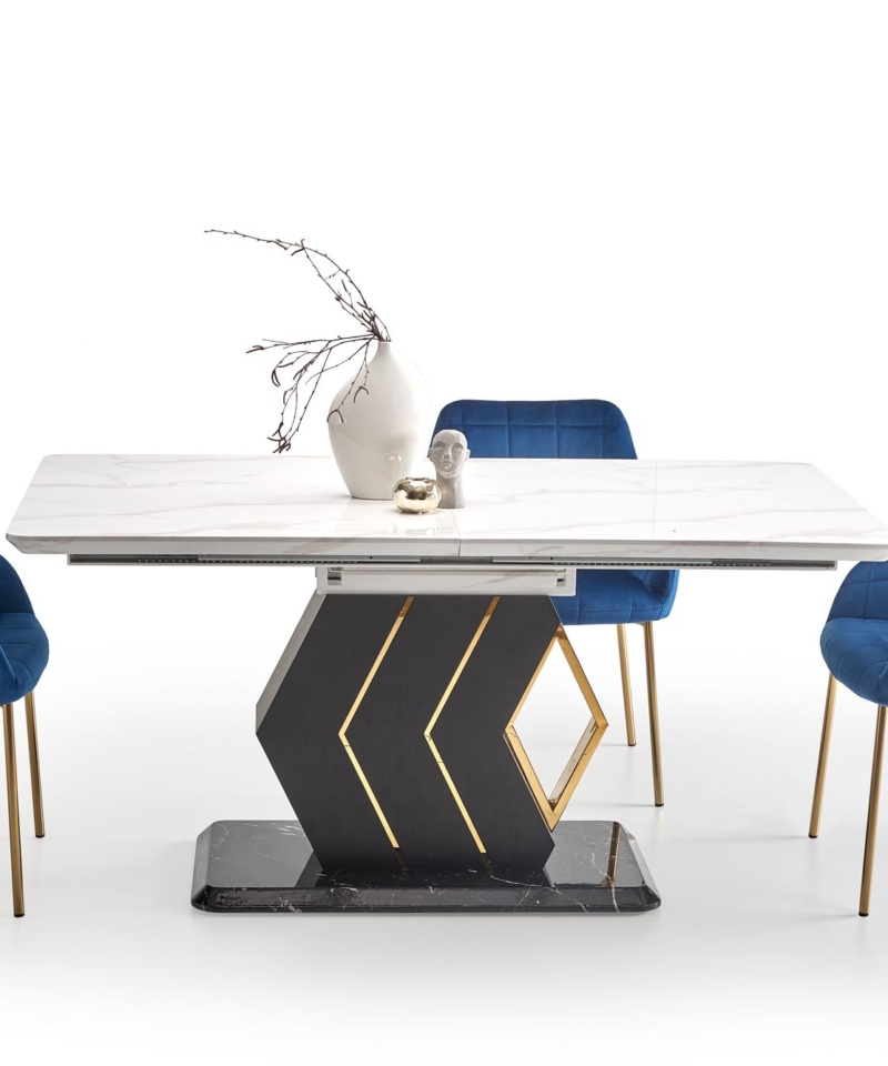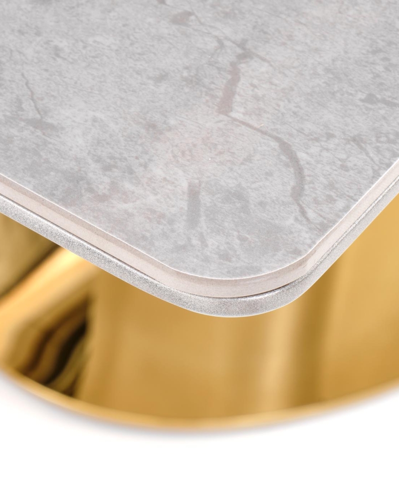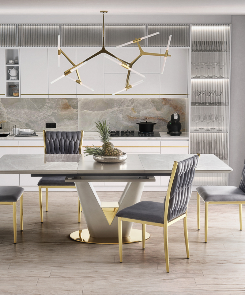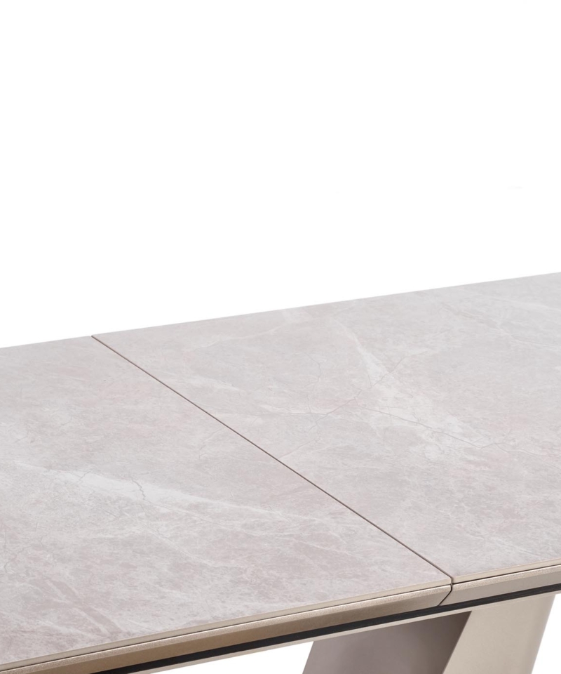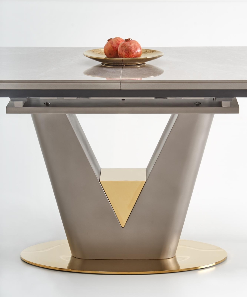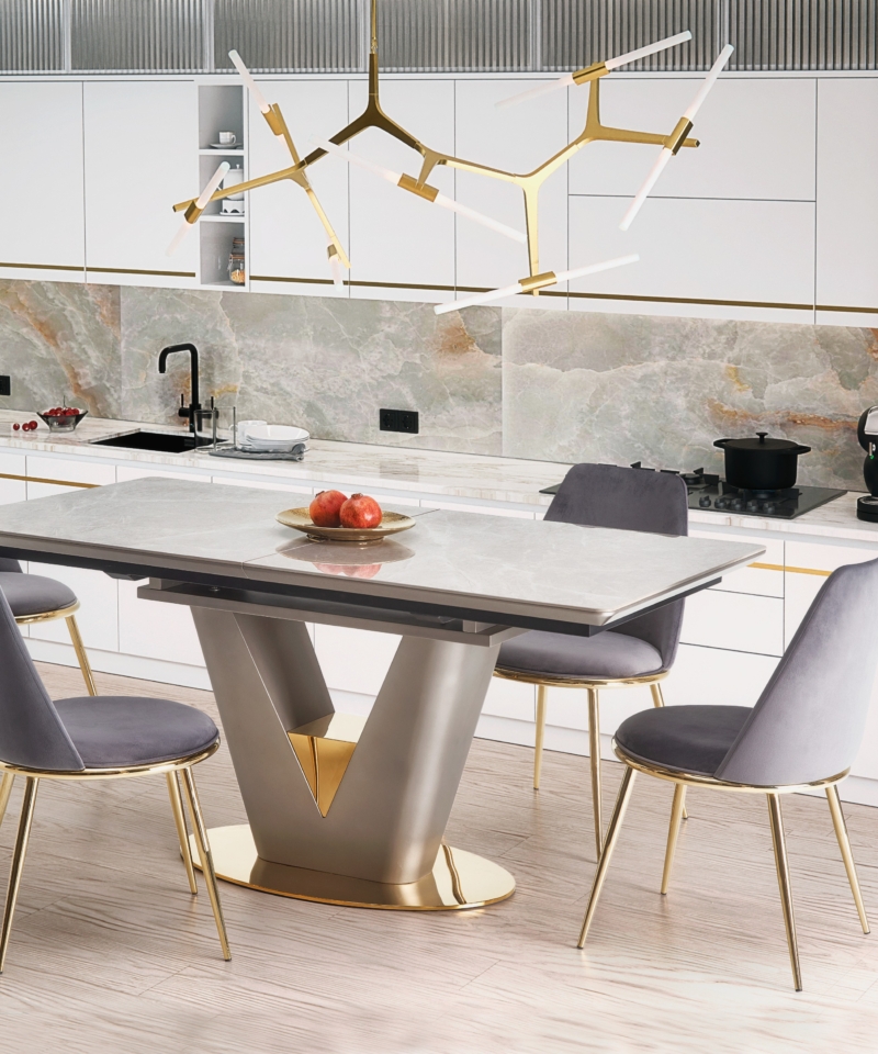 dimensions: 160-220/90/76 cm, extension table, material: ceramic / lacquered MDF / chrome steel, color: top – grey marble, legs – light grey / gold